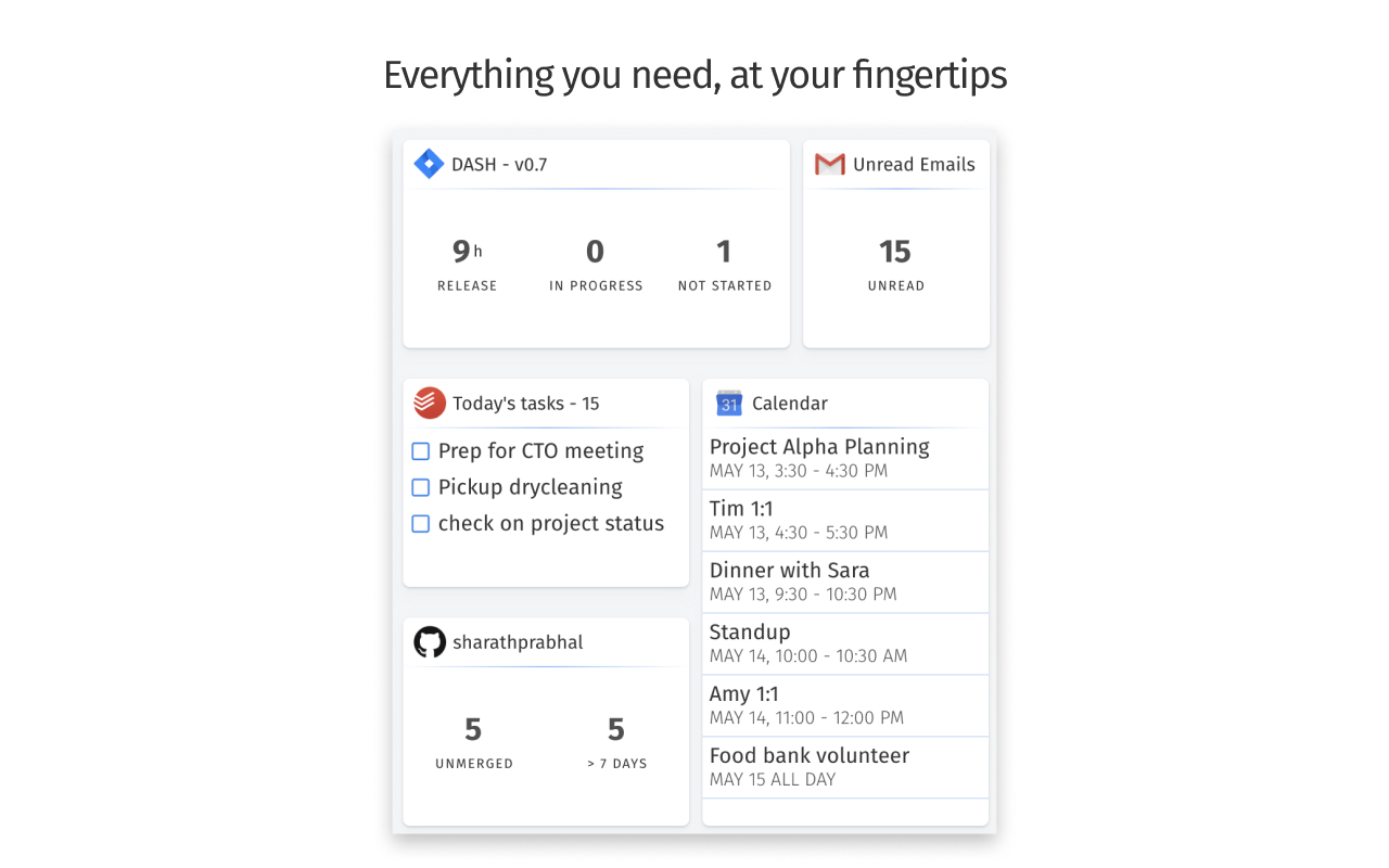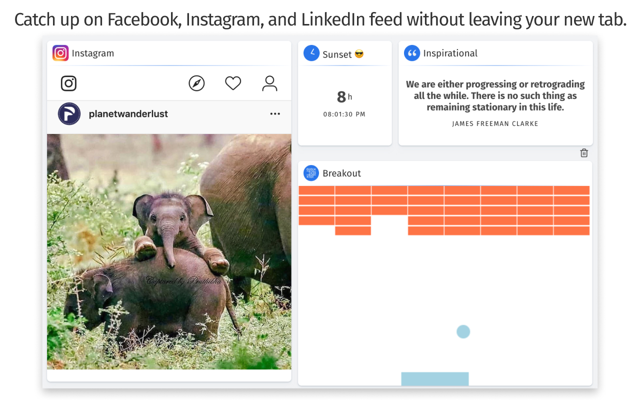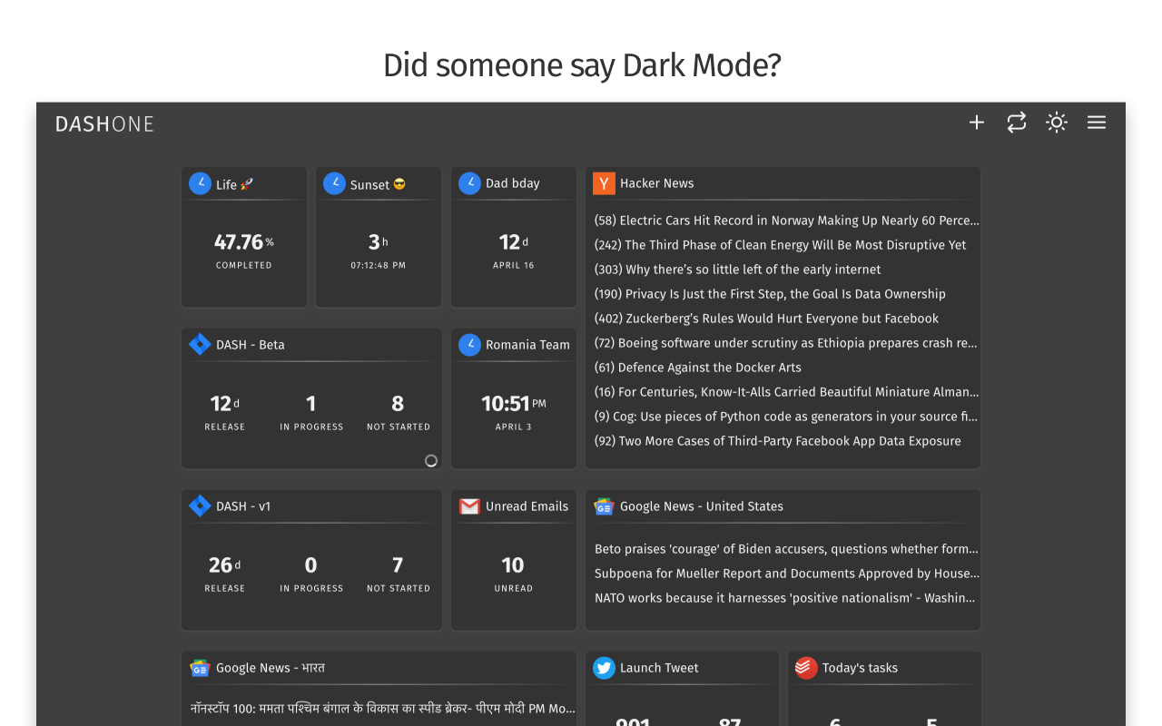 Supercharge your new tab with intelligent widgets and smart bookmarks. Supercharge your new tab page with intelligent widgets and smart bookmarks. "I love opening 100 tabs over and over to get info" - said no one ever "This new tab extension saves me 30-45 minutes every day. All the data I need without opening 100 tabs." - DashOne user Features + Live weather! + Stay up to date on what’s happening around you and elsewhere with news widgets from Google News, CNN, Reuters, NDTV, Times of India, HackerNews, TechCrunch, etc. + Speed Dial - Create a smart visual bookmark of your most visited sites + Search in DuckDuckGo, Bing, Google, Baidu, Yandex, and Yahoo directly in your new tab! + Inspirational Quotes + View your Facebook, Instagram, and LinkedIn feed without leaving your newtab + Beautiful images and funny GIF's + Recharge yourself with a quick game break + Stay on top your daily tasks with widgets from Gmail, Google Calendar, Outlook email & calendar, Todoist, etc. + Everything you need, loaded in under a second + No initial signup required - install to productivity in 20 seconds Here's a subset of our widgets * Weather * Quotes * Stock data * Sunrise/sunset time * Facebook feed * Instagram feed * LinkedIn feed * Google News * TechCrunch * HackerNews * Reuters News * CNN Business News * NDTV News * Times of India News * Timezone * Date countdown * Weekends count * Top Product Hunt posts * Gmail unread email count * Outlook/Office 365 unread email count * Todoist tasks * Twitter Tweet stats * Twitter Profile stats * Mailchimp subscriber stats * Github * Gitlab * Atlassian Jira * Any generic RSS feed * IndieHackers quote