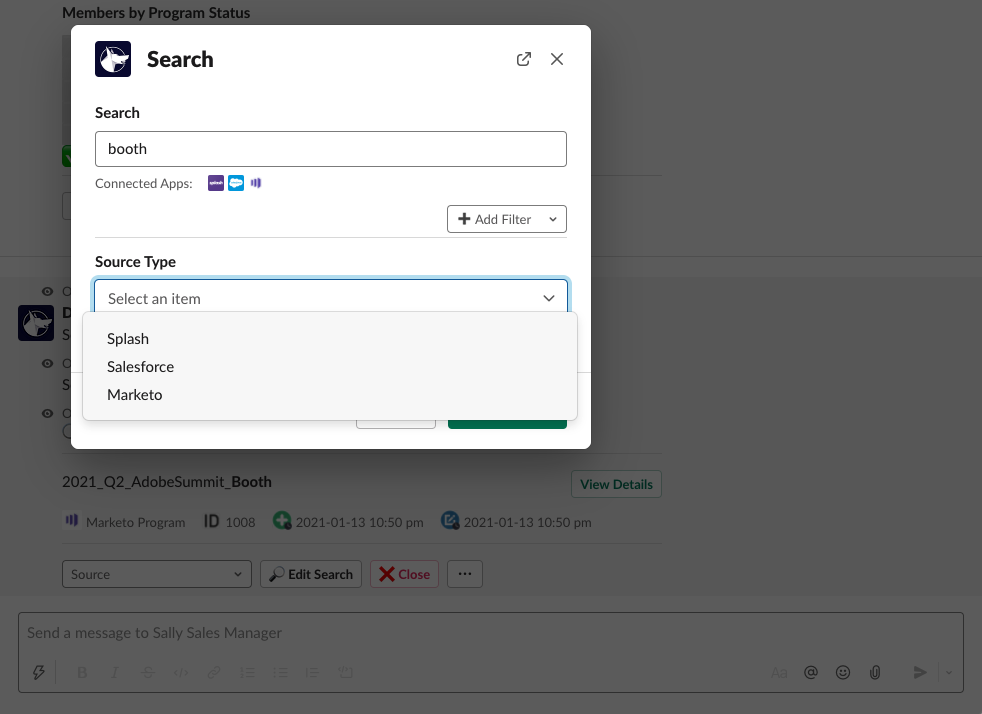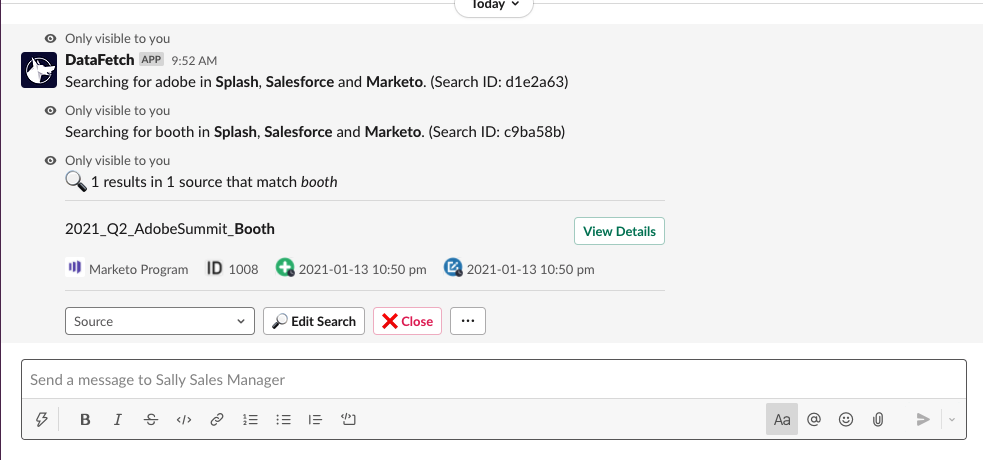 Bring Universal Search to Slack. We built DataFetch (https://www.datafetch.io/) to make company information searchable to those within your company. Save time by searching all your major systems - Salesforce, Pardot, Adobe Marketo Engage, Hubspot, Eventbrite, Splash, etc. - simply use the '/datafetch' command. - Drive adoption by searching all systems from 1 slash command - Advanced filters allow you to find results quickly - Share results directly within conversations and channels Existing connectors: - Salesforce: Campaigns, Leads, Contacts, Reports, and Opportunities - Pardot: Lists - Adobe Marketo: Programs and Leads - Hubspot: Contacts, Companies, and Deals - Eventbrite: Events - Splash: Events and Contacts - ON24: Events - Huminatix: Events - MailChimp: Campaigns and Members - Confluence - Google BigQuery - Amazon RedShift - PostgreSQL
