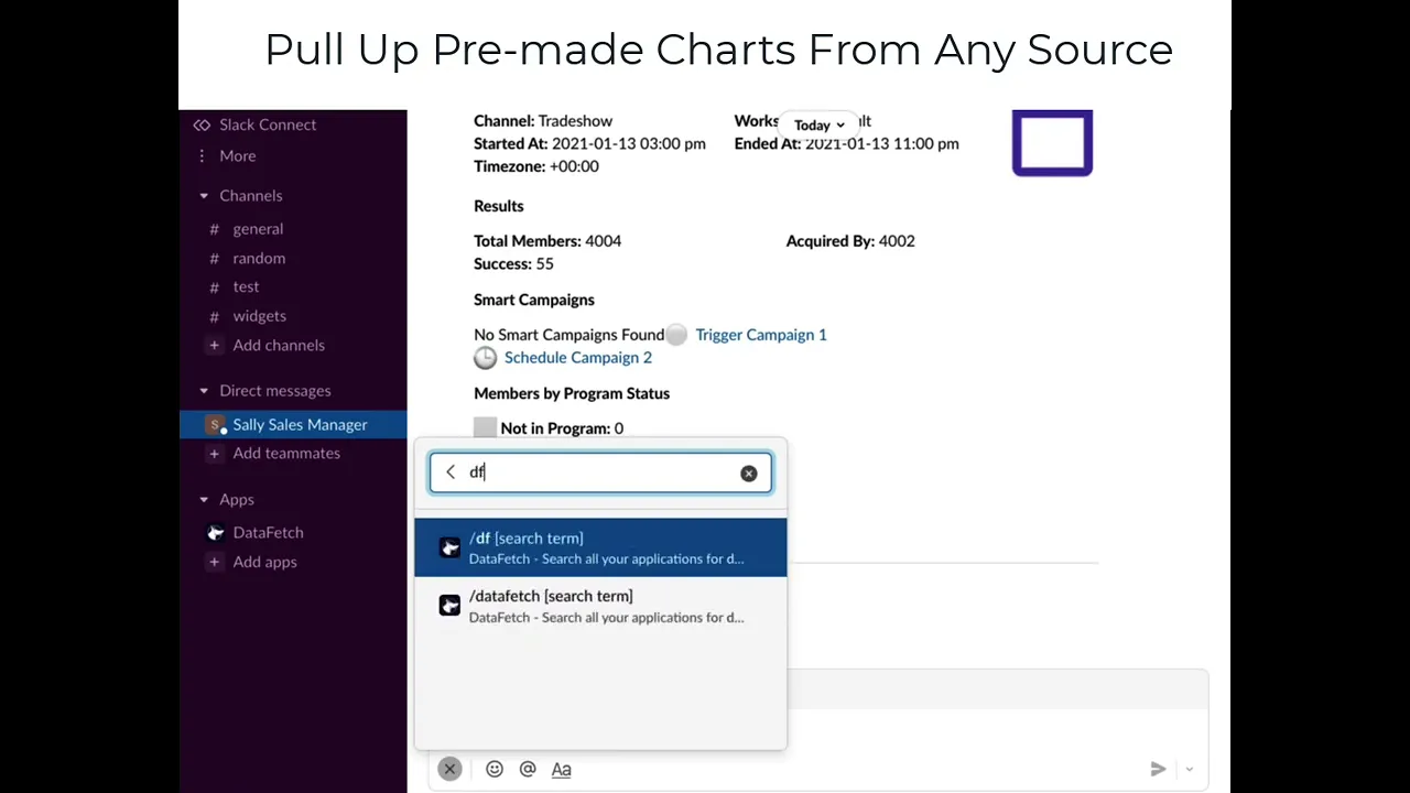 Finding the data you need through out the day take way too much time and effort. What if all the data trapped inside your applications and databases came to you when you wanted, rather than you having to hunt it down every time. DataFetch is an app for Slack & Microsoft Teams which makes it incredibly easy for even your least technical team members to access internal tools and analytics. Slack: Use the slash command '/df' to quickly search your applications and databases. Microsoft Teams: Use a single messaging extension to quickly search your applications and databases. Supported Data Sources: * Salesforce Sales Cloud * HubSpot * Adobe Marketo * Salesforce Pardot * Airtable * Amazon Redshift * Google BigQuery * PostgreSQL * MySQL * MailChimp * Eventbrite * Splash * Humanitix * Atlassian Confluence * Notion * Google Drive