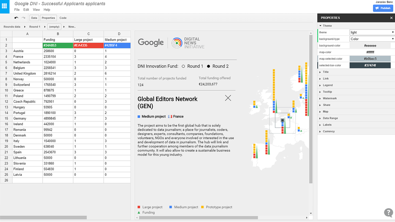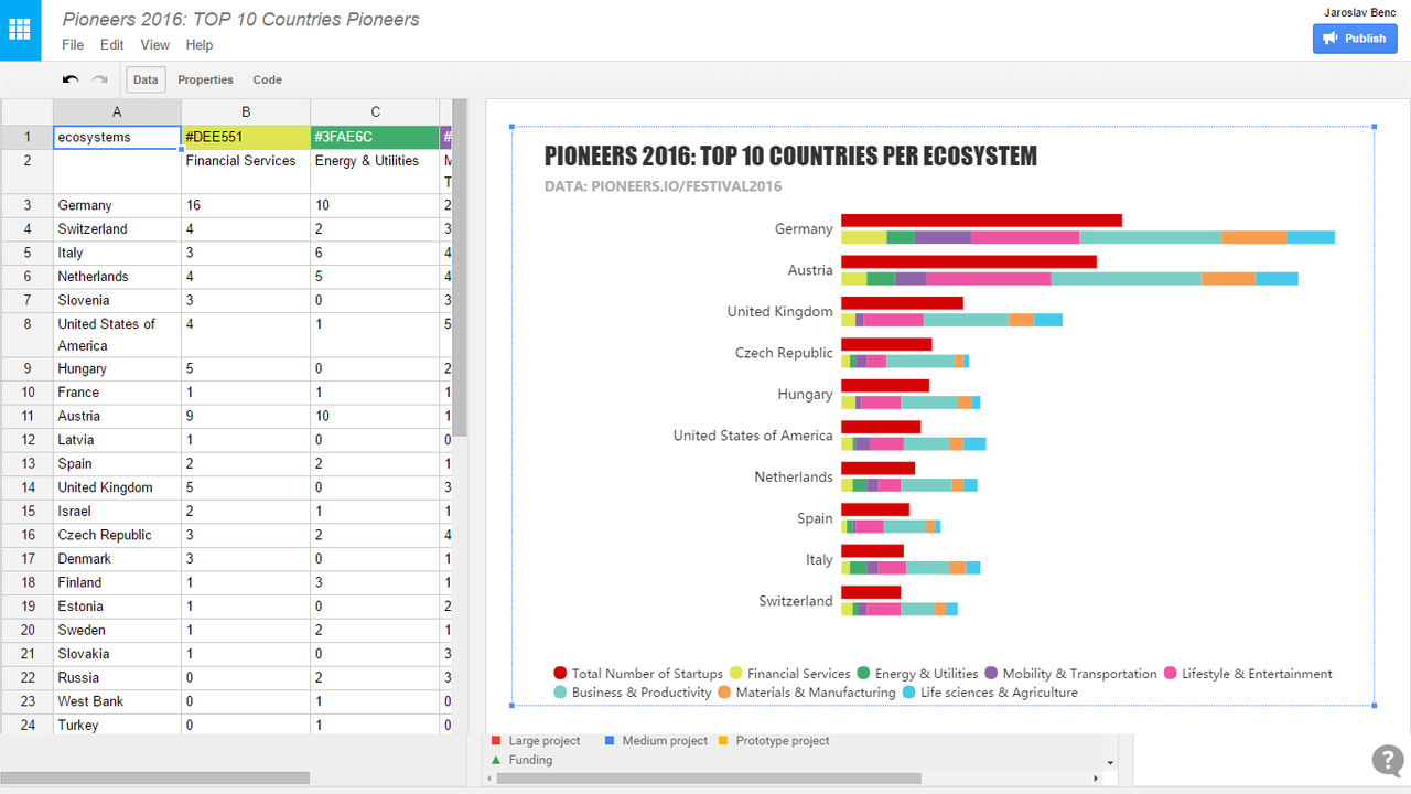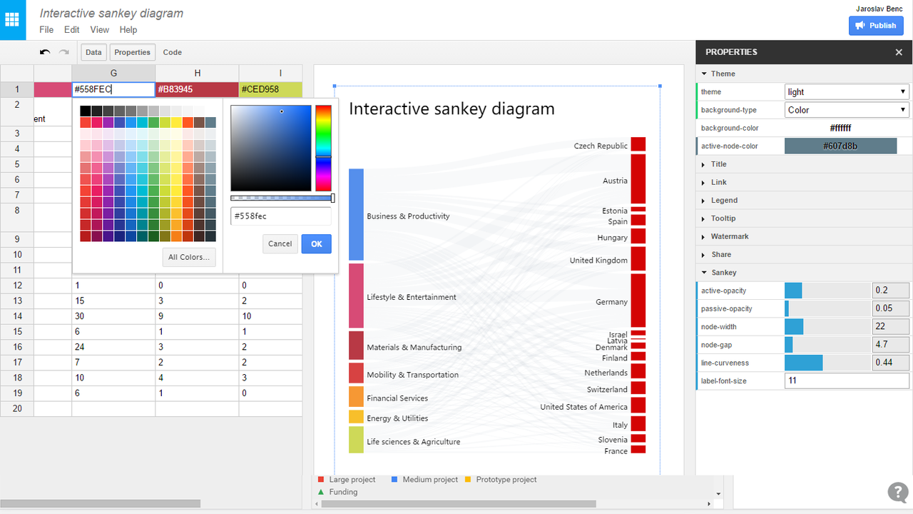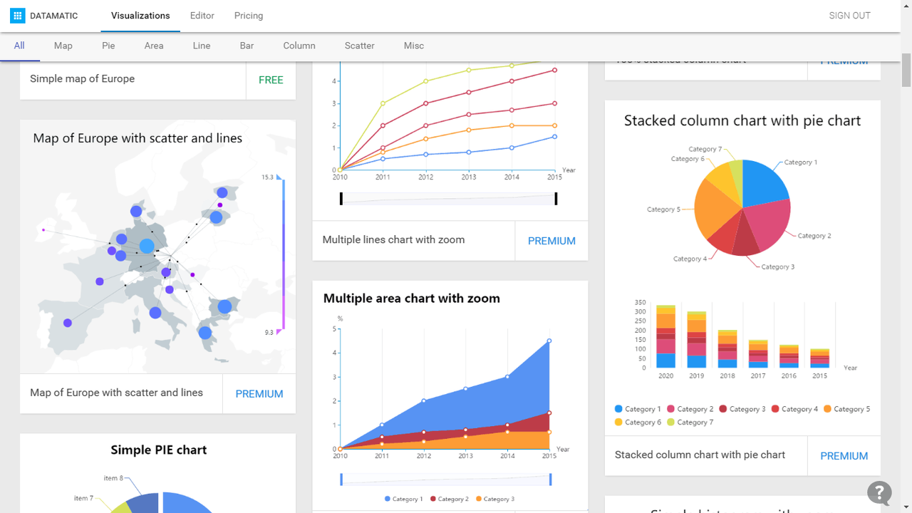 Editable data visualizations for the web. Datamatic.io is a new type of editor built on top of the amazing data visualization library d3.js. Anyone can create complex, interactive and beautiful data-driven documents as easily as if they were using an Excel file with a dash of Power Point. This beta preview gives you: - 9 templates based on awesome D3 samples - 36 color palettes brewed by colorbrewer2.org - real-time collaborative editing experience powered by Google Drive API - colorful triangle backgrounds based on Trianglify - data editor optimized for editing tree data structures - export to SVG/PNG - everything stored privately and securely on your Google Drive