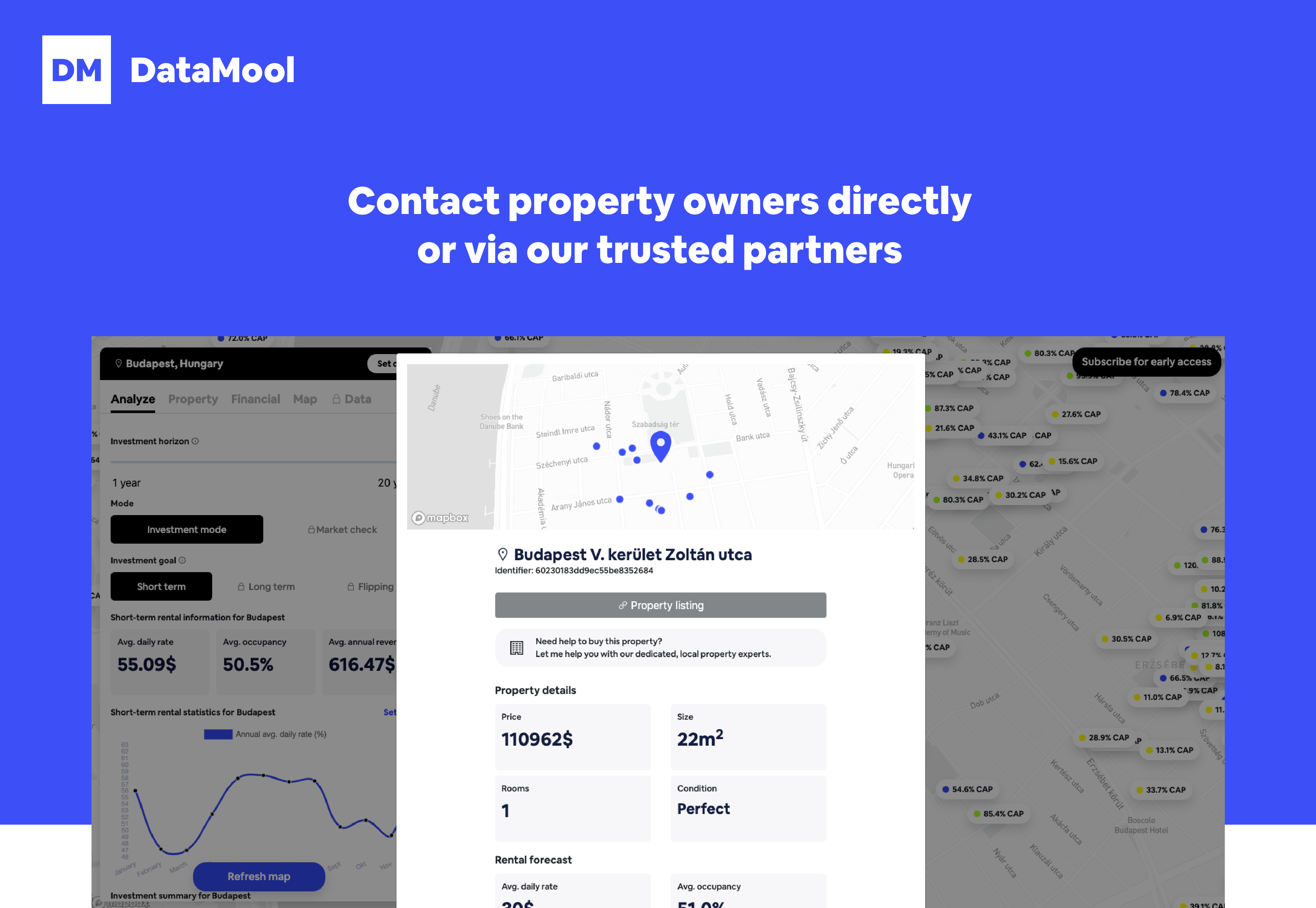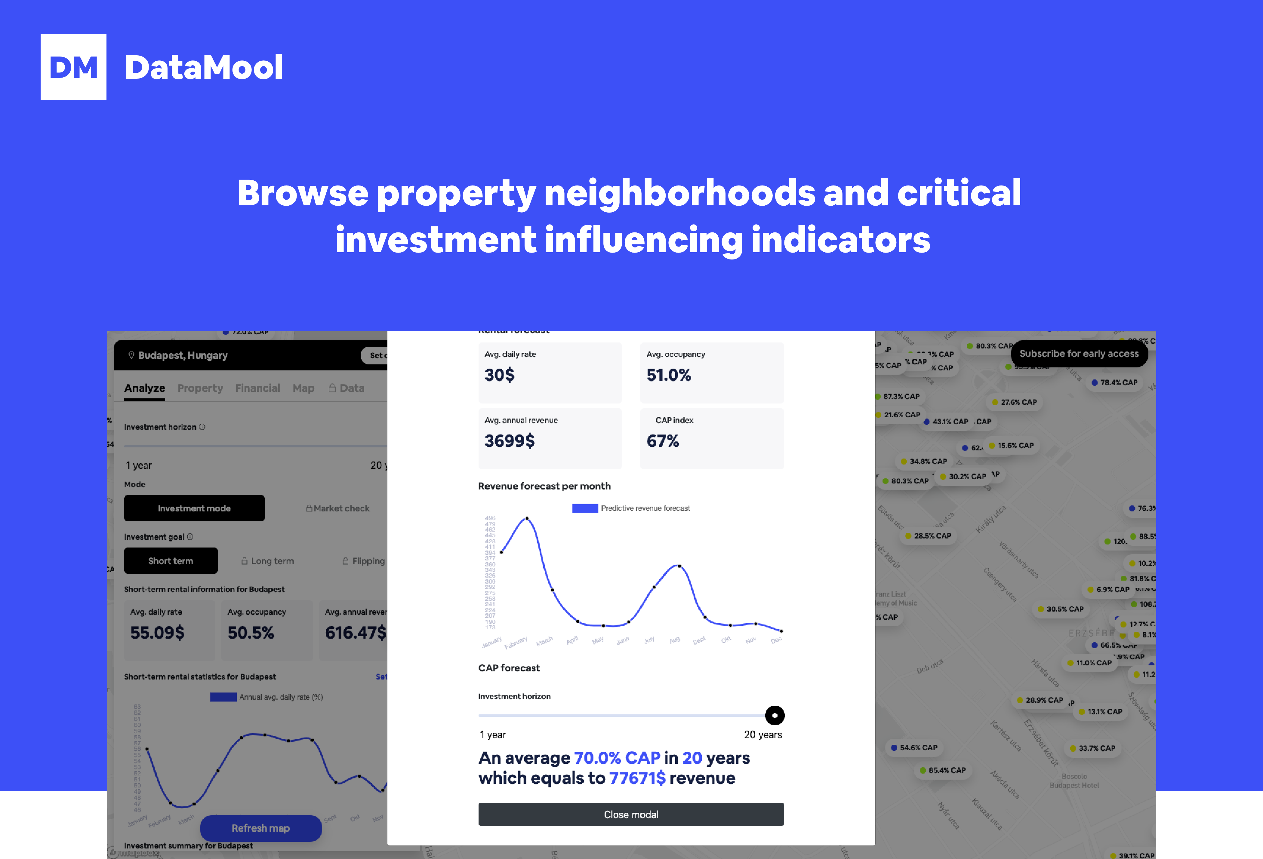 Hello hunters! I'm Mark, one of the founders of DataMool. ? ? ? ? We're excited to announce the launch of our early access program, which allows you to unlock the power of our predictive residential property investment tool as soon as possible. It's been quite a year for our team in terms of finishing up our beloved project after spending more than ten years in the field of real estate, data, and GIS. Our database already has 530 cities and regions mapped. We add 60 cities & areas every week, so whether you're an amateur real estate investor, a professional, a prop-tech, or a data nerd, we've got something for every use case. How can DataMool help you: • Browse & analyze investment opportunities in more than 530 residential property markets worldwide (we add 60 cities every week) • Browse & analyze short-term, long-term, and "flipping" investment opportunities with CAP forecasts • Browse property neighborhoods and critical investment influencing indicators • Contact property owners directly or via our trusted partners • Browse key market trends via our portal or our API You are our perfect match if you are: • A real estate investor (amateur or professional) • A prop-tech company (real estate agent/listing site) • A realtor • A data scientist/developer focusing on the prop-tech industry • Running lodging services We can't wait to see what do you think of DataMool, which we believe to be pretty unique in that space. The team and I will be hanging out here today, so if you have questions, feedback, or thoughts, we're all ears. :) ? Thank you very much guys. Mark