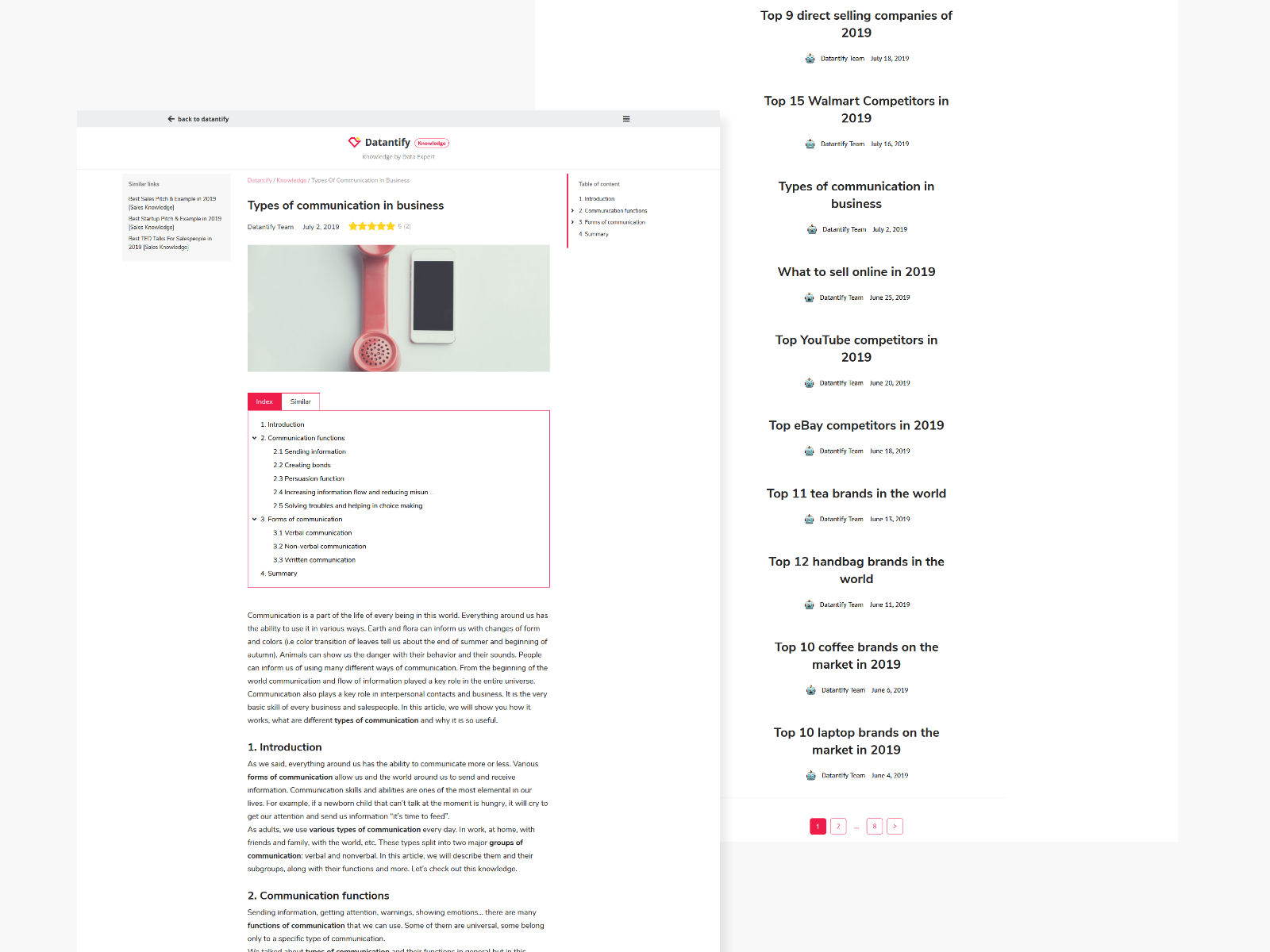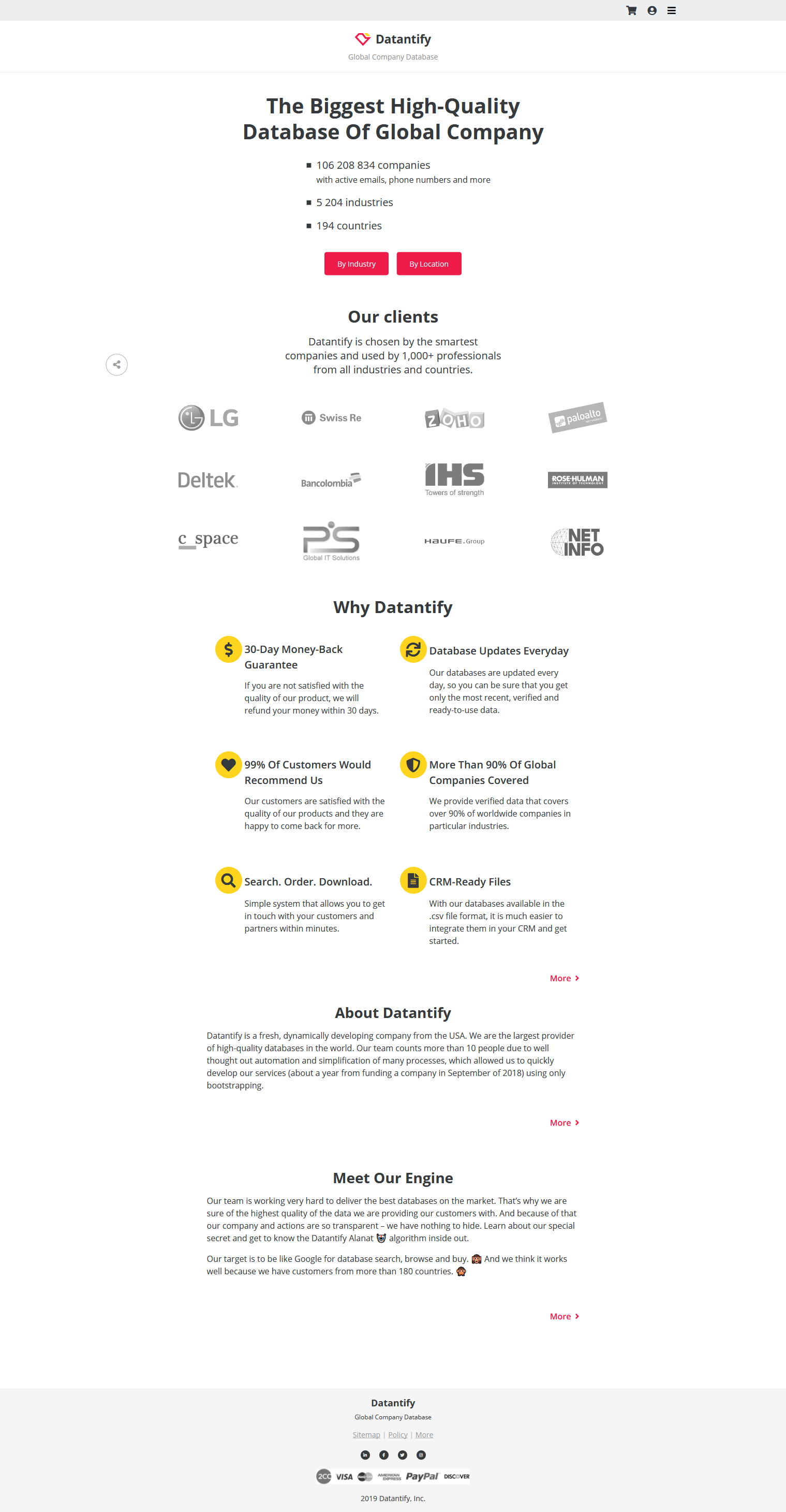 Datanify is the largest provider of high-quality company databases with a simple pricing model. We have access to over 100 million unique companies from all around the world. Our databases include over 4,500 categories and all 195 countries, divided into voivodeships, districts, cities and much more. The enterprise-class service that used to be reserved only for multi-million dollar companies is now available to all at affordable prices and without any contracts. Choose the best database for your business and pay once!
