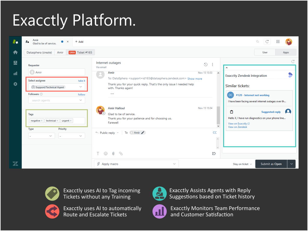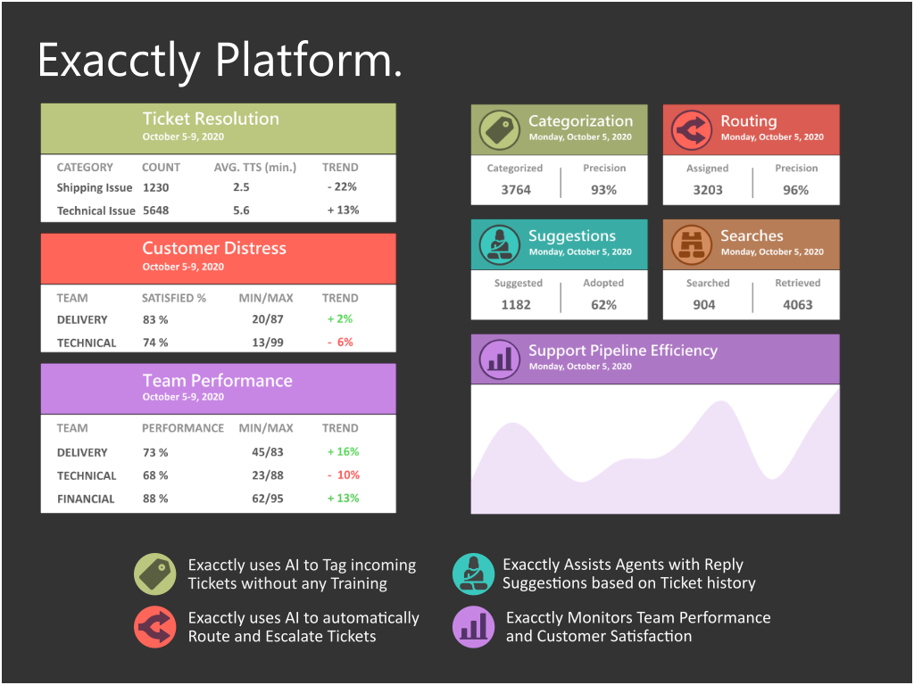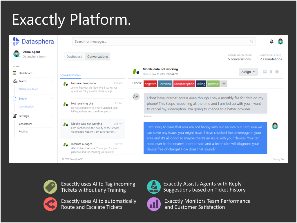 Customer support teams often miss the moment when customers become dissatisfied. They are generally overwhelmed by conversations that they are unable to qualify and monitor in real-time. They don't react immediately to customer distress since they make late escalation of customer complaints and delayed collection of customer satisfaction metrics. Datasphera builds Exacctly Platform to monitor conversations between customers and support agents and detect situations (like urgency, requests, dissatisfaction,...) and emotions (like happiness, anger, distress,...). It enables service teams to quantify customer satisfaction and offer real-time actions (Automated alerts on critical issues, ticket escalation, agent assistance to reply).
