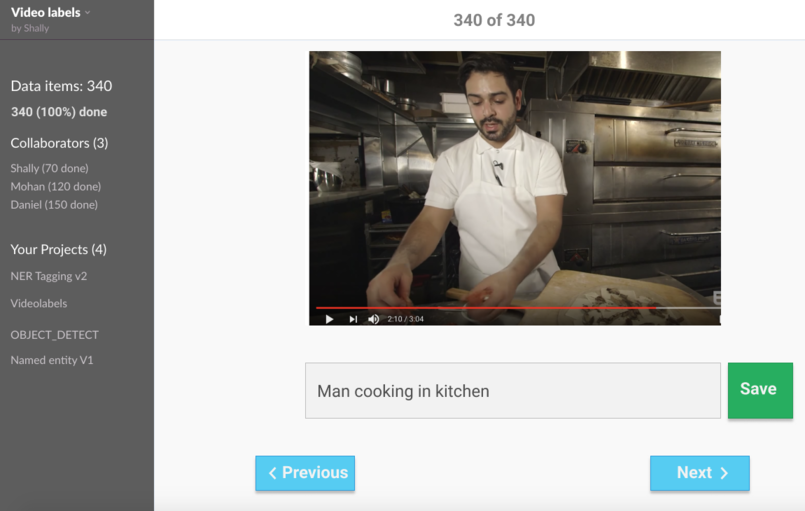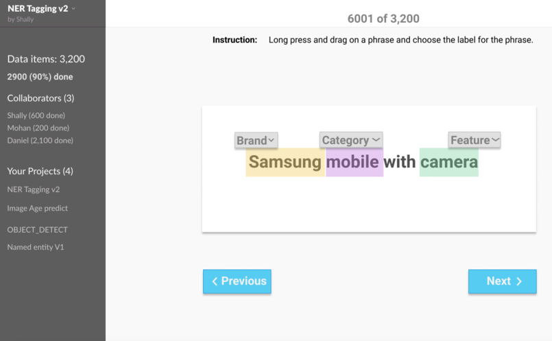 Just upload data, invite your team and build training/evaluation dataset in hours. Pre-build support for all data annotation needs like image labeling, NLP tagging, classification etc. Annotate all your data: Text, Image, Video, or Speech. No more ad-hoc setups, or passing around excel sheets.