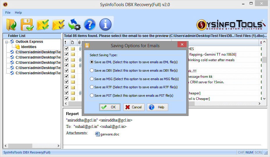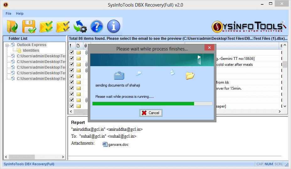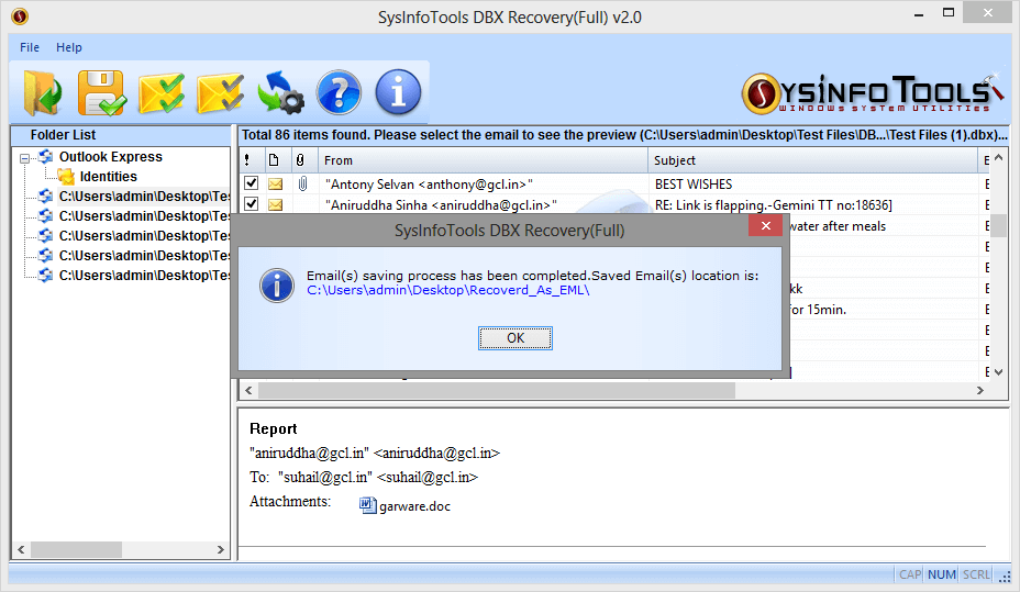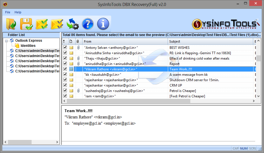 SysInfo DBX Recovery tool is highly efficient and powerful tool that enable user to recover his or her important emails easily from corrupt or damaged Outlook Express DBX files. The main task of DBX Recovery tool from SysInfo is to restore the out of order DBX files that are unable to read by Outlook Express and when a range of other programs are not capable of restoring the information contained in these files. Outlook Express DBX Recovery tool from SysInfo is a award winning tools, it does not modify the existing DBX file, it only read the damaged or corrupt DBX files and restore the information present in the damaged or corrupt DBX file into repaired/recovered DBX files preserving the original files and folders structure. It can also recover recently deleted or accidentally deleted Outlook Express emails. Outlook Express DBX Recovery tool from SysInfo runs smoothly on all major versions of Windows including Windows 98, ME, 2000, 2003, NT, XP, Vista and Windows 7.