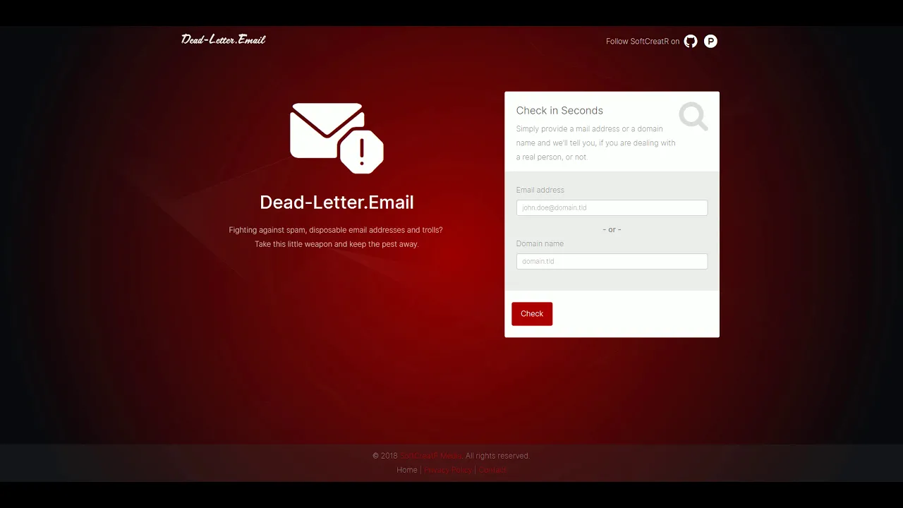 Dead-Letter.Email is a website / PWA that allows you to detect disposable email addresses in no time. Simply provide a mail address or a domain name and we will tell you, if you are dealing with a disposable email address, or not. Developers can use our free, daily database dump to build their own checks. To do so, check out https://git.io/fhK4f.