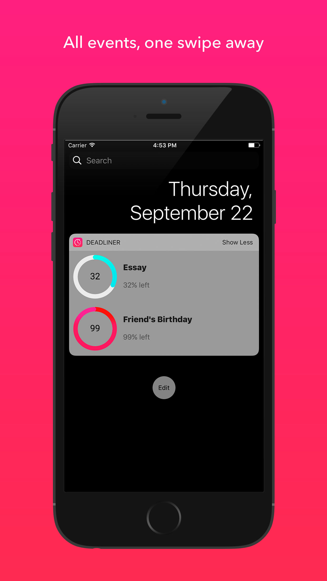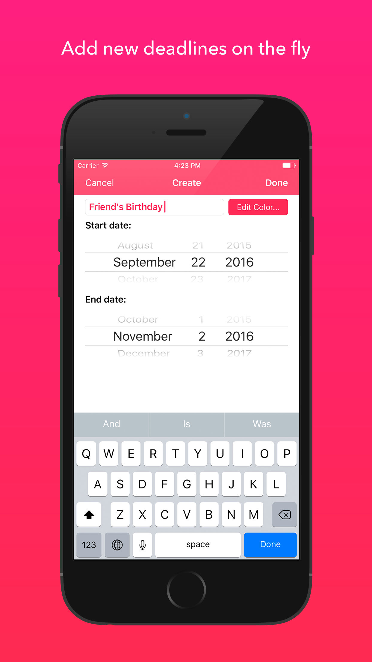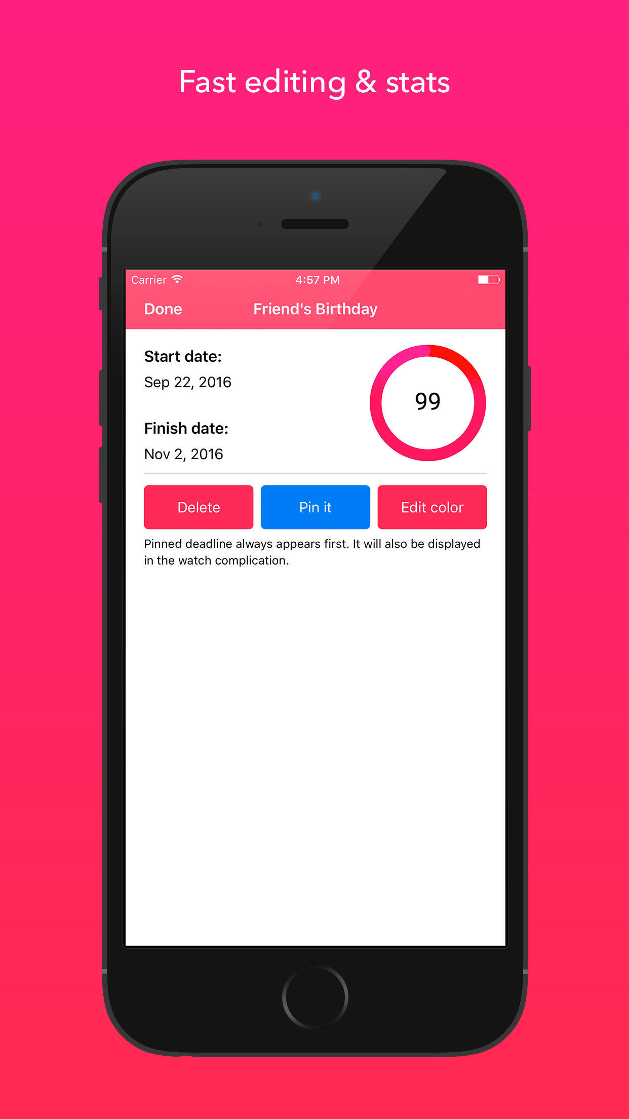 Deadliner is a mobile application which was created to help people with busy schedules (for example, university students and office workers) track and control their deadlines by providing a unique approach of visual progress tracking. The app is available on the App Store for free. Deadlines sync seamlessly via iCloud and can be instantly shared with other people. Deadliner also supports iMessage to make this process even easier. Deadliner reminds the user when there is not much time left before the deadline using push notifications and aggregates all the info in the Today extension. Deadliner also has native Calendar app integration, to make planning even easier for those who use other planning apps as well. The world needs Deadliner, because it connects three main aspects of the work process: planning, progress tracking, and motivation. Only in combination they are able to make the work process truly productive for every person: from college student to office worker.
