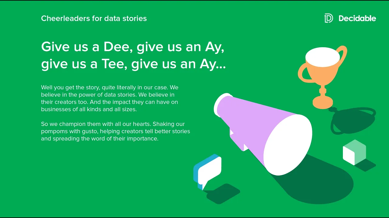 Decidable / A social data storytelling platform built to help analysts craft data stories in plain English which will actually get their insights read, discussed and acted upon. Helping to eradicate the employee data adoption gap, unlike any other BI and analytics solutions that produce dashboards, tables and graphs that still require interpretation.