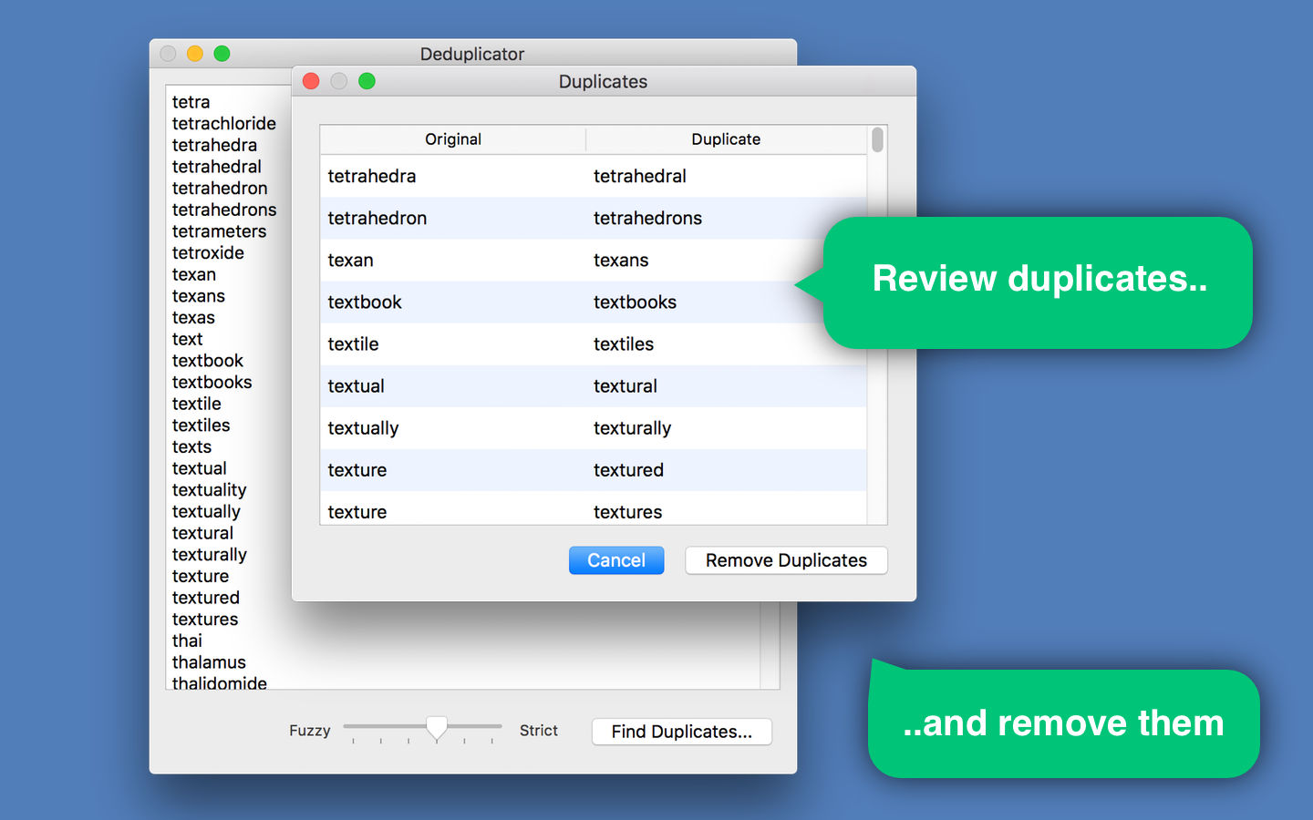 Deduplicator removes duplicates from a list. Simply paste your list into Deduplicator and hit ‘Find Duplicates’. Deduplicator will identify duplicate items and show them in a preview window. Hit ‘Remove Duplicates’ to proceed. Your list has now been deduplicated and contains only unique elements. To account for variation in capitalisation and spelling, you may wish to use fuzzy matching. Moving the fuzziness slider one notch towards ‘fuzzy’ will result in a case-insensitive comparison – e.g. ‘DAVE’ will be treated as a duplicate of ‘Dave’. Moving the slider another notch towards ‘fuzzy’ will result in a spelling-insensitive comparison – e.g. ‘Jenni’ will be treated as a duplicate of ‘Jenny’. Moving the slider all the way towards ‘fuzzy’ will greatly reduce the strictness of the matching algorithm – e.g. ‘Bob’ will be treated as a duplicate of ‘Bobby’. With some experimentation on the range between ‘strict’ and ‘fuzzy’, the operator should find a satisfactory level of deduplication.
