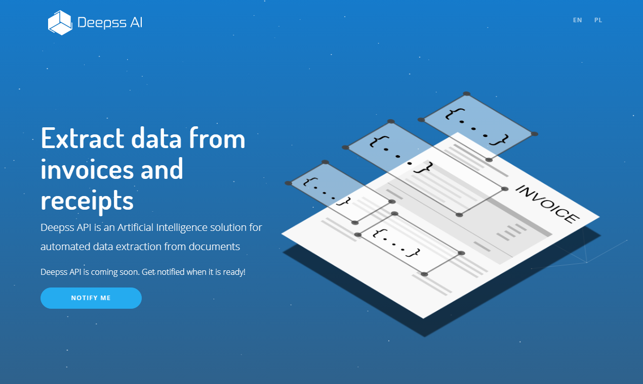 We are early-stage startup and we would be happy to hear feedback from you! Our product, Deepss API, is an Artificial Intelligence solution for automated data extraction from documents. If you are a developer or an user of systems like - ERP or inventory management system, - budget management system, - a digitalization of invoices or receipts (OCR), - or other similar solutions, we are sure that our product, Deepss API, would make your software even better. Consider a case when someone enters data from documents such as invoices or receipts, which is a manual process and takes a long time. 2-5 minutes per document is not much, but with 100 documents a day, it gives you several hours of manual input. And in case of mistake, finding the source of the problem can be expensive. Blurry scan? Manual notes? Attached bar codes? No problem :) In a few seconds you get the entire contents of the documents. There are many different types of invoice patterns. Deepss API learns on previously scanned documents and it adapts to new patterns very fast. Unlike a traditional OCR, it doesn't require templates.