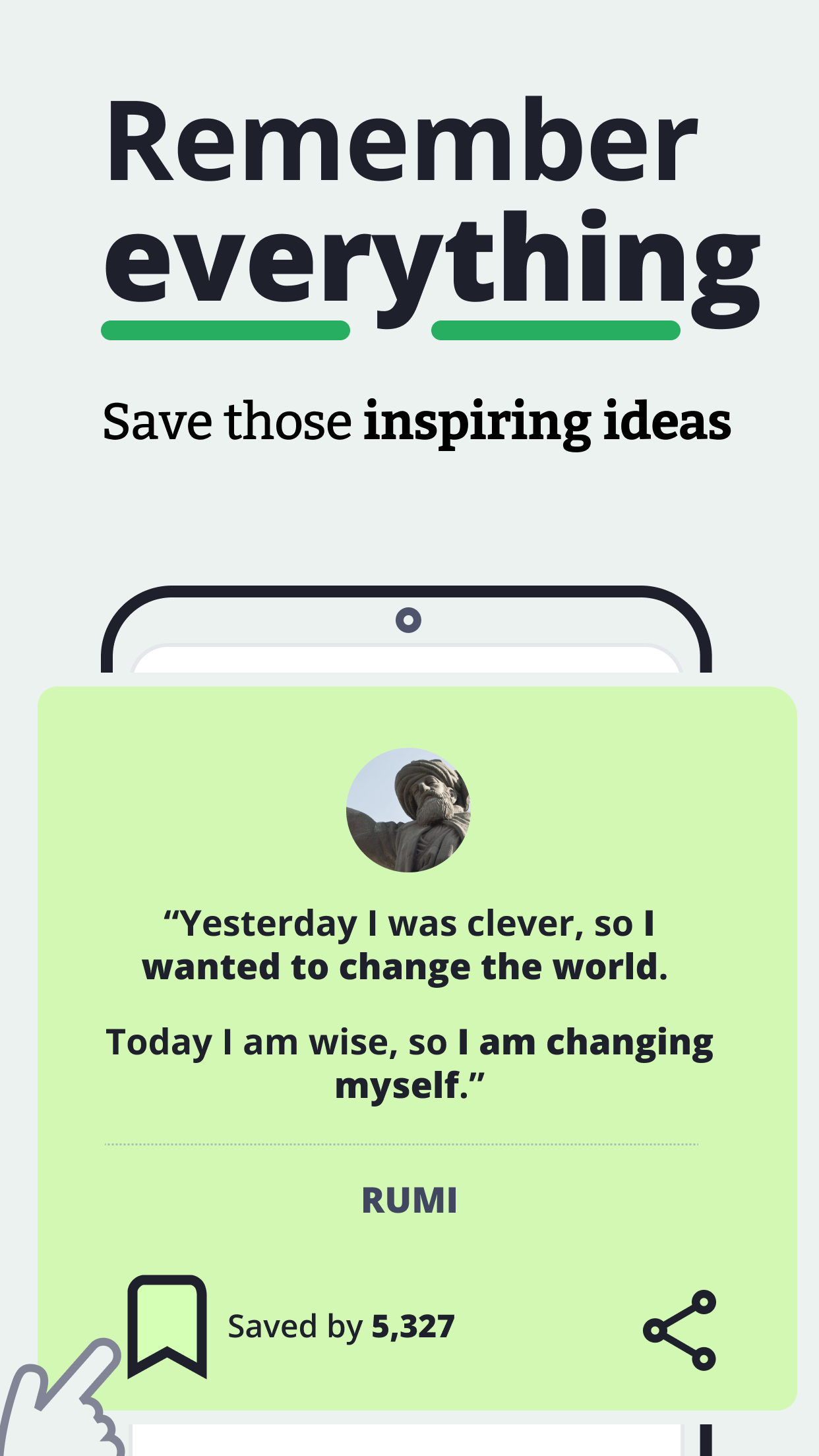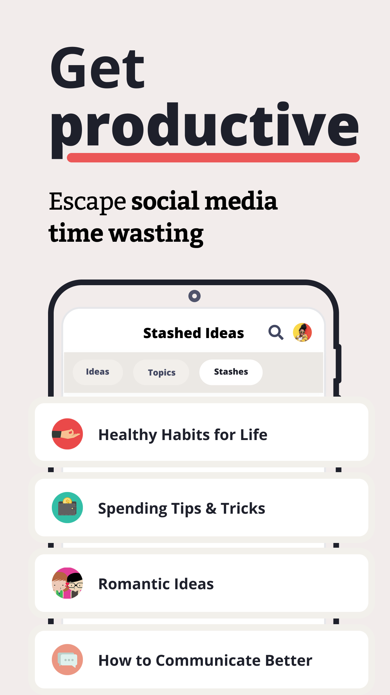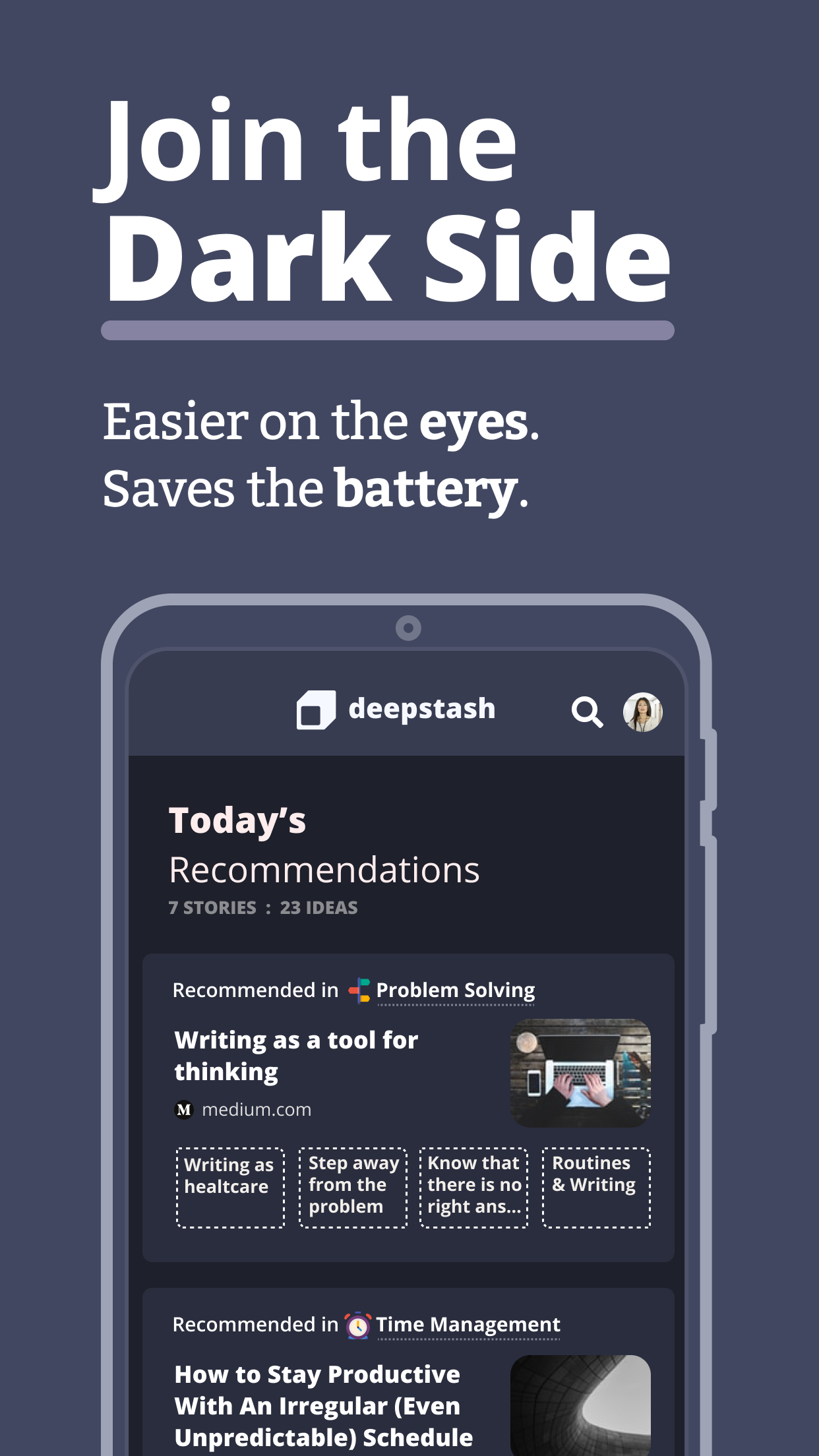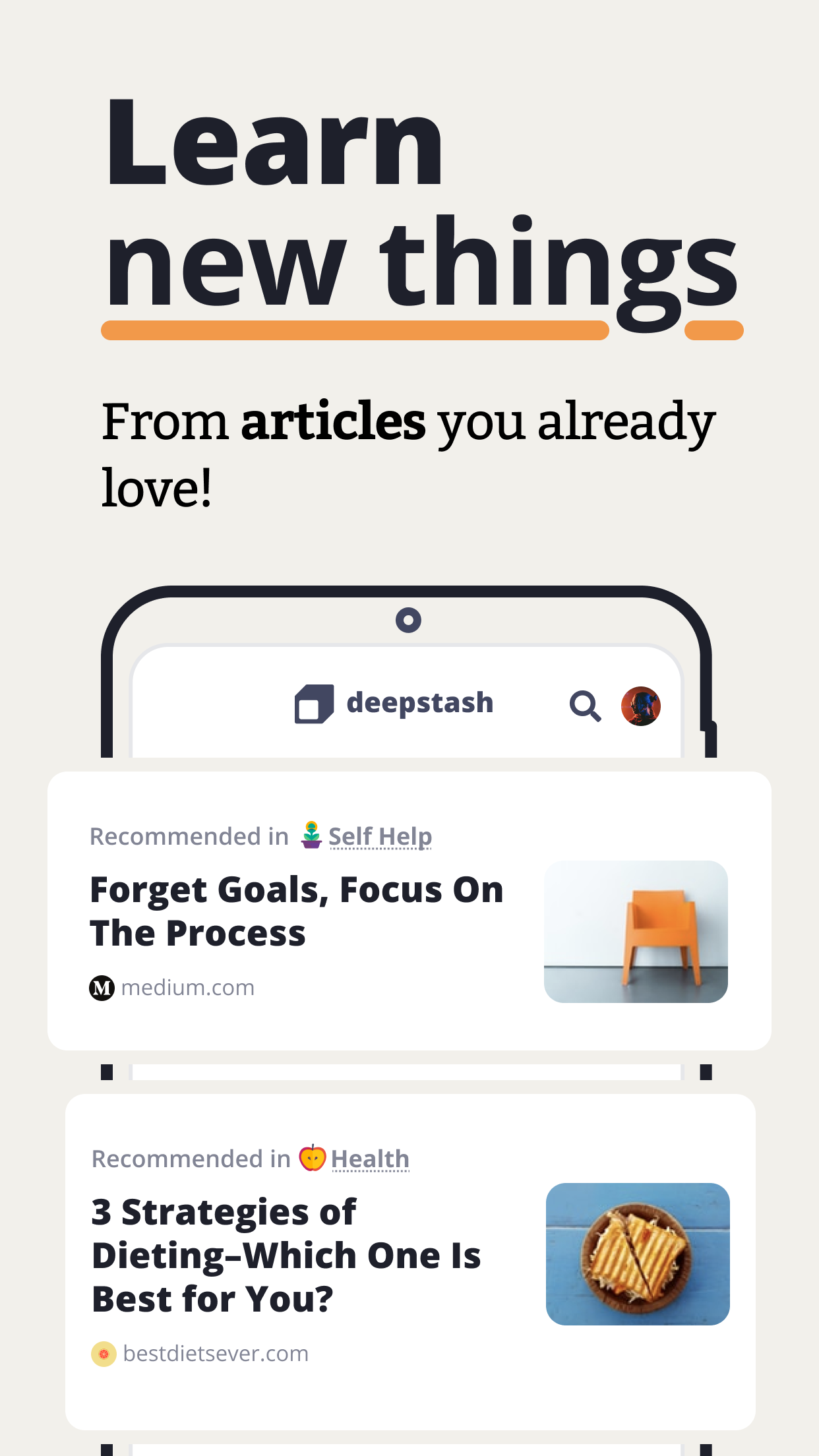 Think of Deepstash as your personal library of thoughts and knowledge. A daily source of inspiring & life changing stories and ideas. Read articles, learn skills, get productivity tips and discover life hacks. All curated by our team and presented to you in a simple, practical and easy to remember, short summarized format. Fuel your curiosity and get smarter daily. It's like your social media feed, if your social media feed had things that mattered :-) No ads. No distractions. 100% Free. The Deepstash app is free and open to everyone. Get a clean reading experience and focus on the content instead of being distracted with annoying ads or dozens of notifications about “premium” subscriptions. Just get a quick free account (Facebook & Google login) and you’re good to go. Deepstash is a multi-platform service. Always have it with you, no matter where you are: iOS: https://apps.apple.com/us/app/id1445023295 Android: https://play.google.com/store/apps/details?id=com.deepstash Web: https://deepstash.com