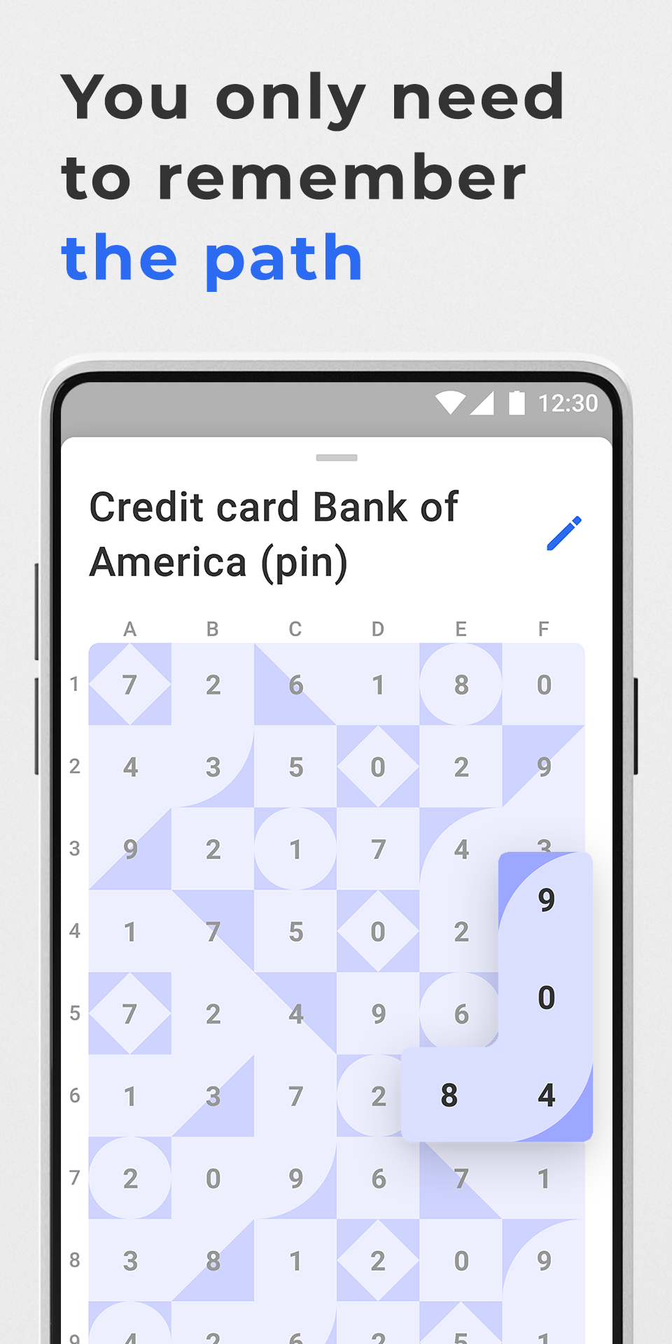 Unlike the majority of password managers, Deqard doesn't ask you to enter your passwords in the app. The password is only known by you and the service that the password is created for. Passwords how they are meant to be! The app creates a unique pattern for you with random symbols above. At the very start, you come up with a secret path through this pattern and remember it. The symbols above your secret path are your password! Use your path with an unlimited number of cards and get rid of the need to remember passwords.