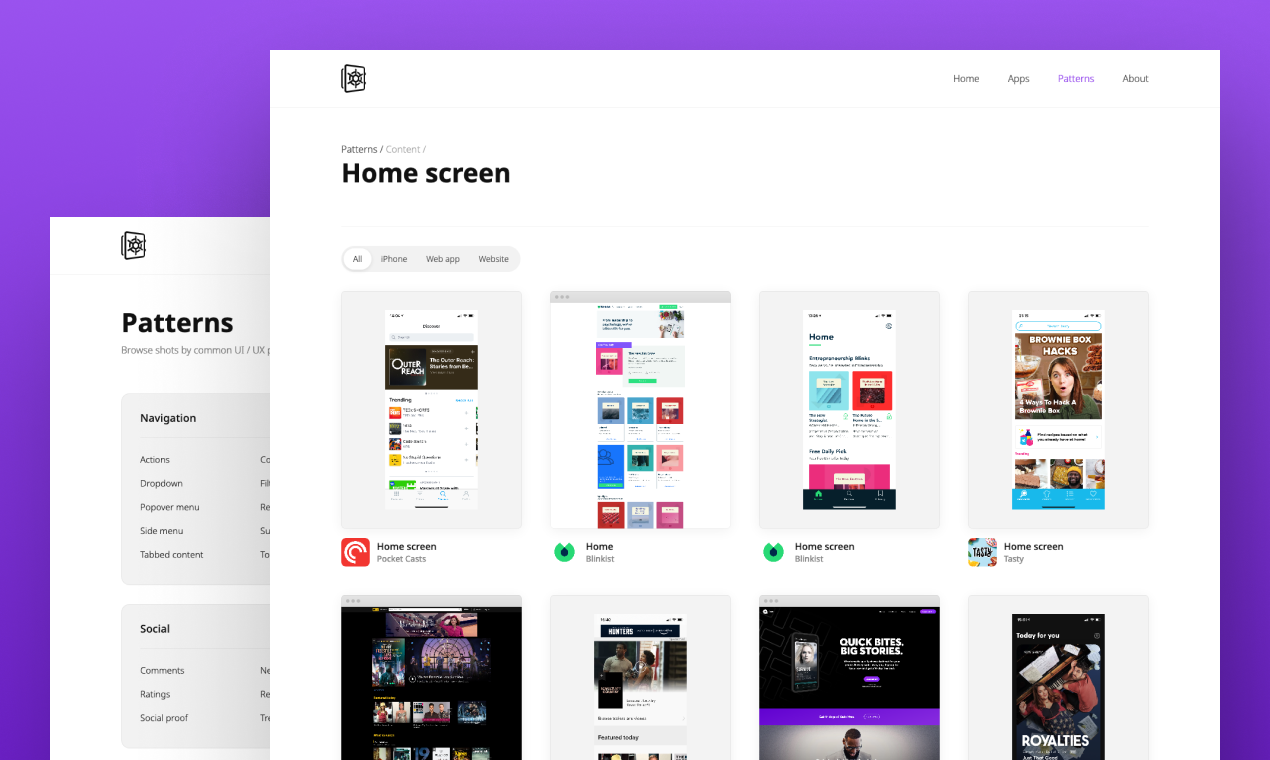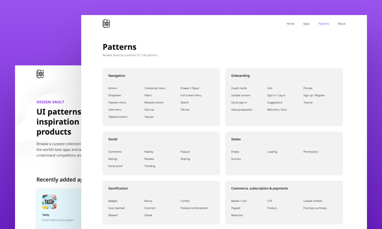 Design Vault is a project I’ve been working on for a while, it’s a curated collection of UI patterns & design inspiration from real products. There are of course many other similar pattern libraries that already exist, but in my experience, I’ve found they all have the same problem – they focus exclusively on mobile. It’s common knowledge that people interact with mobile far more than any other device, but interfaces span beyond just mobile – and with different screen sizes and input methods come different interaction types. So where possible, as well as capturing shots from mobile I’m trying to index patterns from websites, web-apps, and other device types. Websites like Dribbble are a good source of inspiration but are often all style and no substance. Shots are created for likes and don’t solve real user experience issues. Design Vault only indexes shots from real, live products. You can browse shots by app, or pattern. I’ve also included some filtering mechanisms so you can quickly find specific types of UI patterns. Right now I’m focussed on adding as much content as I can to the library, once it’s a little more populated I’ll shift to adding new content weekly alongside developing some new features including videos of user flows. This is just the beginning of what I hope will become a useful tool for Designers, Developers and Product Managers.