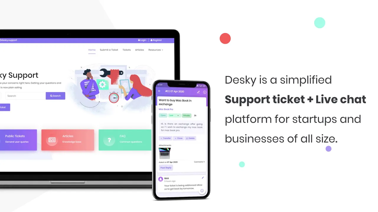 Desky is a simplified helpdesk ticketing system + live chat platform for growing startups and businesses. With Desky you can make your personalized support platform easily. Purpose of the platform is to provide a non-bloated and easy to use ticketing system. Desky allows you to assign, prioritize, and track your customer queries and support request faster, easier and from anywhere you go. Some of the key features include : - Personalized support portal with live chat and ticketing system - Slack integration - Envato market Integration - Multiple Departments & Agents - Articles / Knowledge base - WooCommerce verification (coming soon) - Android +iOS apps (coming soon)
