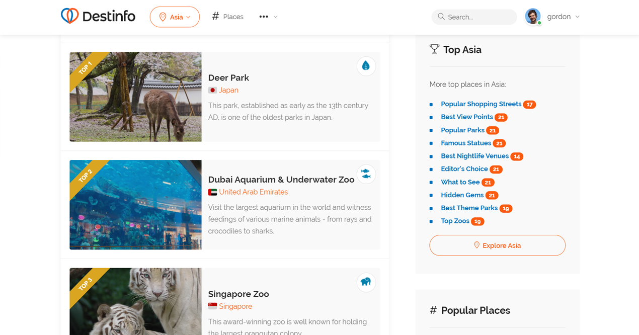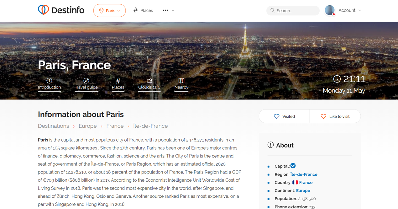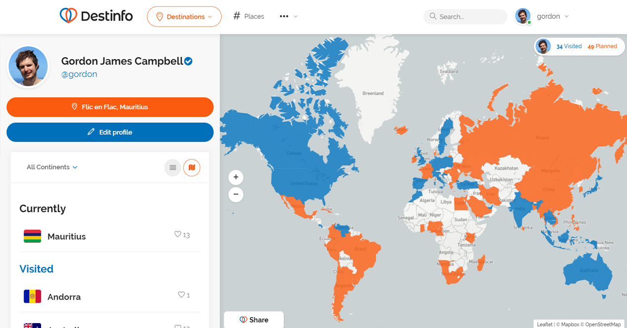 Destinfo offers free travel information for any destination in the world... including travel guides, weather forecasts, popular places to visit and more. Add destinations you have visited or are planning to visit and build your ultimate travel bucket list!