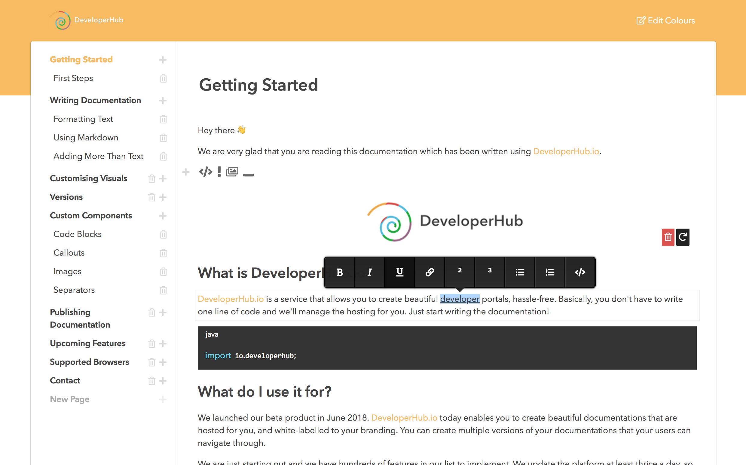 DeveloperHub.io is a service that allows you to create beautiful developer portals, hassle-free. Basically, you don't have to write one line of code and we'll manage the hosting for you. Just start writing the documentation! It is the simplest way ever to have your documentation written. But don't take our word for it, try it out.