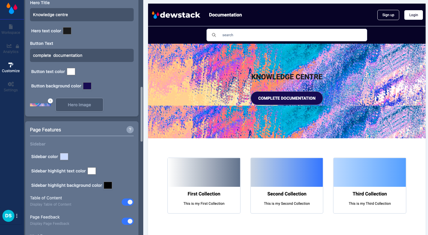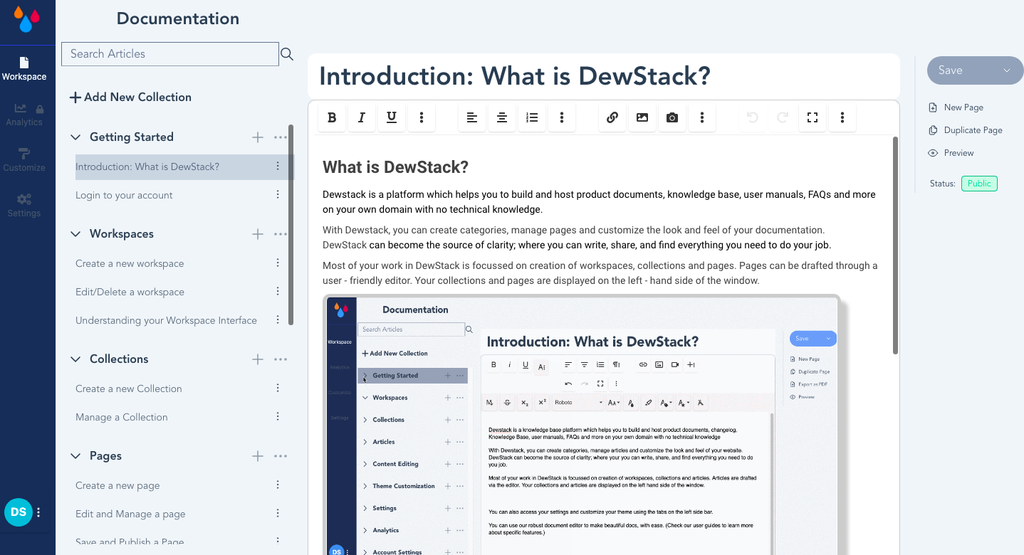 Dewstack helps you build and host your documentation on your own domain with no technical knowledge. Be it a product doc, knowledge base, technical documentation, help centre, FAQ or just anything that you want your users to know and self-serve themselves. Dewstack can help you build them all real quick, host and manage them all from a single platform.