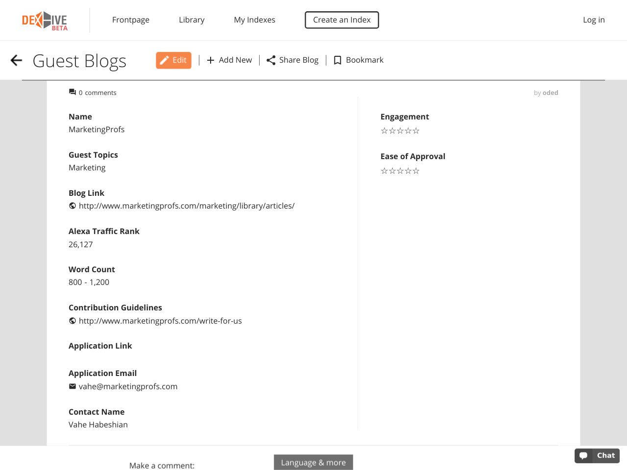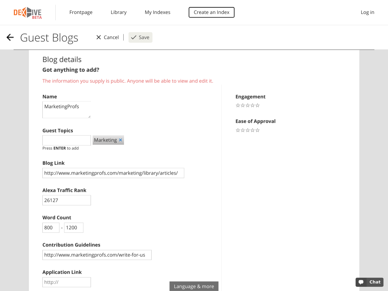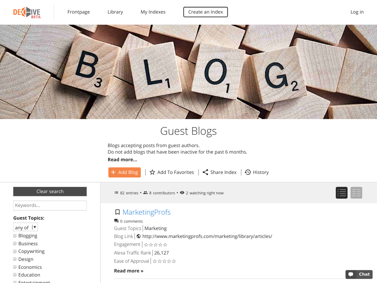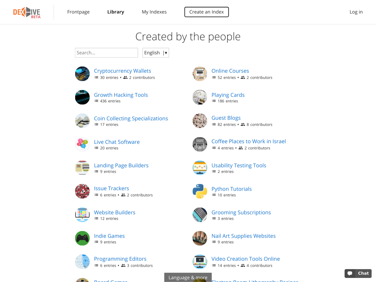 dexHive is a platform that lets the community create crowd-sourced indexes, like TripAdvisor and IMDb. Users can design new indexes, or contribute their knowledge to existing indexes. Every index on dexHive has a unique structure that matches the type of information listed on it. Users can search, sort, and bookmark the information - just like on subject-specific websites.