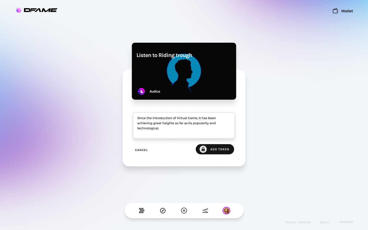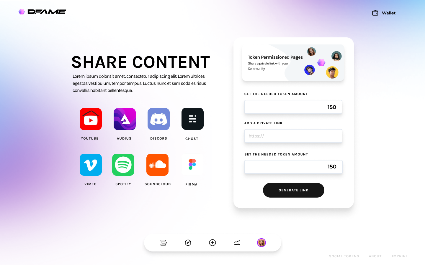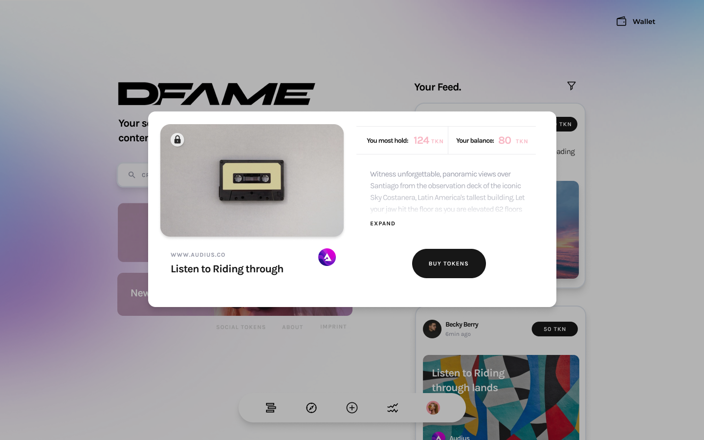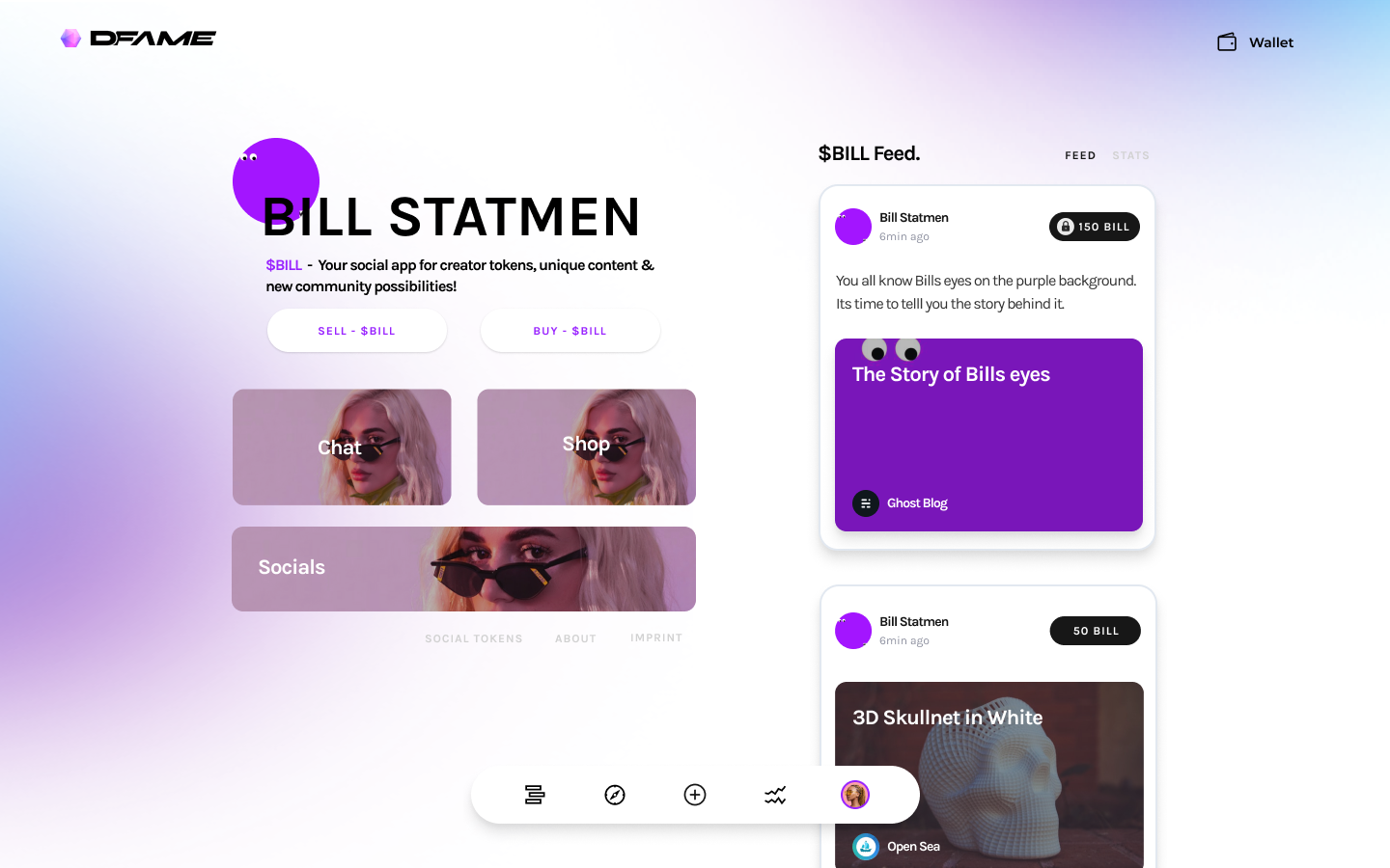 DFAME enables creators, brands, artists, and influencers to turn their community into an economy. Users join by owning a community’s tokens which grants them access to media content as well as the ability to collaborate within the community. As the creator's community grows into its own sustainable network, the community’s tokens represent the new value creation from each member's participation, which incentivizes each member as it’s distributed throughout the network. The Problem: - Social media users spend over 2 hours per day networking between different social apps. We discovered the following problems in today’s platforms: - New creators are unable to raise funds until they are already massively popular with tens of thousands of viewers. - Creators do not own the content they build on social media platforms. - Discovery is hard for new creators with smaller audiences on a large platform, even if they are producing high-quality content. - Fans have no incentive or ability to meaningfully contribute to a community. As a result of this current design in mainstream social media apps, creators and users care more about social status than the benefit of the community. By replacing the current design of current mainstream apps with economic incentives that align creators and users, both can see a greater financial return, increased community involvement, and more exponential growth overall. The Solution: DFAME, a platform where each digital interaction, all creator content, and any product sold is unique. For the first time, a platform that also enables the economic growth of the community, so more active members profit from their participation. Your personal token turns into the new economic layer for your community. The content is unlockable with a community token and our model incentivizes collaboration between creators by allowing them to combine required tokens to access joint content. Finally, creator content can gain true valuation directly from their community, with a more vibrant follower base contributing to higher overall community value. Additionally, members can purchase products from content creators and trade them in an open marketplace.