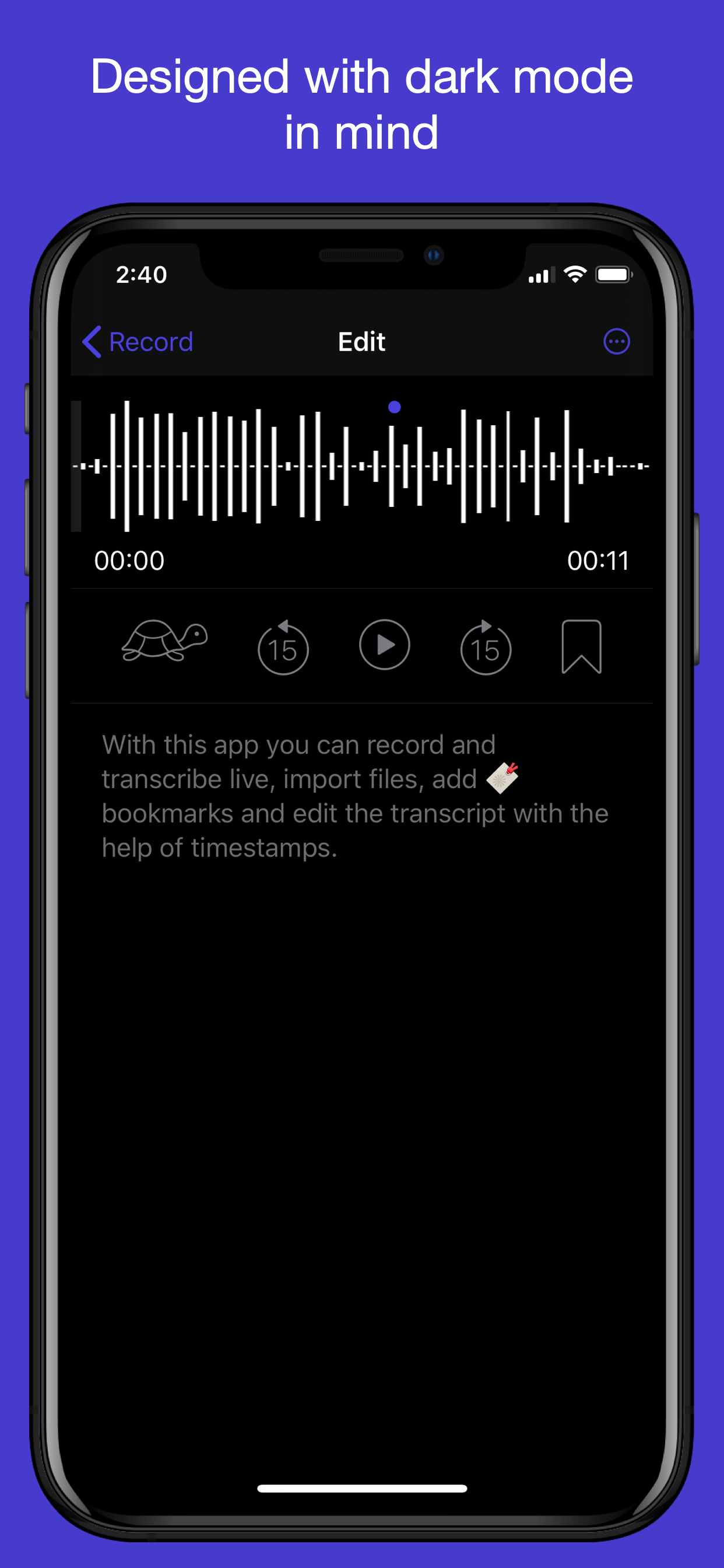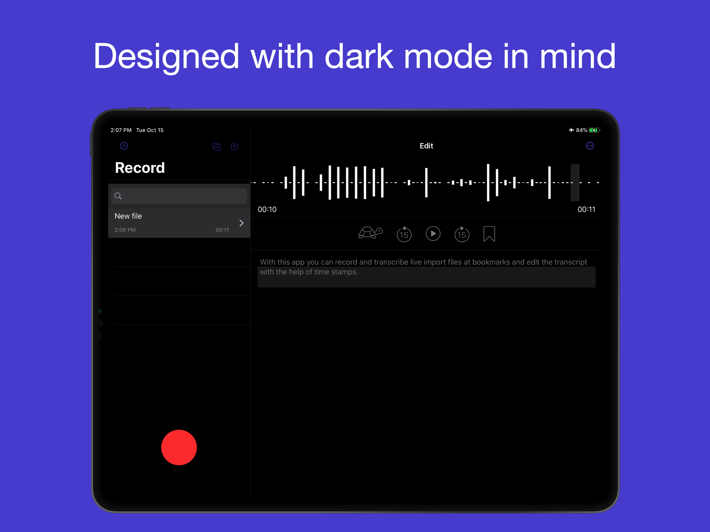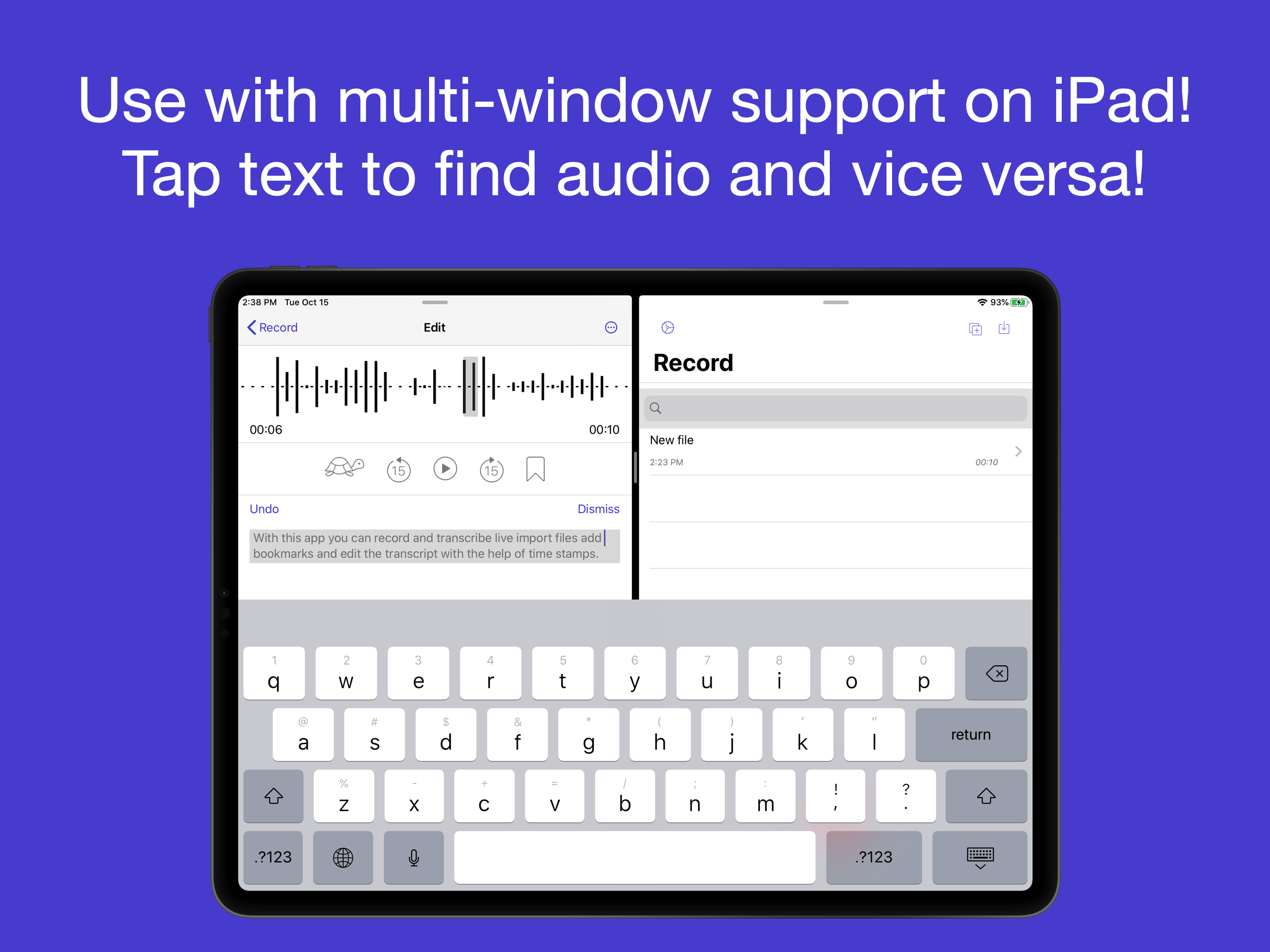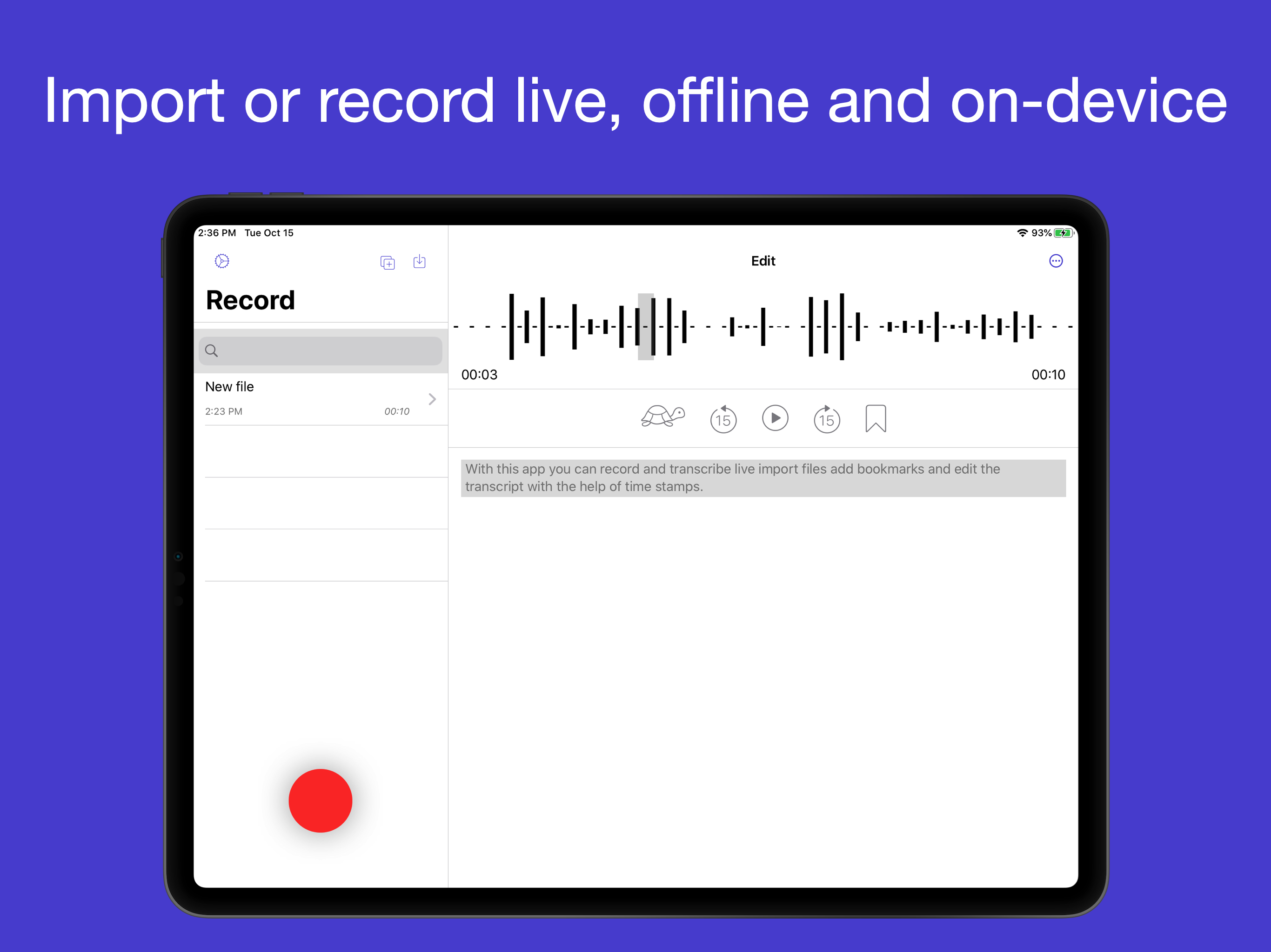 Dictation by Blueshift automatically transcribes spoken audio into text, entirely offline and on the device. You can record live and add bookmarks while you’re recording, or see a full-screen version of the text that you’ve spoken thus far. You can also import files from anywhere on your device. The app also features dark mode and iPad multi-window support. Dictation by Blueshift gives you powerful editing features to correct or refine the transcript after you're done recording, You can: * Tap on a word in the text area to find its audio. * Tap on the waveform to jump to the text associated with that audio. * See the appropriate text highlighted while the audio is playing. * Slow down audio without changing the pitch to better type while listening. * Add and remove bookmarks and see a list of all the bookmarks in a file. The waveform is also interactive, and you can pinch, pan and zoom on the waveform to find your place, or to trim your file into a smaller file while keeping the appropriate part of the transcript and bookmarks. Transcription works in the following languages and dialects: * English - Canada * English - Great Britain * English - India * English - US * Spanish - Mexico * Spanish - Spain * Spanish - US * Italian * Portuguese - Brazilian * Russian * Turkish * Chinese - Cantonese * Chinese - Mandarin Dictation by Blueshift uses machine learning on device, and all transcription happens locally. No audio is sent to any cloud service. Try transcribing after turning off the Internet connection to your device!