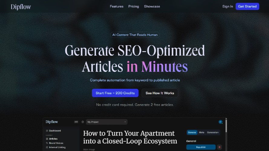 Dipflow is a content tool that handles the full process of creating an article. You give it a keyword, and it looks at what's already ranking, pulls together research, builds an outline, writes the content, adds FAQs and takeaways, and generates images. You can review and edit at each step, or let it run automatically. The main idea is that creating good content usually means jumping between five different tools and spending hours on research before you even start writing. Dipflow puts all of that in one place. You can publish single articles with manual approval, or set up campaigns that generate and publish content on a schedule directly to your site.