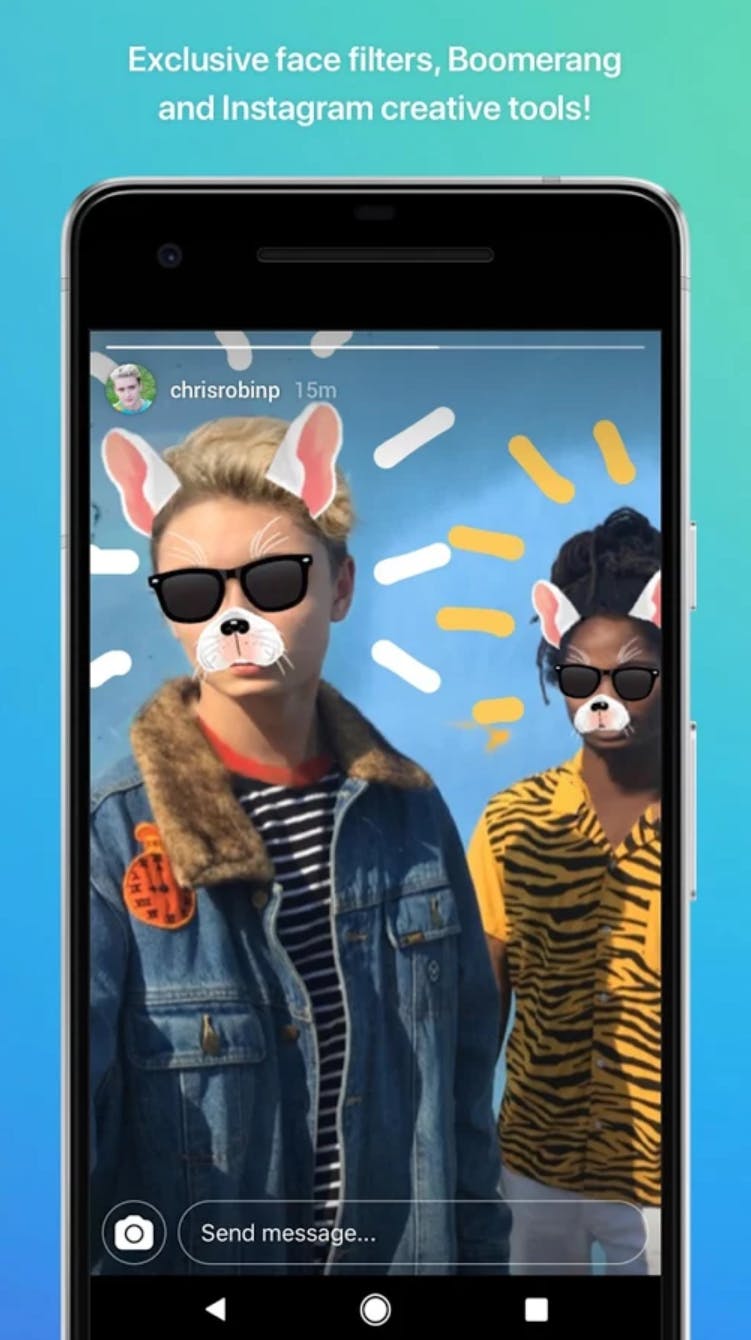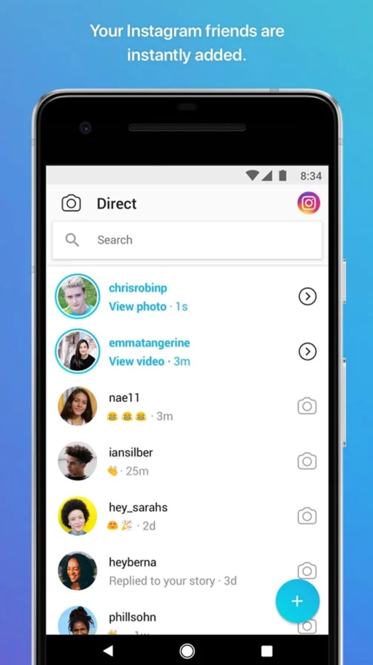 Direct by Instagram is a new way to directly message friends on Instagram. Message your friends with fun photos, videos and Boomerangs! • Shoot and share fun messages faster than ever before. • Your Instagram friends are instantly added. • Exclusive face filters, Boomerang and Instagram creative tools. • Remix your friends' pics.
