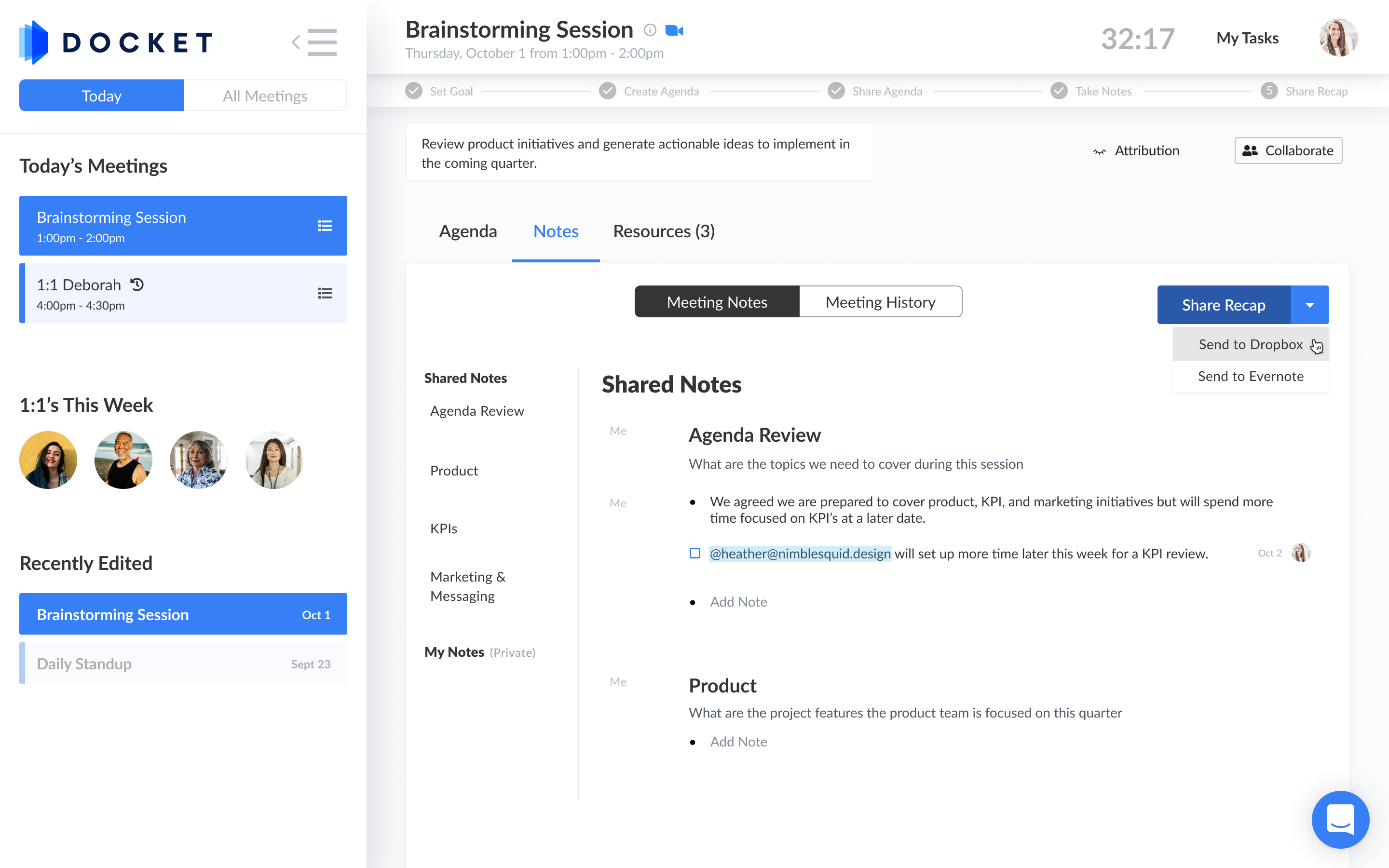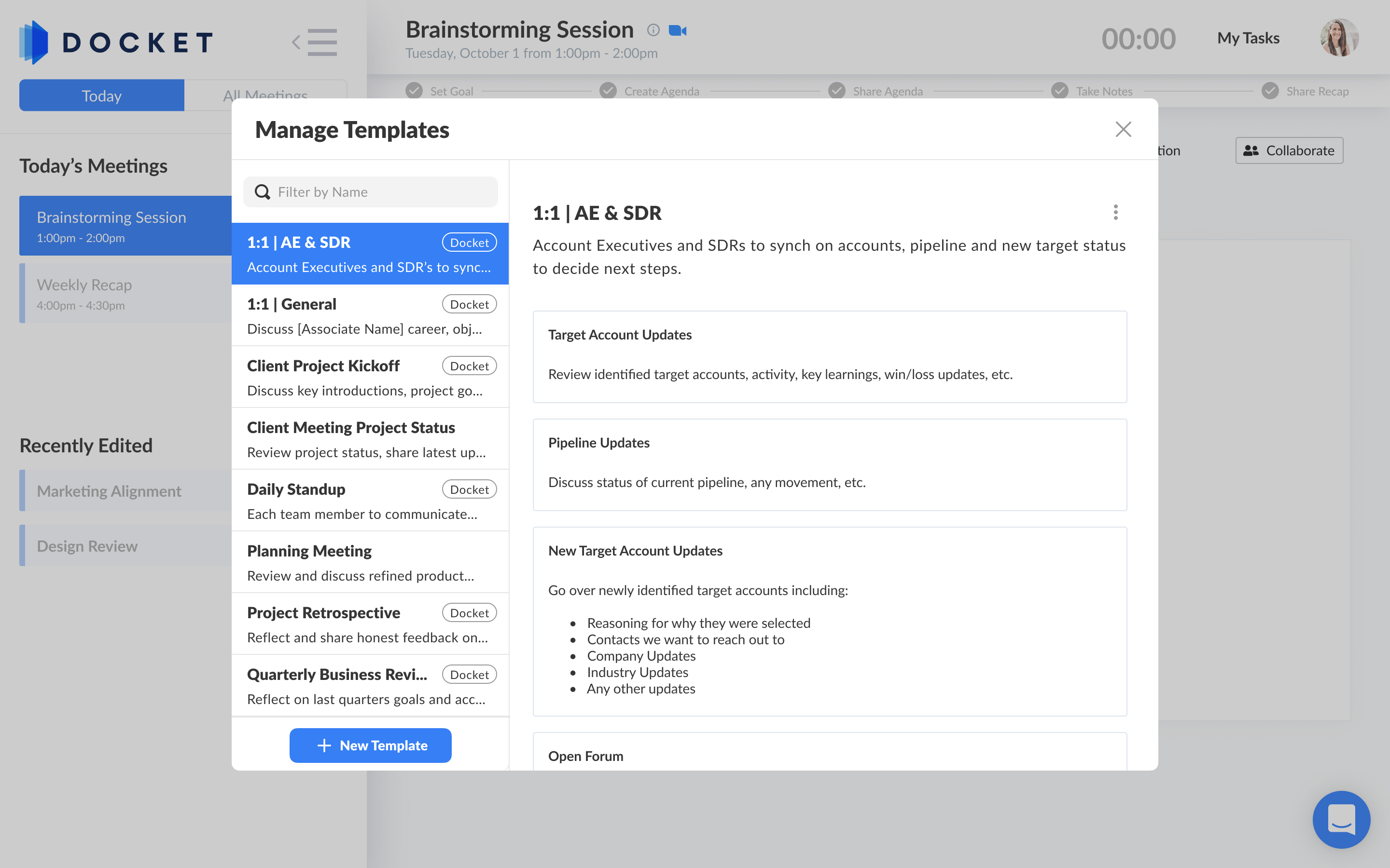 Docket is a meeting platform that enhances the process for every stage of a meeting by providing tools and integrations for greater efficiency and alignment. The Docket SaaS platform is flexible and customizable to aid any process, business, and industry in any stage, by empowering team collaboration (internal) and client participation (external) for greater project success. Use Docket to prepare for an effective and efficient meeting by setting clear goals and managing expectations for team members and clients. Enable transparency by collaborating throughout the meeting process for awareness and to ensure activities and actions drive the meeting purpose in the best direction. Create alignment by keeping everyone in the loop with decisions and next steps to calibrate a project and keep everyone on track and moving forward. Experience greater productivity and efficiency with tools and integrations that help prepare and share meetings and give time back in your day. Docket brings your meeting tools and assets together for a seamless meeting experience. Learn more about Docket at DocketHQ.com.