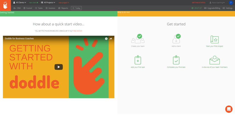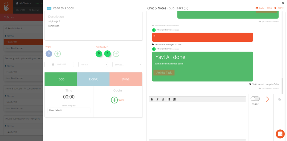 Some our main features There are many platforms available which are essentially online spreadsheets, meaning you still have to create your own workflow. Doddle has it's own workflow making it very simple for tasks to go through the sales funnel, in to a todo list, time tracked, done and invoiced Doddle contains a CRM, lead funnel, client tasks, project tasks, time tracking, invoicing and reporting...allowing small businesses to replace (on average) 7 SaaS platforms used in their business, with everyone working through one tool The integrated task timer means that you almost accidentally keep track of the time you spend on different tasks - whereas other solutions rely on you retrospectively adding your time. Allows clients to point and pin parts of their website to provide feedback - which lands in as a task in Doddle, along with a screenshot, removing any ambiguity as to what the client is talking about