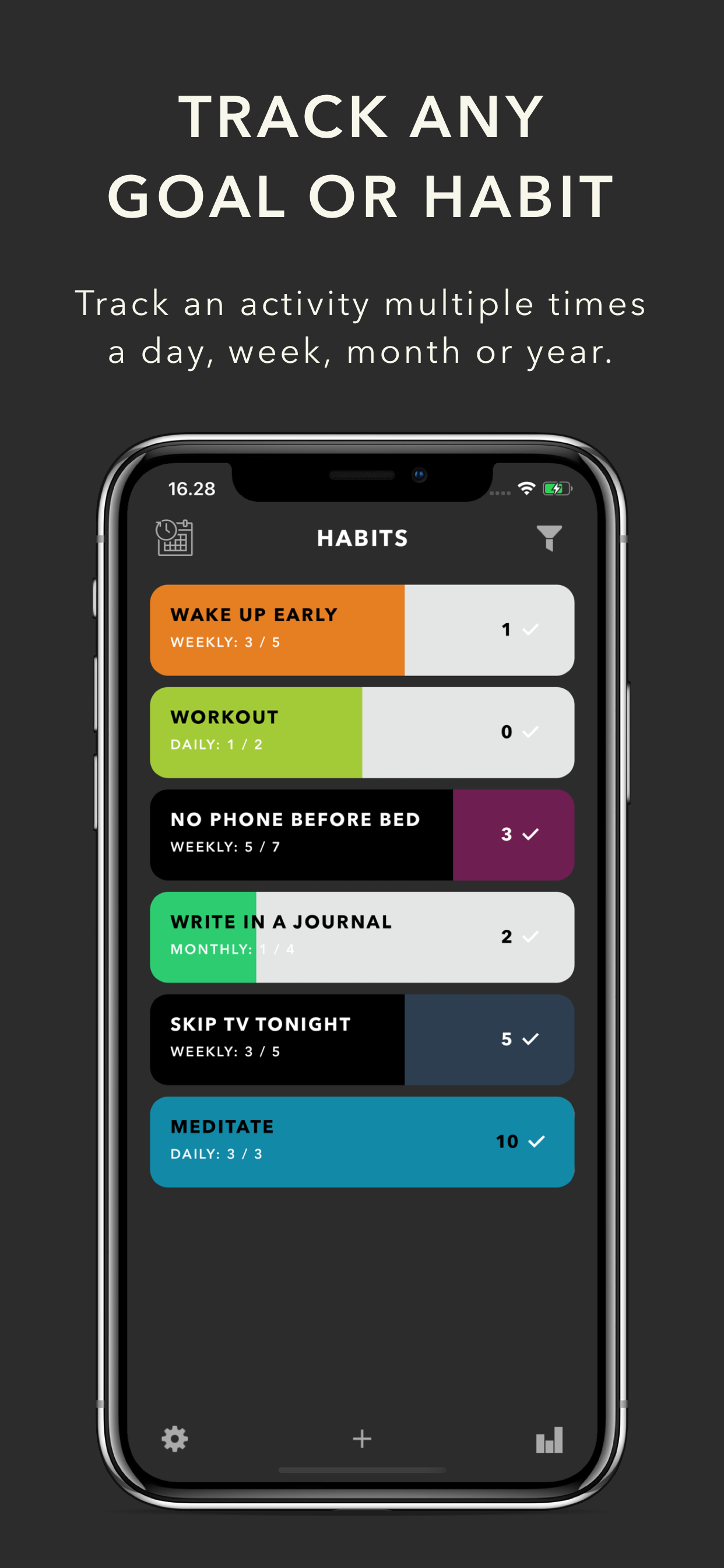 DoHabits helps you create healthy routines by helping you set goals, tracking your progress, and then motivating you with streaks. Unlike so many other habit apps, DoHabits lets you set a goal and track it MULTIPLE times a day, not just one time per day. DoHabits can help you both BUILD and QUIT habits/activities. After setting tangible daily, weekly, monthly or yearly goals, DoHabits will help you track your habits and activities and tell you when you've met your goal. DoHabits also keeps track of Streaks when you've met your goals in consecutive periods. DoHabits Features: • Allows you to set and track goals on a daily, weekly, monthly or yearly basis • Let's you set a goal for MULTIPLE times a day, not just once like most habit apps • Totally customisable habit display (the color bar) - you choose what will motivate you • Enables tracking for both building habits AND quitting habits • Unlimited habits/goals • Fun color options let you customise your list • Daily journal lets you keep notes about your habit • Summary with charts to see weekly, monthly and yearly progress • Easy to edit activities in the past • Group habits into custom categories for easy organization • Multiple reminders for each habit • Exportable CSV data with totals and time stamps • Passcode protection with FaceID/TouchID • iCloud data backup