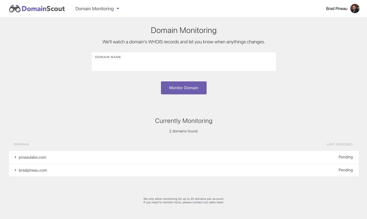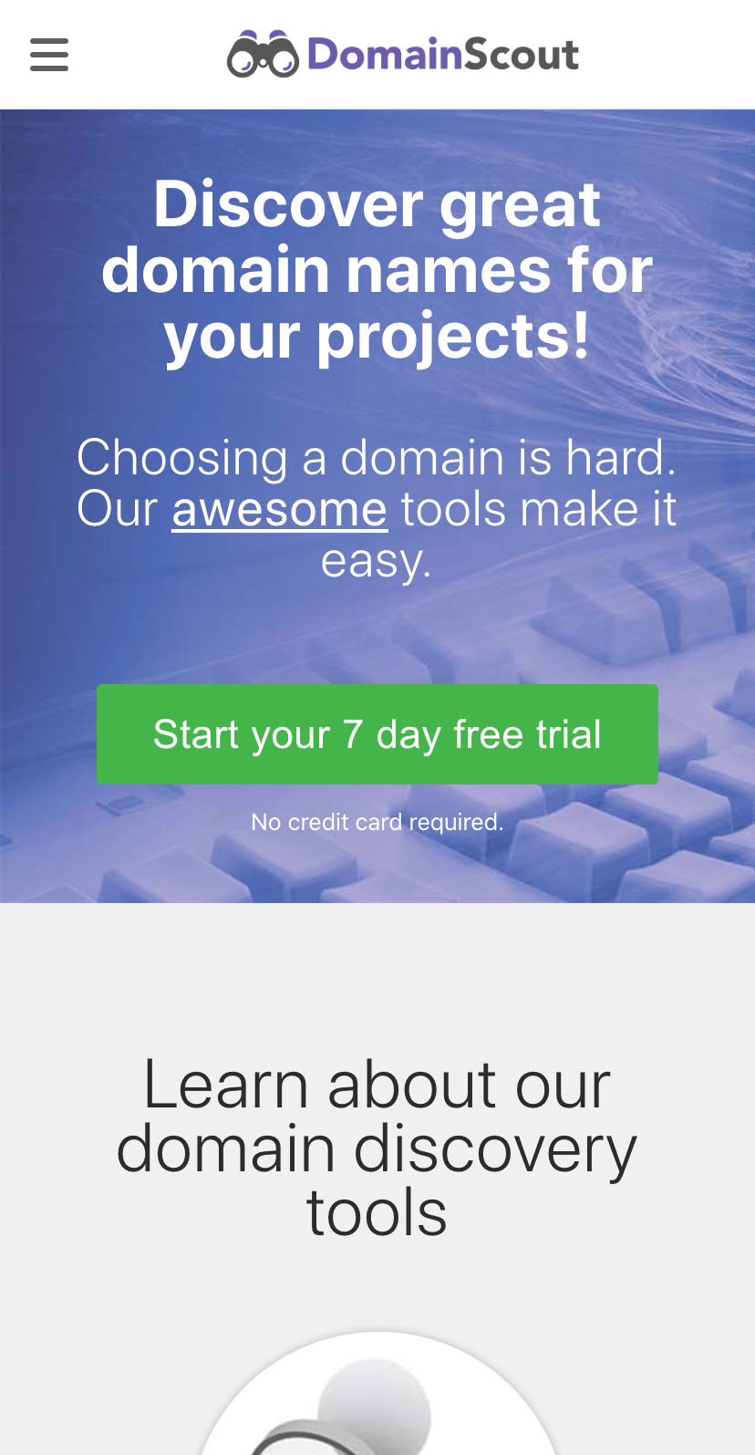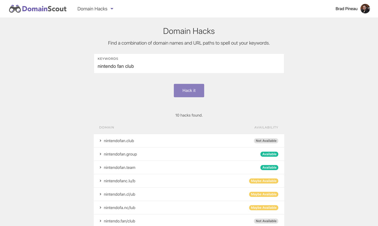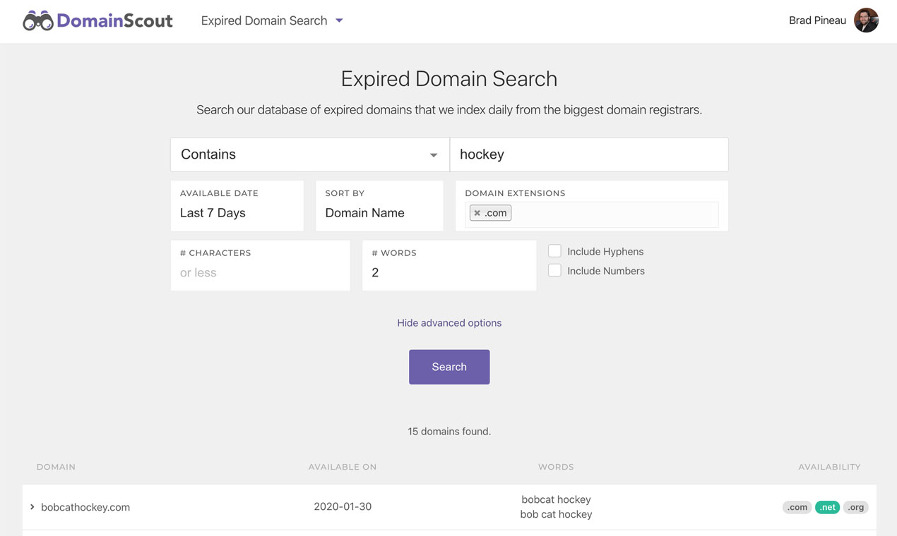 Domain Scout has the tools to help you discover domain names for your projects. Our list of tools include: • Expired Domain Search • Keyword Spinner • Domain Generator • Domain Hacks • Domain Monitoring Start your free trial today, no credit card required.