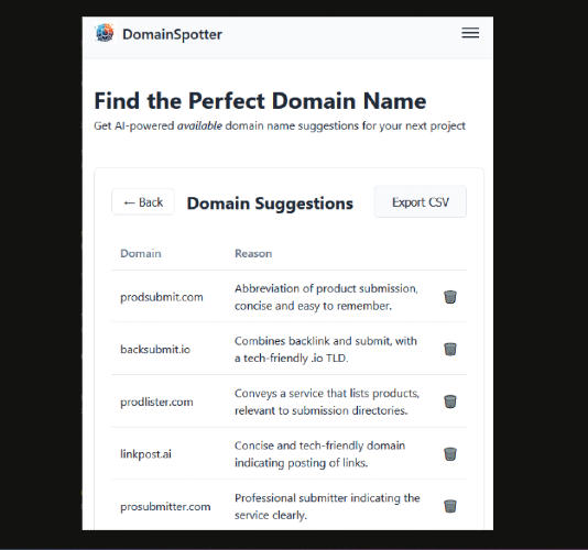 "DomainSpotter is a free, ad-supported domain discovery and analysis tool built for entrepreneurs, developers, and brand strategists. It helps you find available, brandable domains in real-time, spot expiring or auctioned domains, and evaluate potential trademark risks before buying. Key Benefits: Real-time availability checks across multiple registrars. Brandability scoring using NLP and name structure analysis. Trademark collision warnings via USPTO similarity checks. Exportable watchlists and CSV reports for easy collaboration. Direct registrar links for instant purchase. How It Works: Enter keywords or naming patterns. DomainSpotter generates available names, applies filters (length, TLDs, etc.), and flags potential risks. You can favorite, export, or click directly to buy from supported registrars. API Access: Power users and registrars can access domainspotter using our API, contact for pricing."