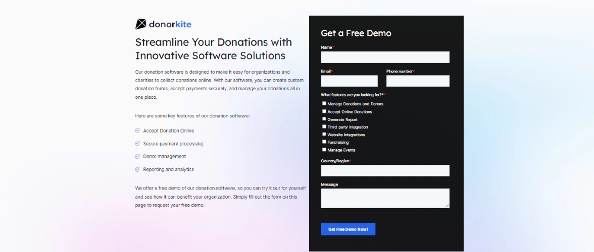DonorKite offers powerful donation management software for non-profit organizations, churches, charity, & NGOs helping you streamline your fundraising efforts and maximize your impact. From donor management to online donations, our software is designed to simplify every aspect of your donation process. Get started today and take your fundraising to the next level with DonorKite.