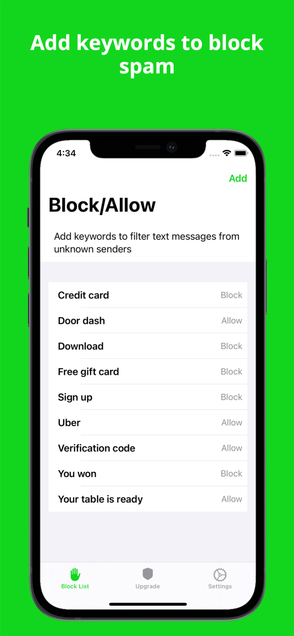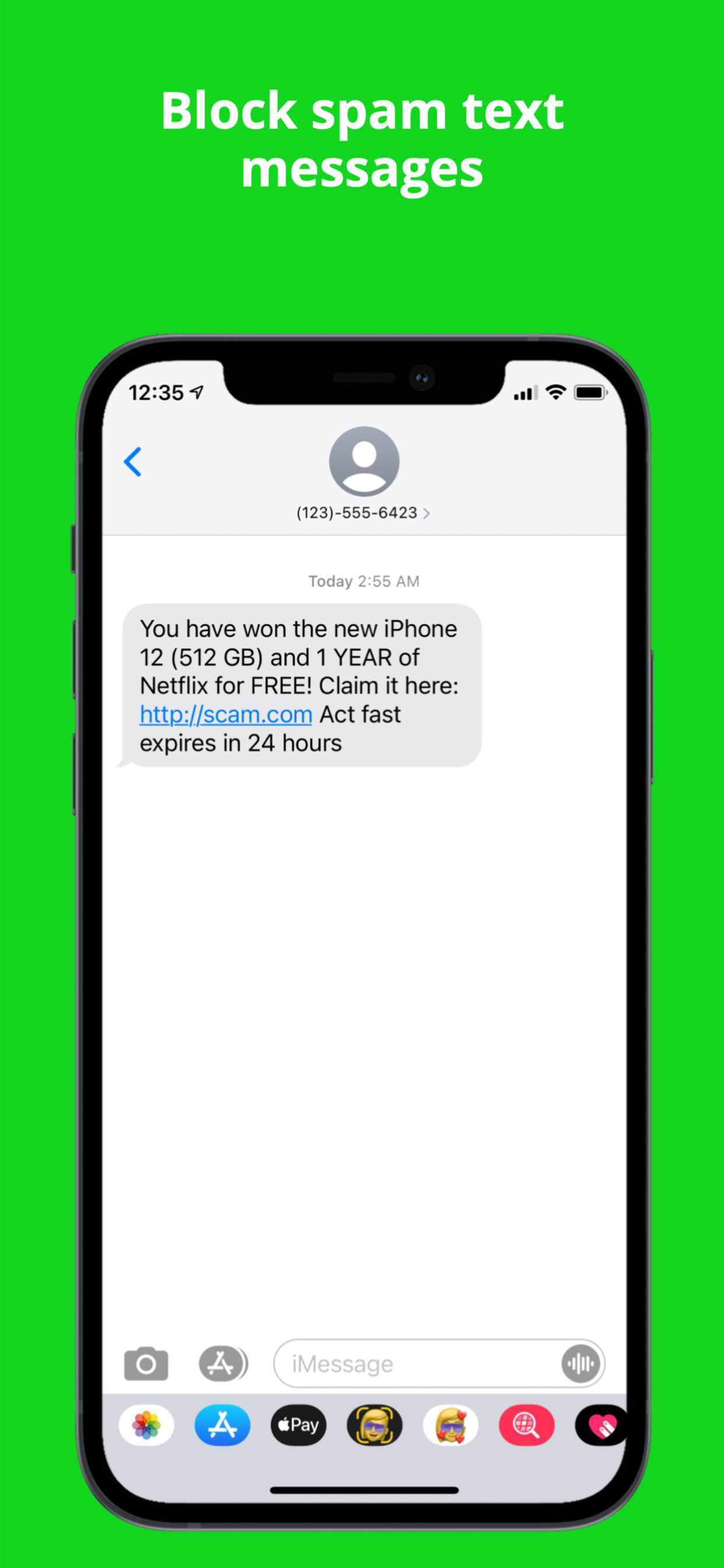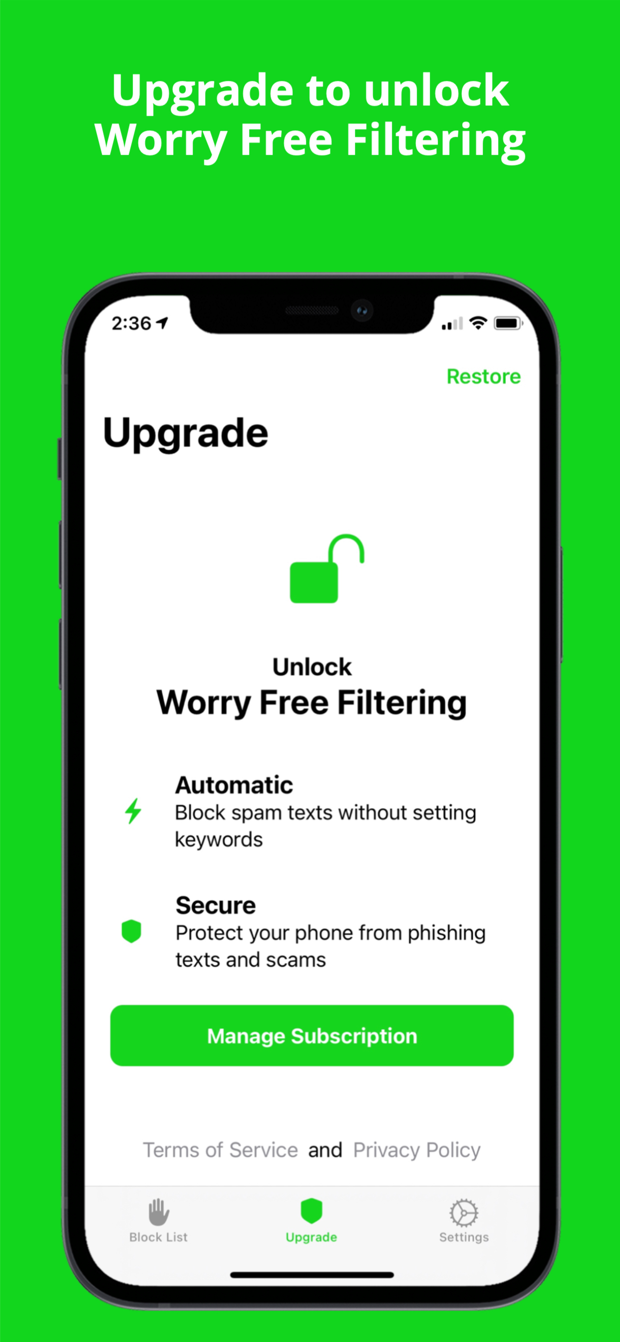 Block annoying spam texts. Set powerful keywords to filter unwanted texts from unknown senders. Upgrade to Worry Free Filtering to automatically block all spam texts. Dont Text is easy to get started with. In two quick steps you can get rid of spam texts from your phone for good. 1. Add keywords in the app - Create a custom list of keywords to decide how to block spam texts. Block messages from unknown senders that contain a keyword, or allow messages past the filter with a keyword. Add as many keywords as you'd like! 2. Watch spam disappear - Dont Text will check new messages from ONLY unknown senders and apply your filtering rules. Blocked messages are sent to the junk folder in the messages app. With Dont Text you have complete control over how you block spam and your privacy. Dont Text never saves or stores your text messages or personal data. Your texts stay private and secure, as they should. If you need extra help blocking spam, upgrade to Worry Free Filtering to automatically block spam texts without setting keywords. Dont Text will instantly block spam, phishing texts, scams, and texts from email senders for you. Skip the hassle of setting keywords and worrying about protecting yourself from phishing and spam, Worry Free Filtering has you covered. Dont Text Features: - Block spam texts containing keywords from unknown senders only - Allow texts containing keywords to never miss an important text message - Send spam messages to a junk folder and so you can still access blocked texts - Upgrade to Worry Free Filtering to unlock automatic spam text filtering (Yearly Subscription) - Make your phone safer and more secure by blocking spam texts and phishing texts - Block spam text messages from email senders - Keep your messages private. Dont Text does NOT store your data or save your texts