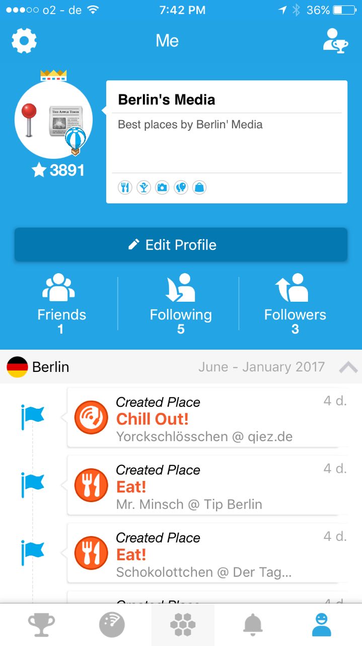 We believe that the World around is more surprising, beautiful and interesting than most of us used to think. And every single person should be able to discover it. The way we are going to help people to discover the World around is by showing them all areas and places where they have never been yet on the single map and by highlighting unique places that worth to be visited and are created by regular people, experts or Media. Currently you can find many awesome places recommended by Media in Berlin. Feel free to add new places you want to recommend others in your city!