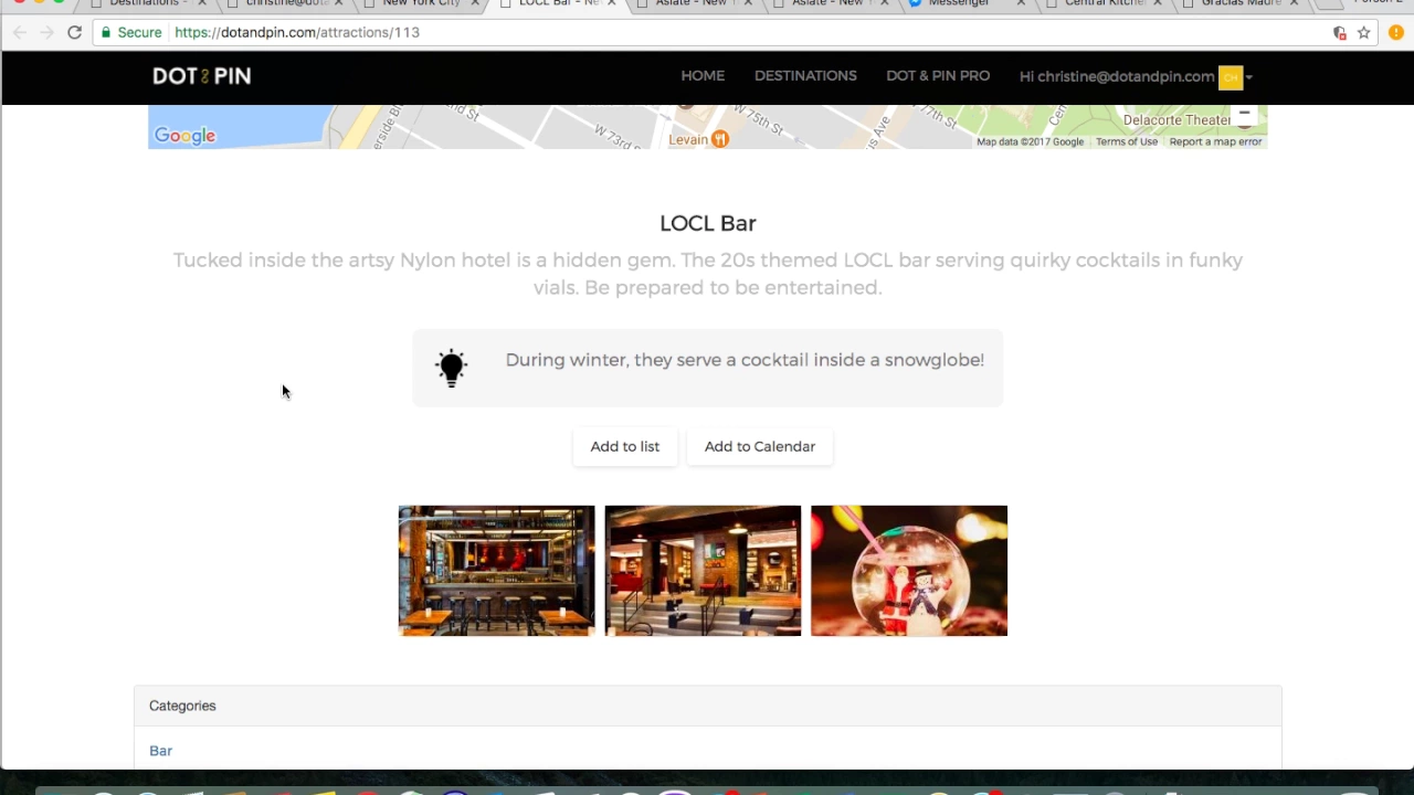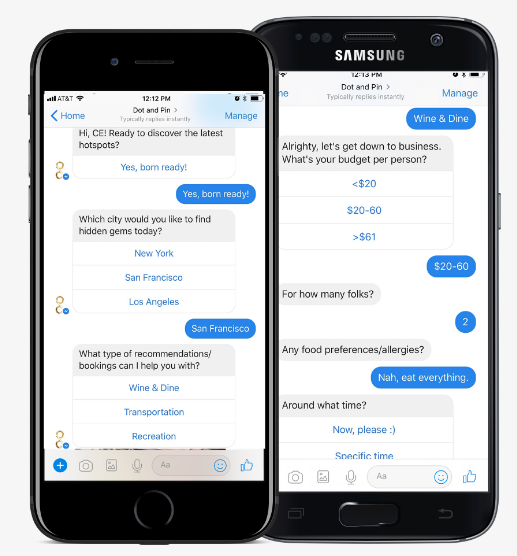Dot & Pin is a personalized recommendation engine with a messaging-powered online travel concierge for short or long-term business travel. Dot & Pin curates content from high-influencer travel, food or lifestyle bloggers, matching results based on smart personalization from user preferences and data usage instead of showing what is nearby or ranked by popularity. The virtual human travel concierge is an expert local resource to expedite or personalize such needs.