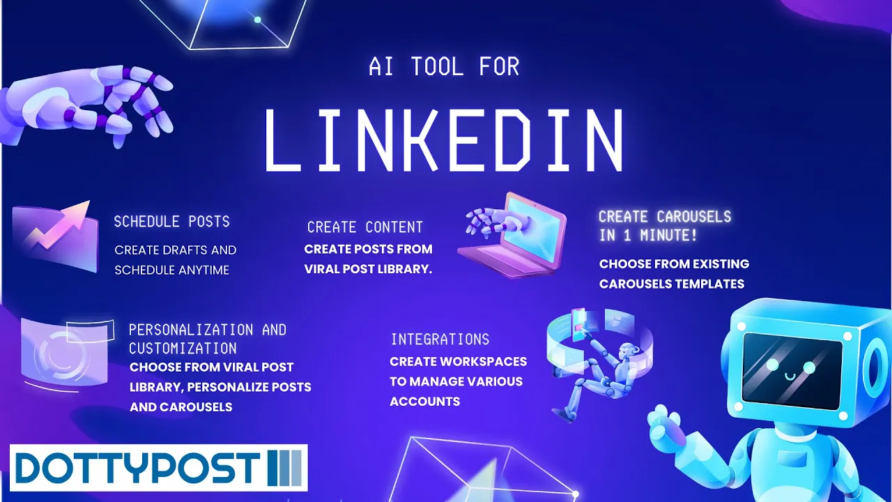 Dottypost is your all-in-one AI tool for LinkedIn growth. Create engaging posts from Shorts, YouTube, and Blogs effortlessly. Generate captivating carousels from Shorts, YouTube, and Blogs. Enjoy post auto-pilot, access to 10,000+ posts for inspiration, and AI insights on existing viral content. Manage your content effectively and even auto plug comments for seamless interaction.