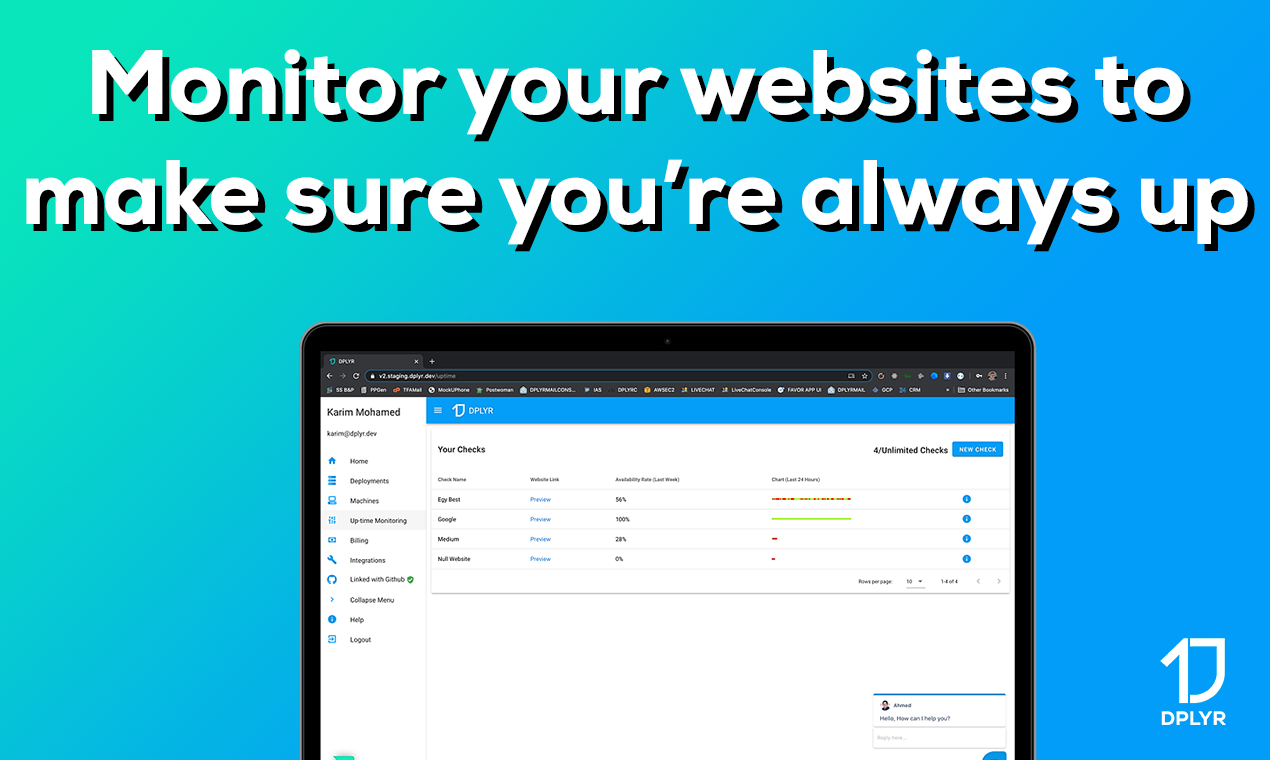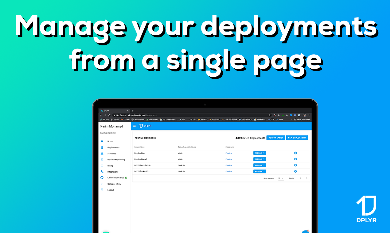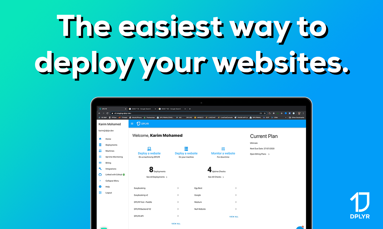 DPLYR is a tool that helps developers to deploy websites more easily on your machines or on DPLYR's powerful machines. You can deploy Node.js, PHP, and Laravel and you can include databases like MongoDB, MySQL, and PostgreSQL. And all of that is free ? Enjoy our product