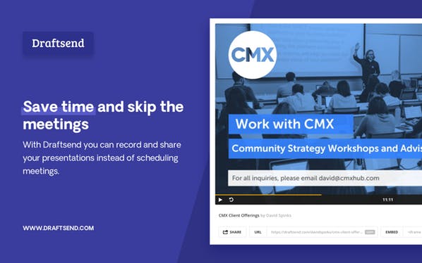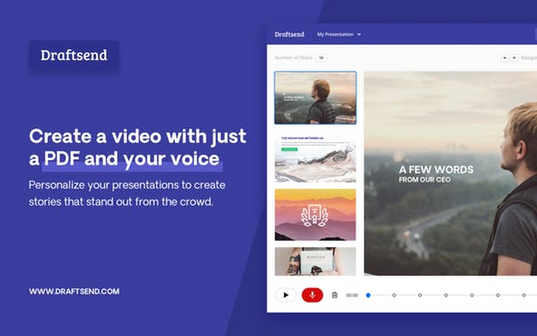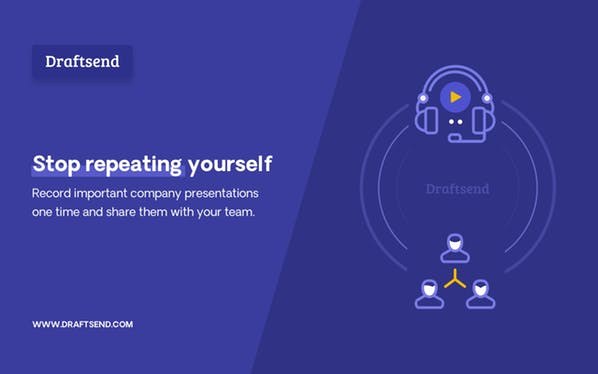 Draftsend lets you create and share interactive presentations with just a PDF and your voice. -Save time and skip the meeting Record a presentation with your voice and share it, instead of scheduling a prospect, customer or team meeting. -Create content that converts Make marketing presentations more effective by adding your voice and sharing, or embedding on your website. -Stop repeating yourself Record important company presentations once and share privately with your team so they can watch anytime.