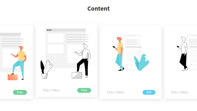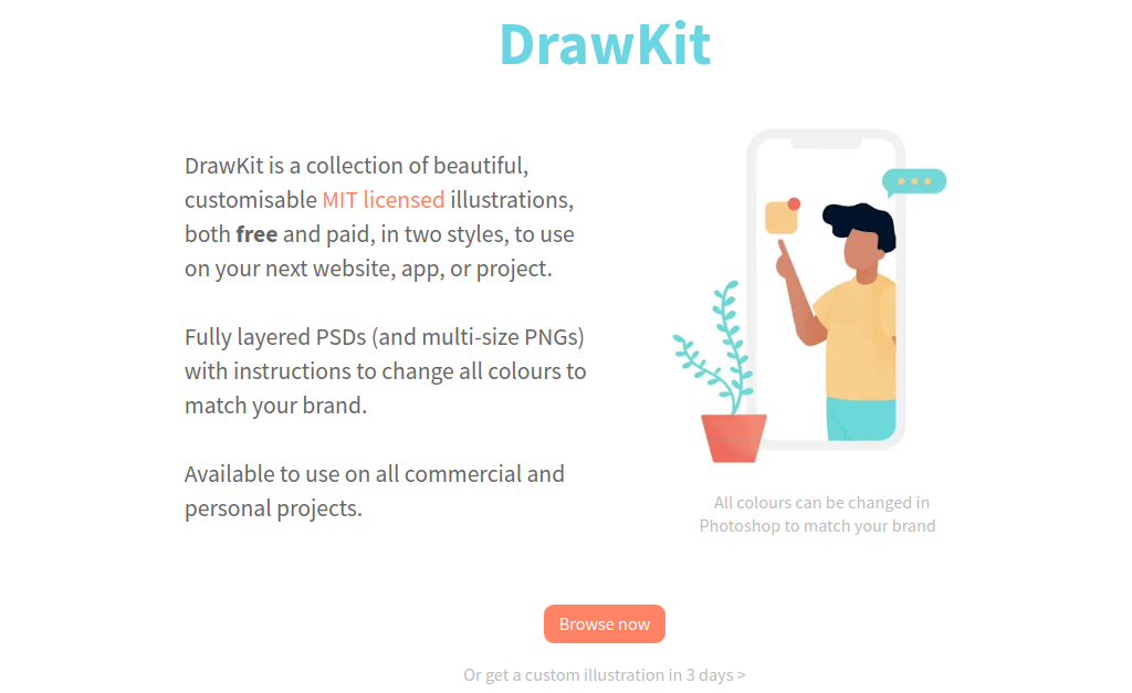DrawKit is a collection of beautiful, customisable MIT licensed illustrations, both free and paid, in two styles, to use on your next website, app, or project. Fully layered PSDs (and multi-size PNGs) with instructions to change all colours to match your brand. Available to use on all commercial and personal projects.