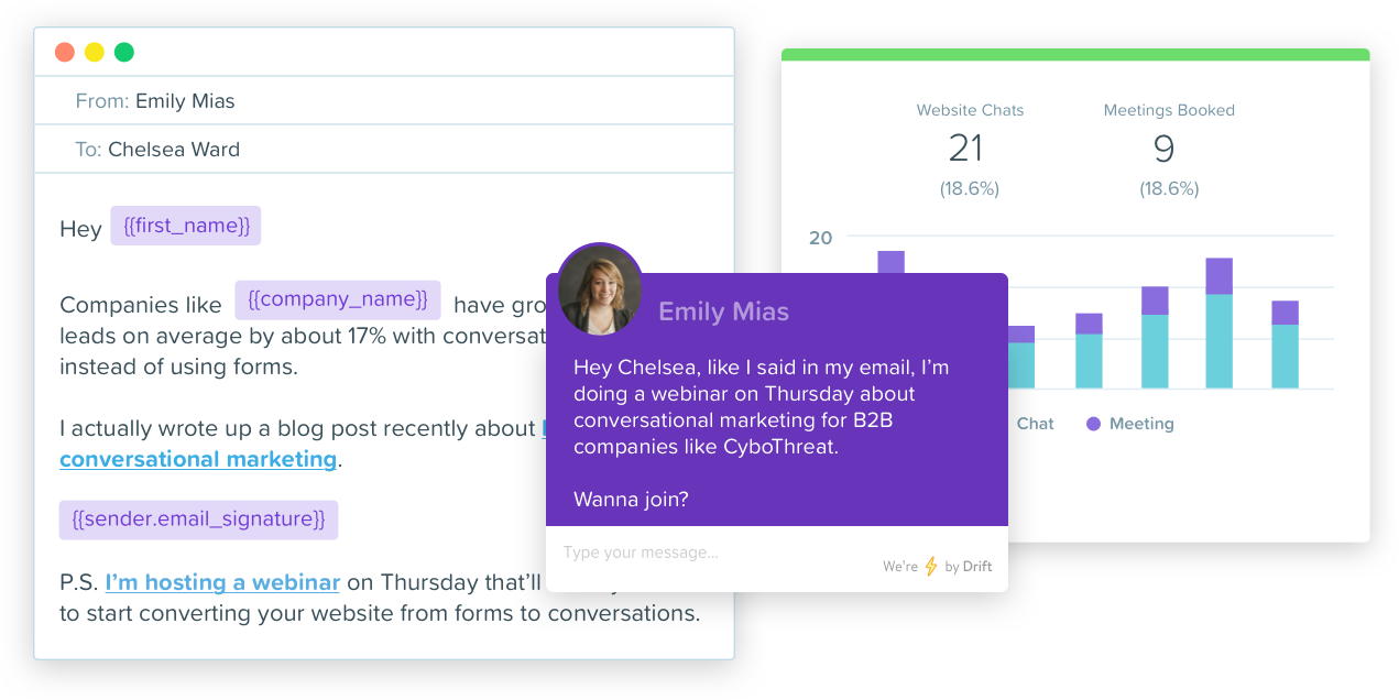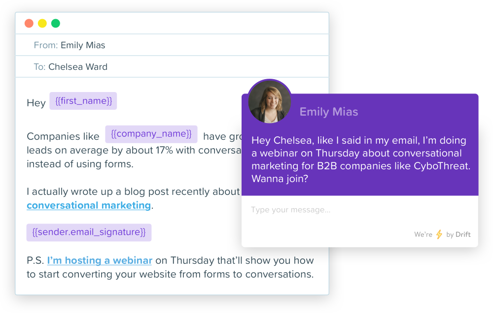 A faster buying experience with fewer emails would make you and your leads happier. That's why Drift is launching marketing email that drives personal, real-time conversations at scale. Now you can delight your leads while speeding up your funnel. Everything You Need to Create Seamless Buying Experiences -Drive real-time conversations with every marketing email -Put an end to annoying emails with one click -See the ROI of all your email activity -Send any kind of marketing email without leaving Drift -Hand your sales team warm leads with zero friction