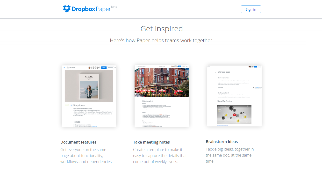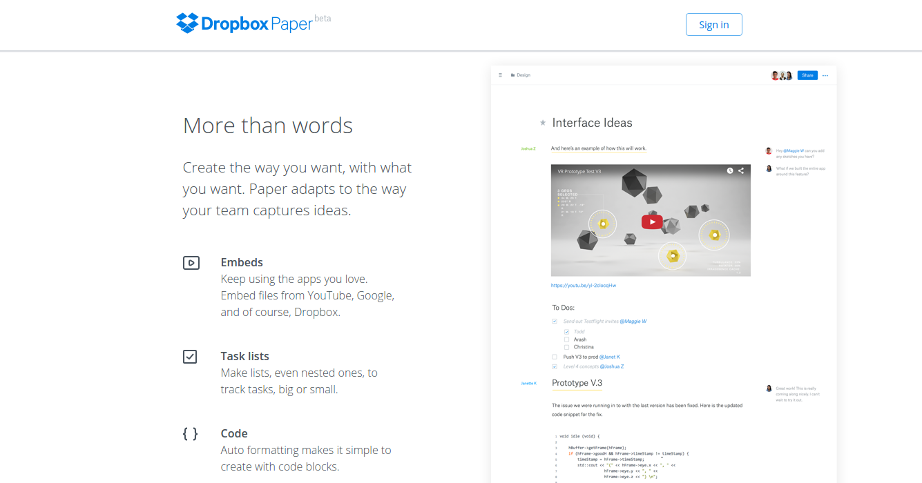 A home for your projects, not just your files Dropbox Paper is the best way for teams to collaborate on ideas – share docs, give and get feedback on files, and track tasks all in one place. More than words. Create the way you want, with what you want. Paper adapts to the way your team captures ideas. - Embeds - Task lists - Code Collaborate at the speed of thought. Give and get fast feedback right where your ideas are created. - Share instantly - Iterate in real time - Comment with style The beta version of Dropbox Paper is ready. Signup for free.