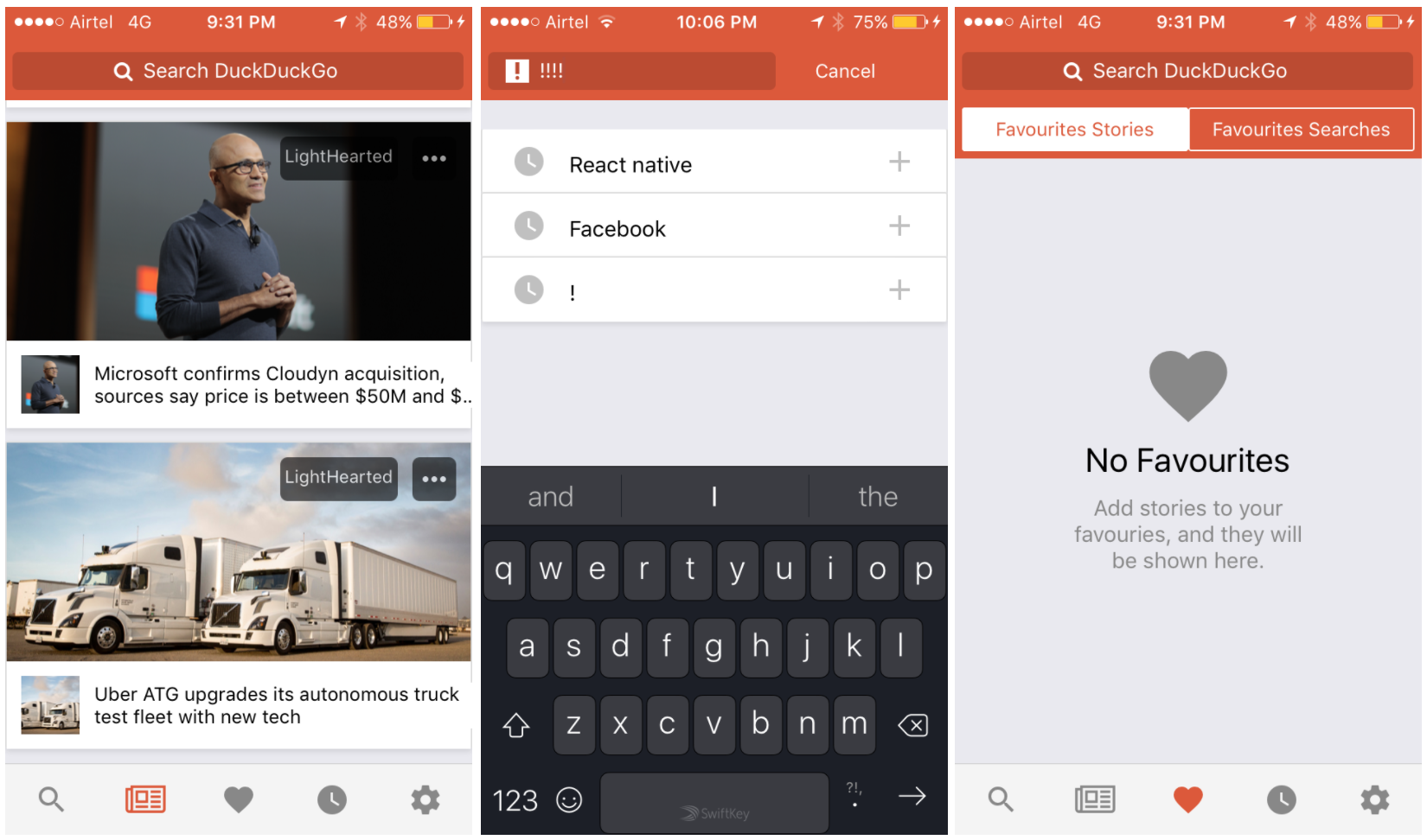 React-Native is really awesome! It's a little difficult in the beginning but as time passes by you start to feel it's beauty and power and how easily and quickly one can develop Apps on both Android and iOS. I tried to make it look like the original DuckDuckGo app as much as possible and to be honest it's not that difficult as I thought it to be. It takes time but it's worth it.