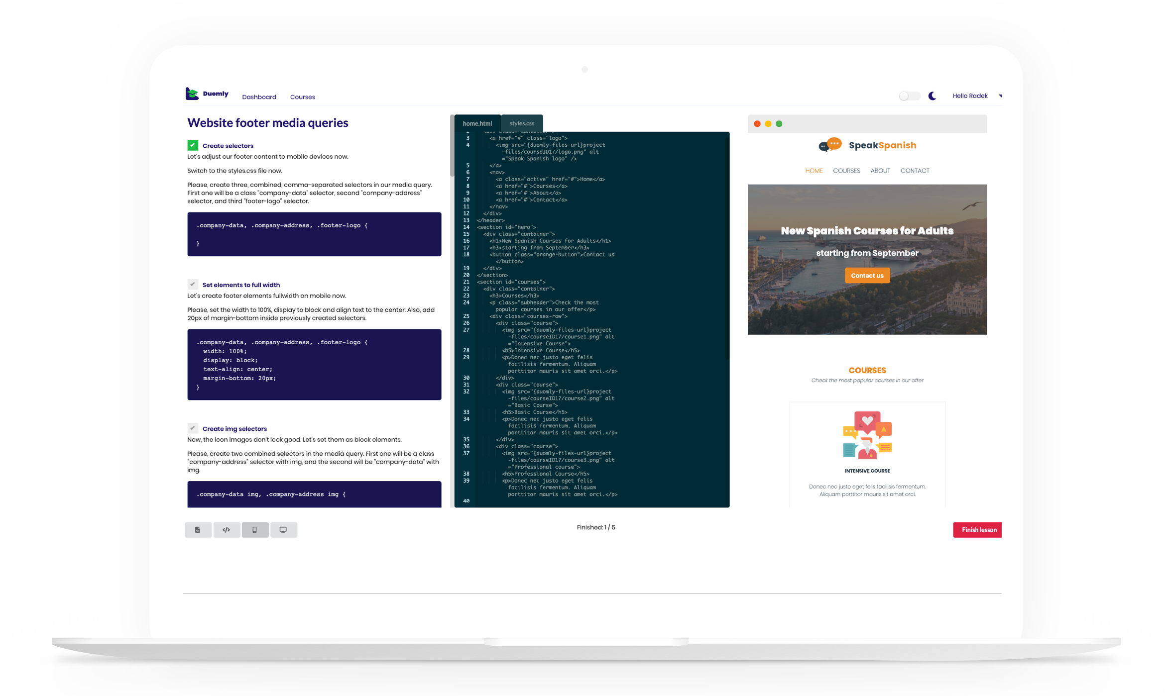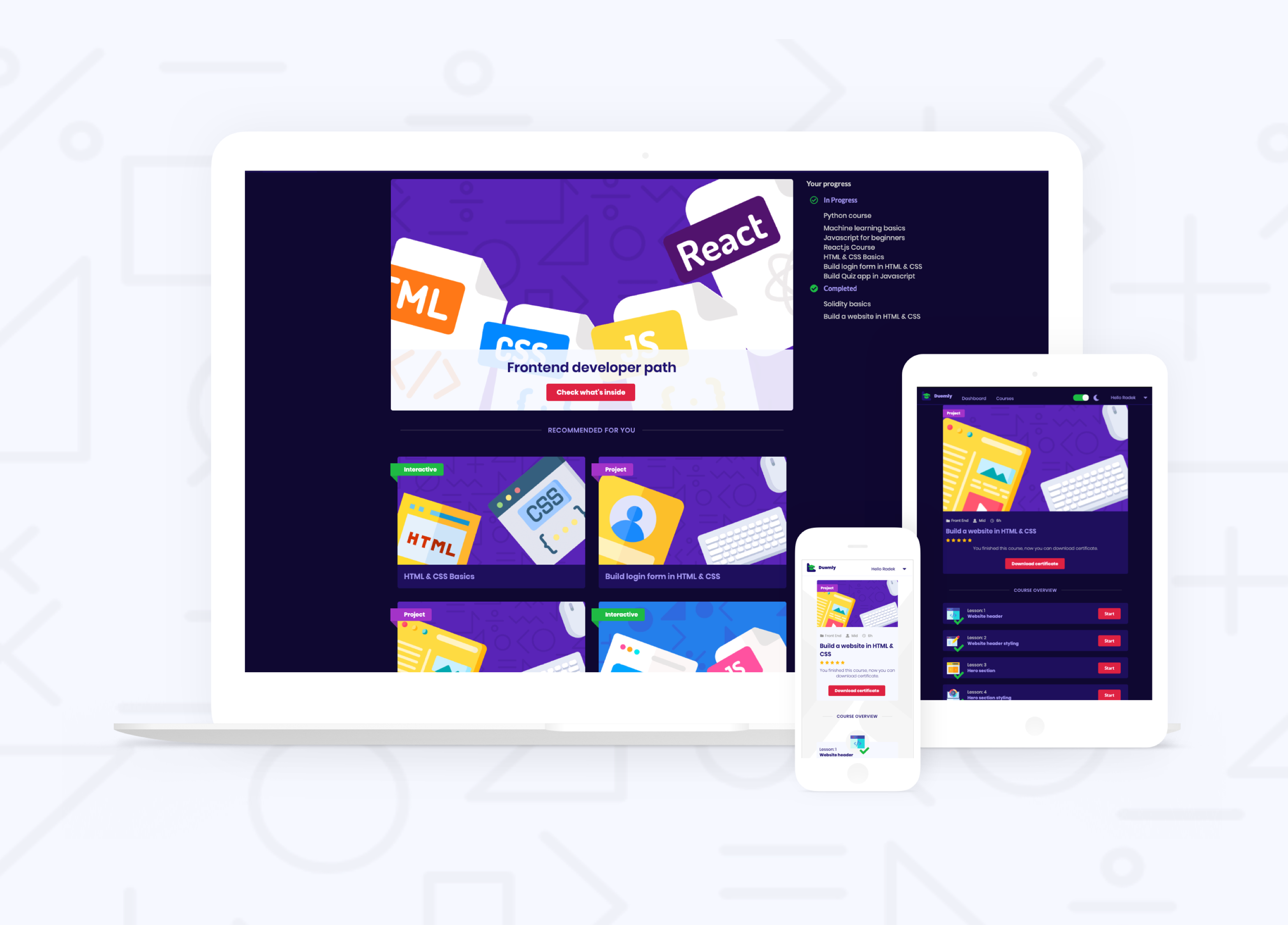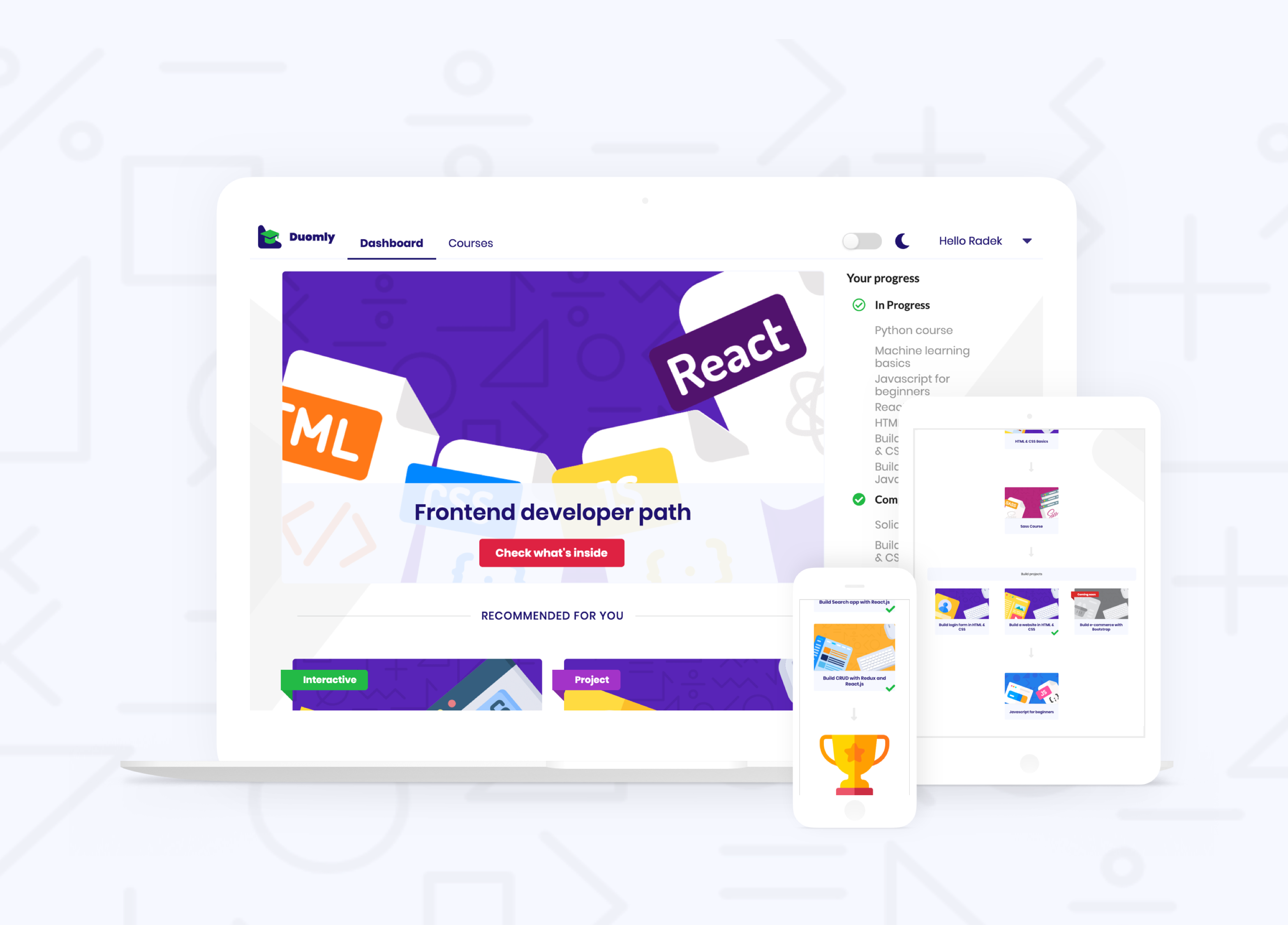 Duomly - let’s learn programming! We believe everybody can learn how to code, that’s why we decided to make the coding accessible. No matter how much time and experience you have, you can join and learn how to create a website or app with different technologies. Learn from interactive theory courses, by doing exciting and fun exercises, and reading interesting information. You also can select practical courses, and build a project, step by step. We want to give you the best experience of learning, that’s why our platform provides a range of useful features combined with great content. Enjoy learning like never before!