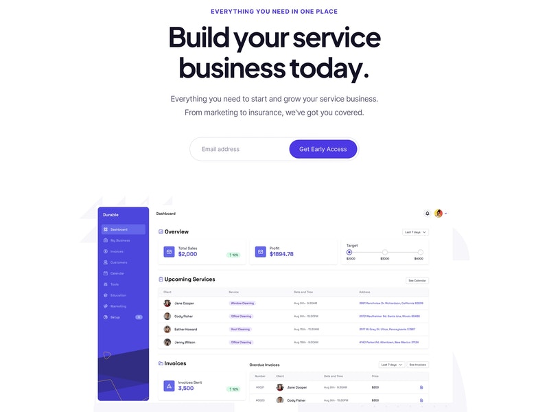 Durable makes it 10x easier to start an independent service business. Instead of duct taping together 12 different software solutions, dealing with legal + regulatory challenges, creating a brand, and getting customers - Durable provides everything you need to start and grow your service business in one place. Our initial markets are cleaning and home care.