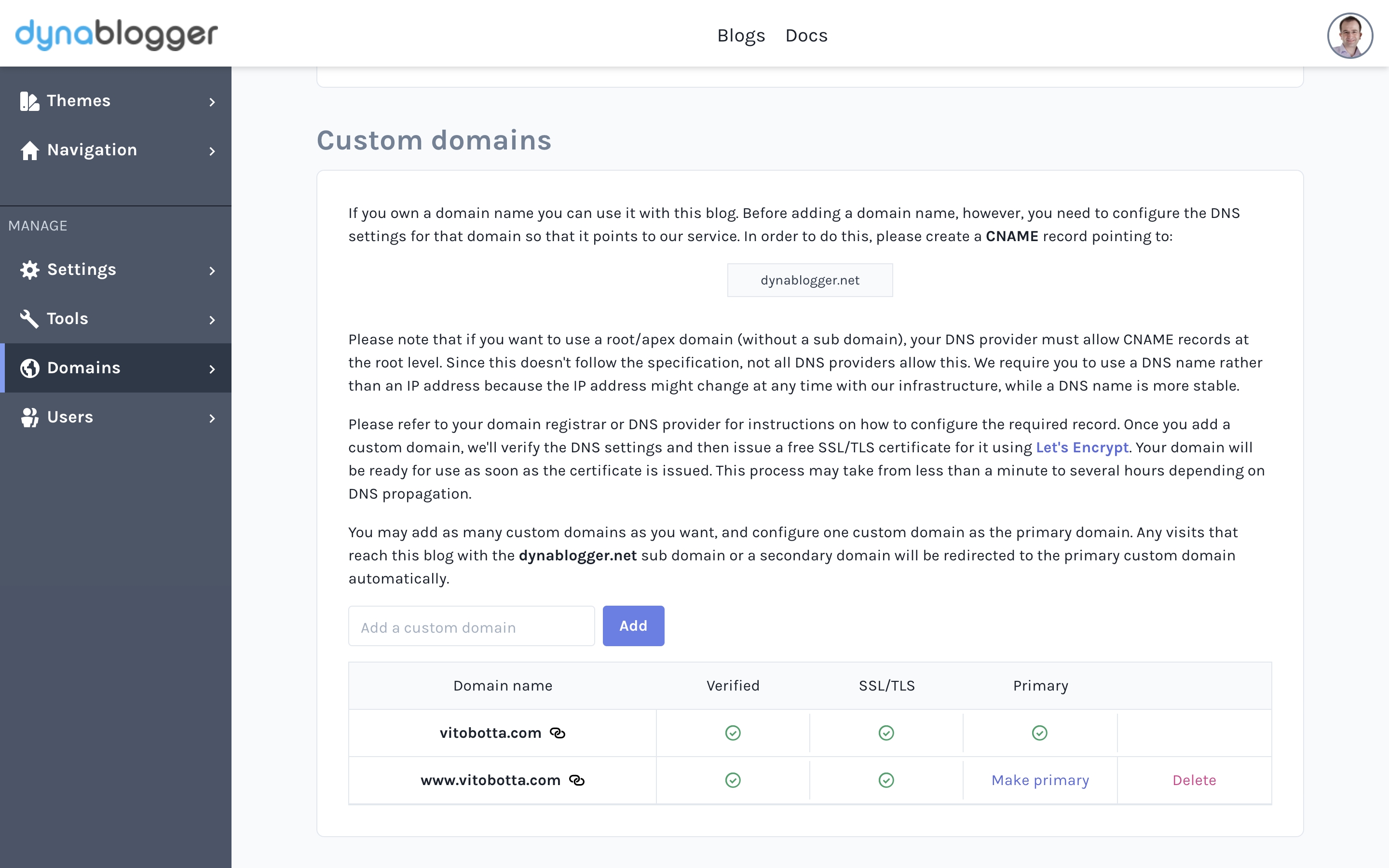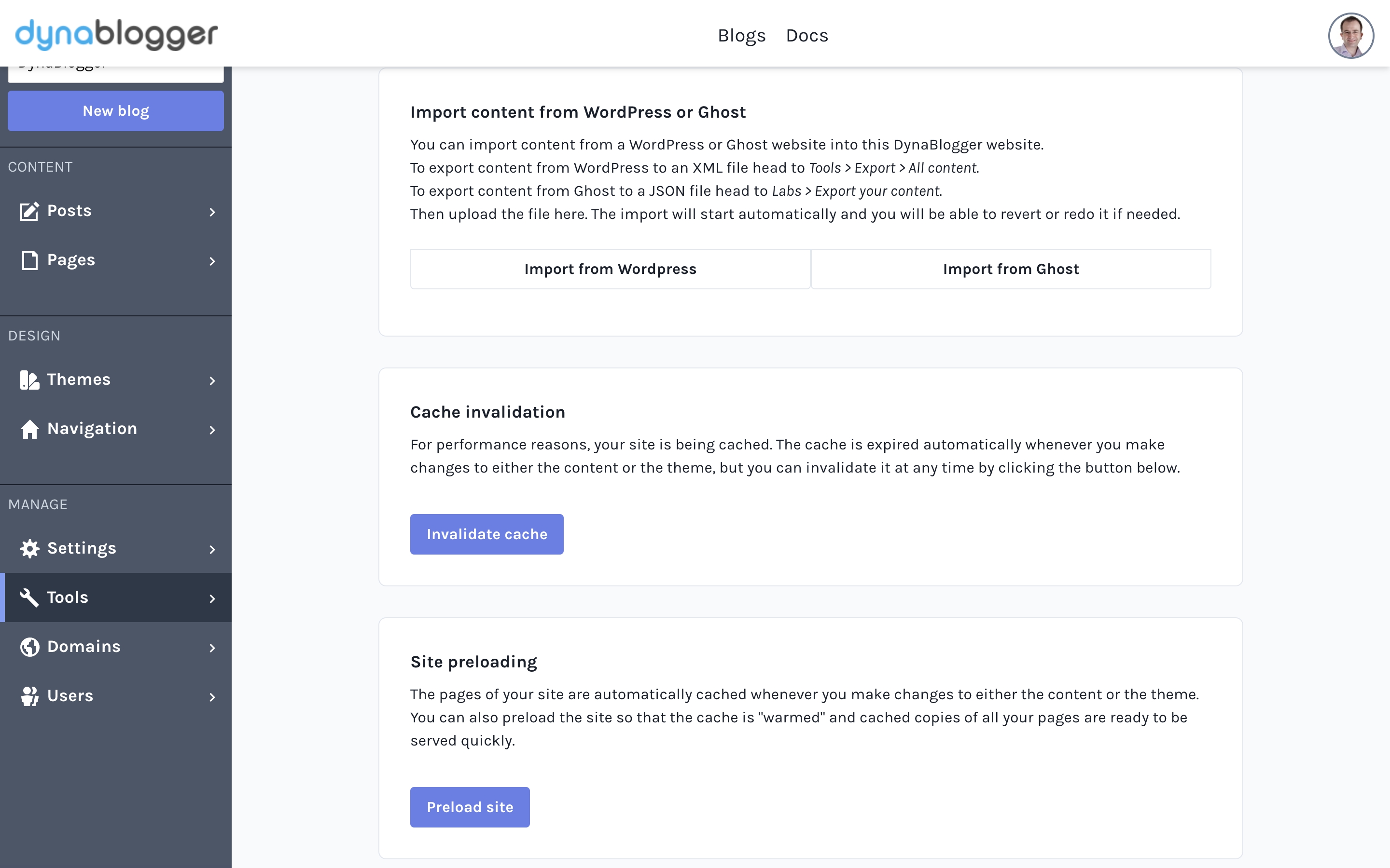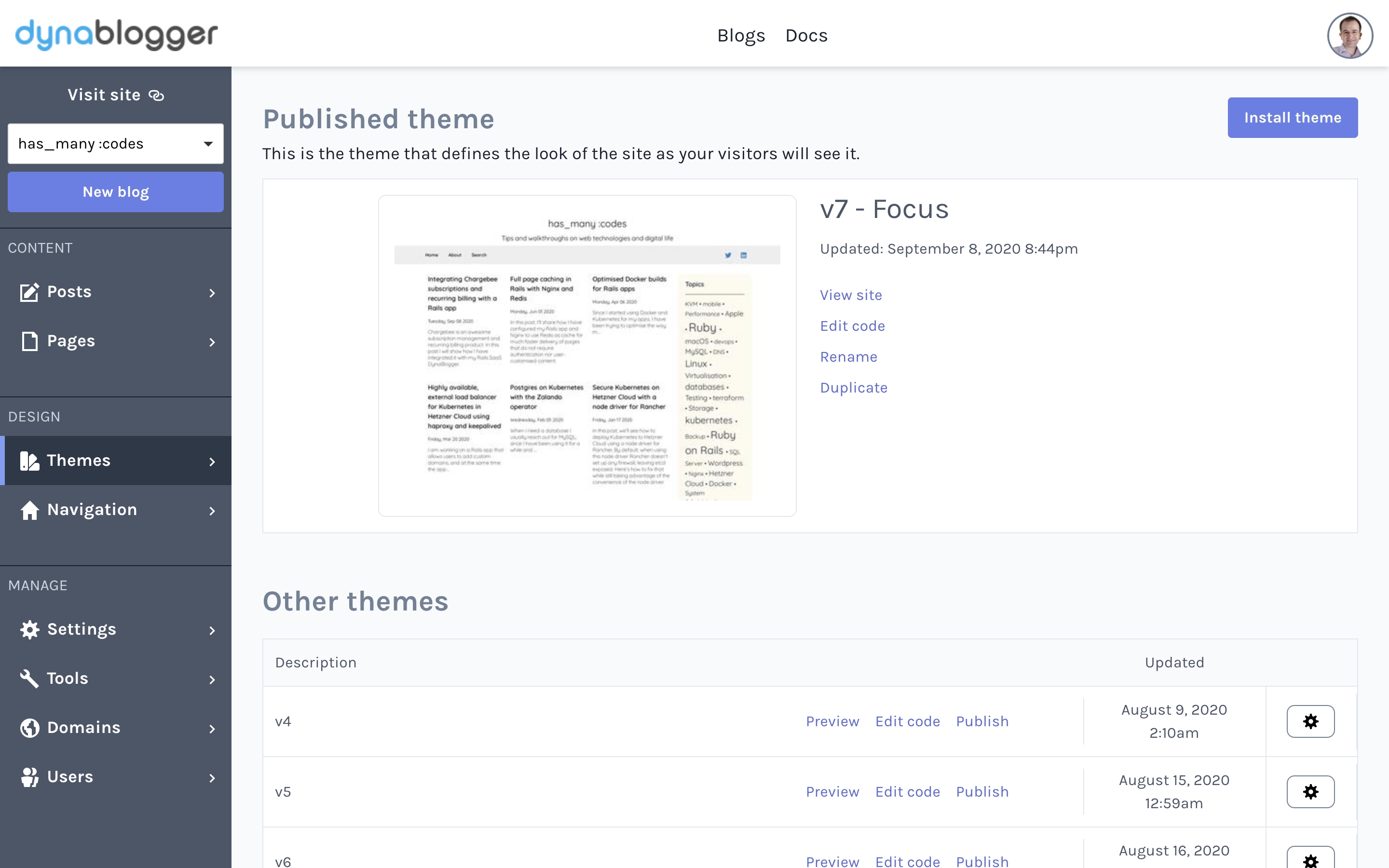 DynaBlogger is a new hosted/managed blogging platform we propose as a simpler alternative to platforms like Wordpress, for people who prefer something less complicated but still with all the features most people need for a great blogging experience. Wordpress is a very powerful CMS but it's often overkill for many people. Plugins make it very flexible but often introduce vulnerabilities or performance issues. DynaBlogger is simpler and to the point, not bloated with features you may never need. Still, it has a powerful rich text editor with several configuration options and it supports themes - you can edit themes directly in the web app and see changes live immediately; custom domains, easy collaboration and more. We believe DynaBlogger can be a great option for blogs and simple sites. You can also import content from Wordpress or Ghost with a couple of clicks for an easy migration. Being a hosted/managed SaaS you don't need to worry about servers, hosting, backups and updates. All of that is taken care of for you so you can focus on publishing great content. There's a free 14 days trial - no credit card required - so trying it is easy. With the coupon code 'EARLYBIRD' you get 50% off for the first three months and if you choose a yearly plan, 2 months are free. Thanks in advance for giving it a try and for any feedback!