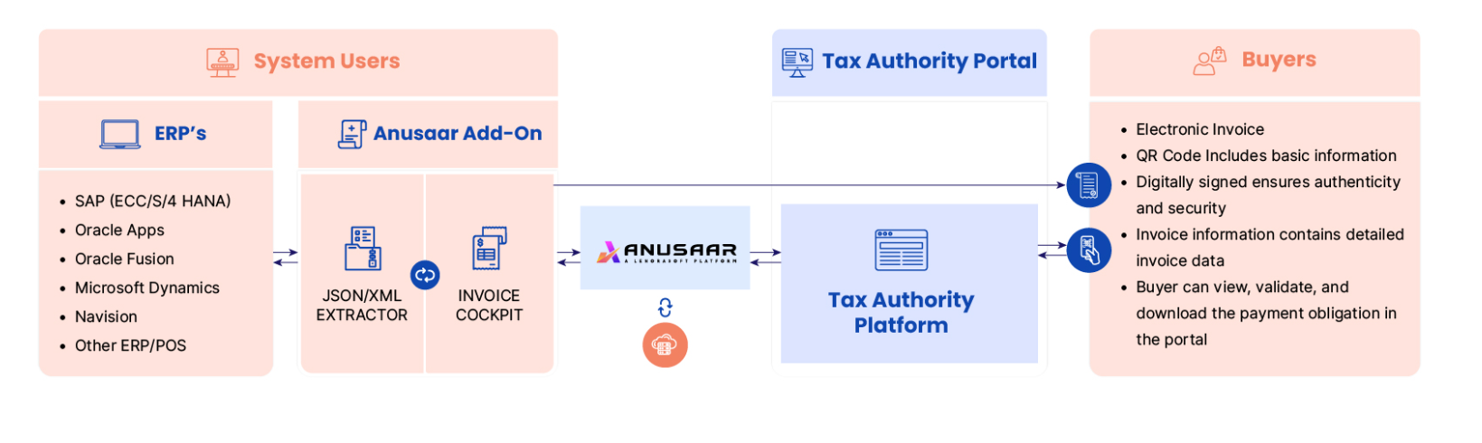 Anusaar is a next-gen AI/ML enabled SaaS-based e-invoicing software that automates financial operations, ensures tax compliance and improving cash flow. Revolutionize e-invoicing with AI—secure, seamless, and compliant. Optimize workflows and automate business document exchange. Anusaar is a next-gen SaaS-based e-invoicing software that automates financial operations and ensures tax compliance. ERP-agnostic and AI-powered, it streamlines workflows, reduces costs, and optimizes processes like AR, AP, and tax filings. With real-time analytics, advanced security, and seamless integration, Anusaar drives accuracy, efficiency, and financial control. Our electronic invoicing system provides robust data extraction, validation, standardization, and secure archival, ensures precise and compliant e-invoicing. Built with enterprise-grade security, it boasts SOC 2 Type 2 and ISO 27001 certifications, delivering peace of mind and trusted compliance.