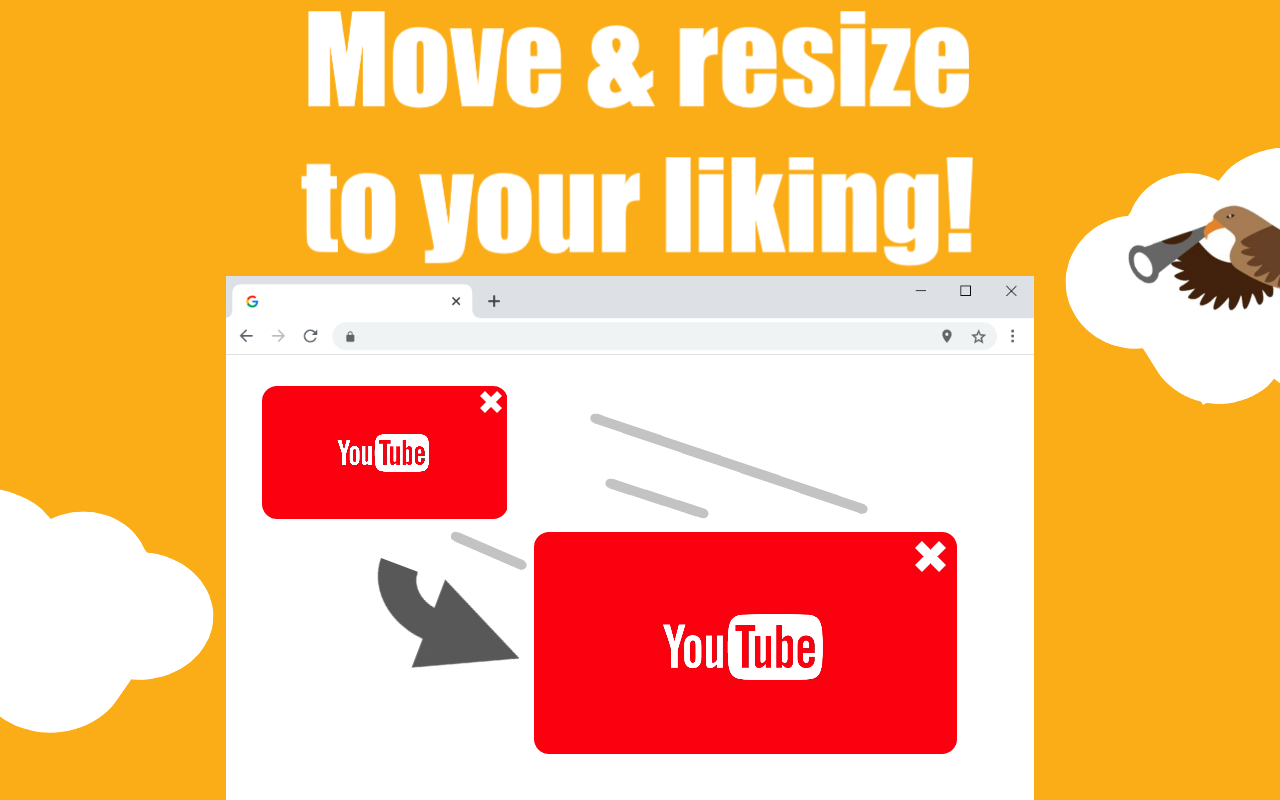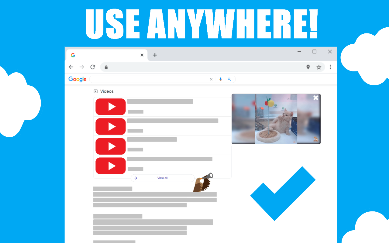 Stop having your flow interrupted by having to open a different tab to watch a YouTube video. Simply hold ALT and click a link to open it in a slick, modern panel and watch it on the side. ===================== FEATURES ===================== ? Keep chatting while watching videos in Messenger. ? Preview YouTube videos in Google without loading YouTube. ? Scroll through social media while watching something on the side. ? Works everywhere, including Discord. ? Move the window around, you can even resize it. ? ALT + click a link to open the winow. ? SHIFT + ALT + click a lint to open the window muted. ? ESC to close ? ALT + / to play and pause the video.