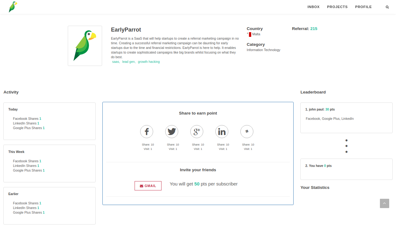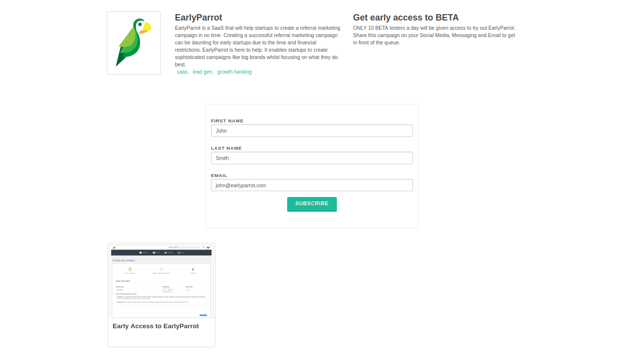 Create a viral referral marketing campaign in under 5 mins. Top reasons to sign up: Easy to create sophisticated campaigns, comparable to those of big brands Become part of our community of startups It’s FREE until you reach a hundred referrals. We count only referrals, not subscribers Integrates with: Facebook, Twitter, LinkedIn, Facebook Messenger, WhatsApp, Telegram, MailChimp, Aweber & ConvertKit Priced for startups No Credit Card required to sign up