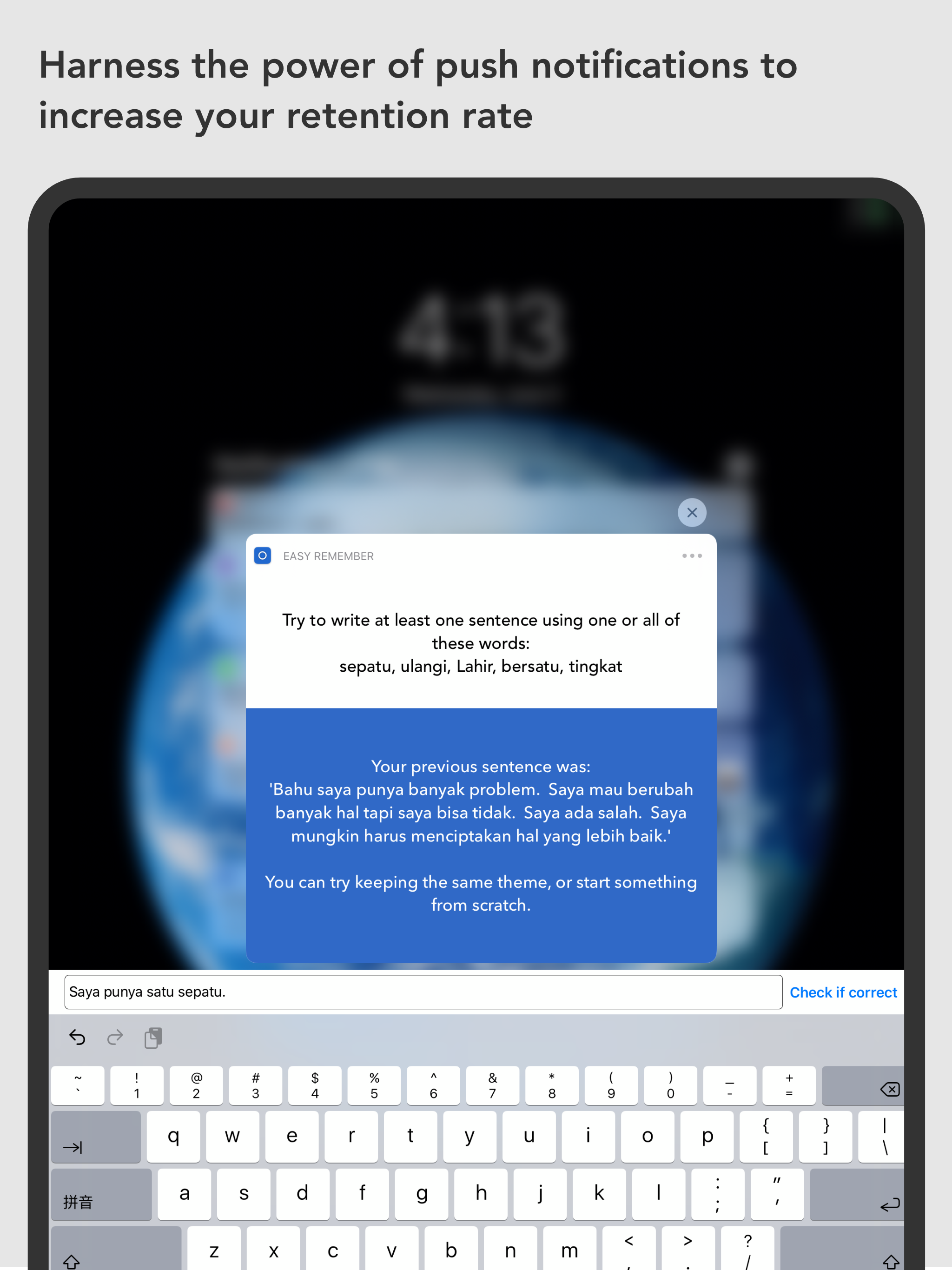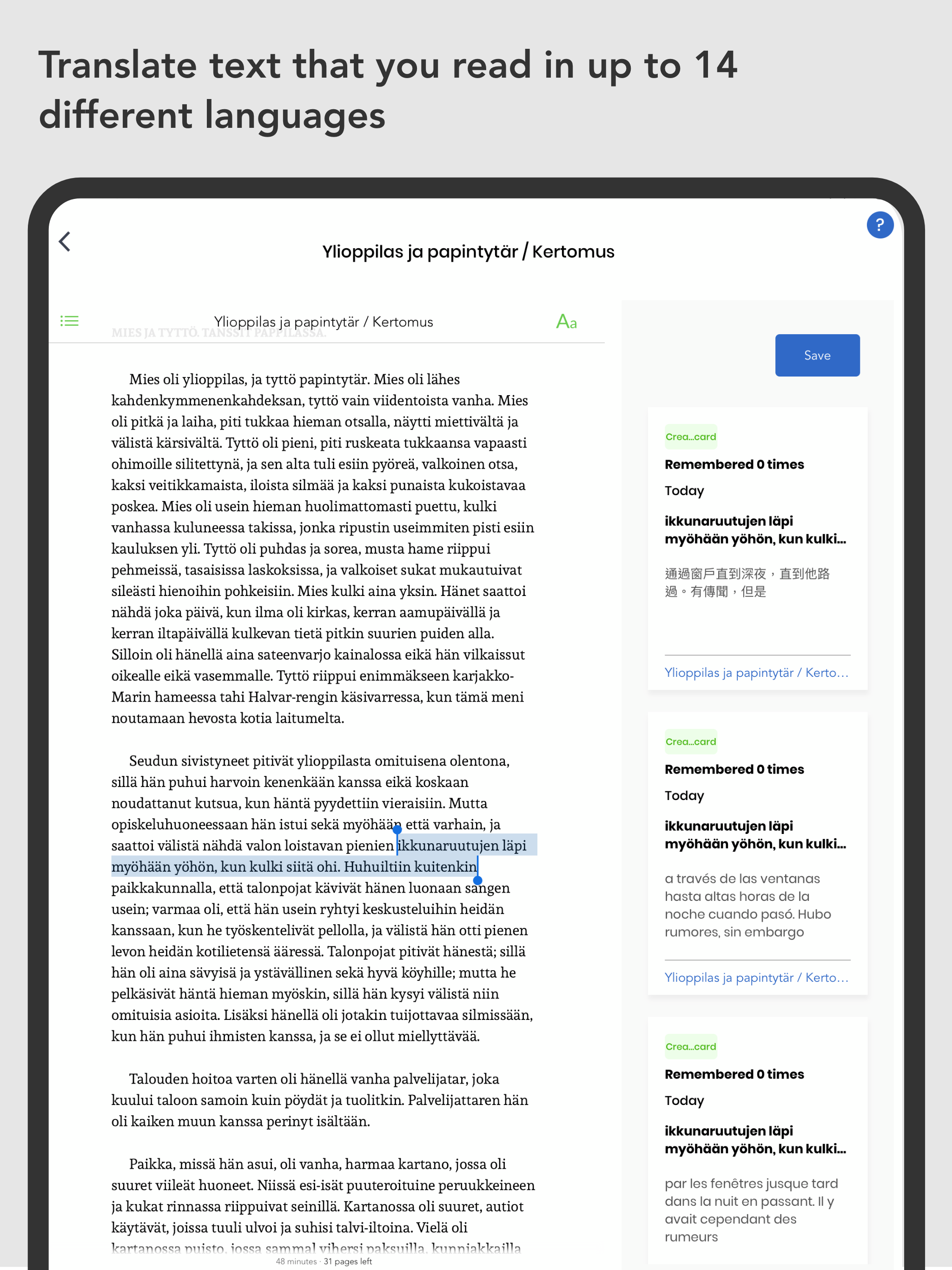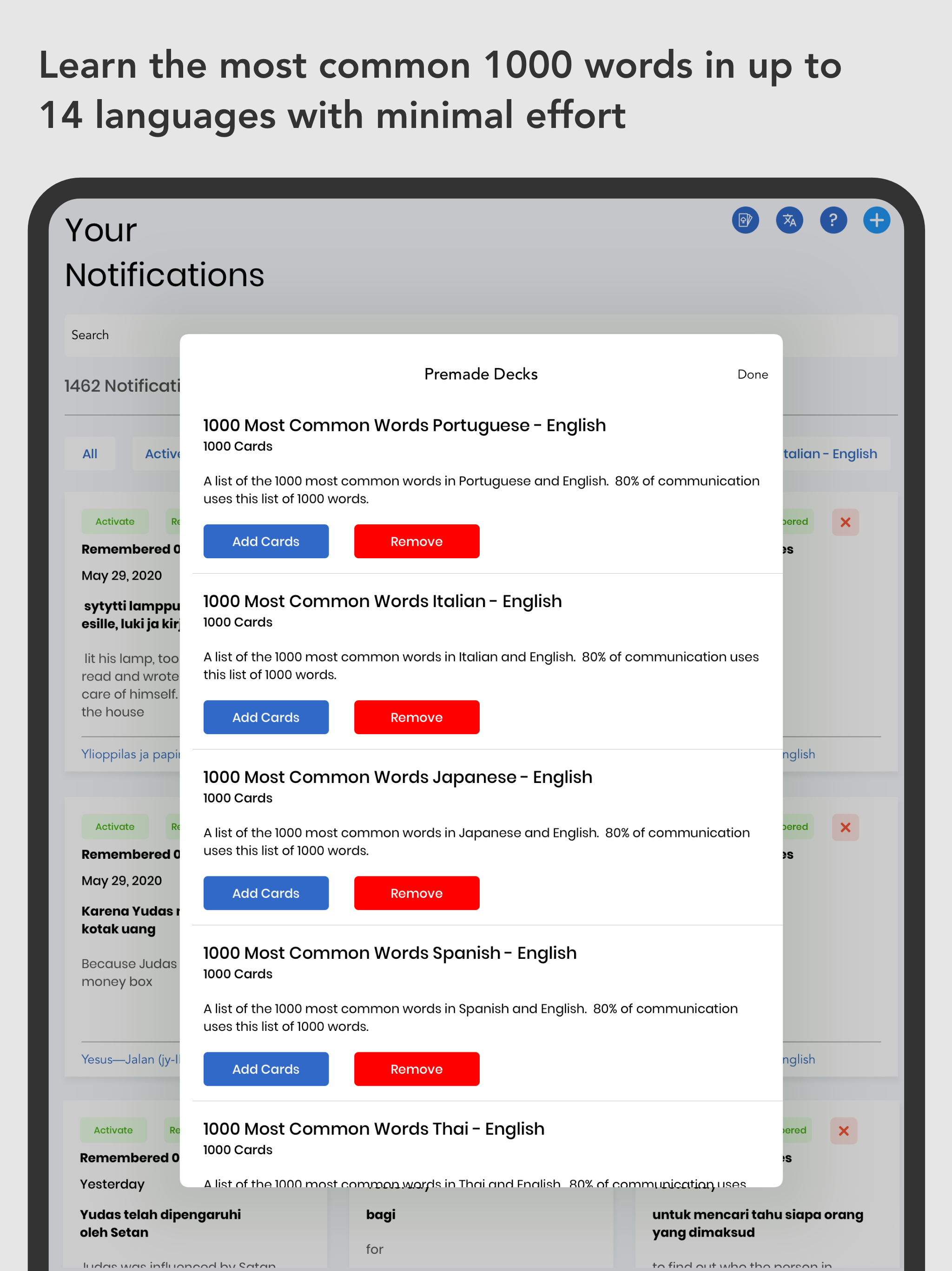 Easy Remember helps you to remember anything that you want in a relaxed and straightforward way. Using Push Notifications, we help you to remember things quickly and with little effort. You can use Easy Remember to: - Learn a language - Study for school or college - Learn a skill - Remember motivational quotes - Increase your knowledge in a subject of interest - and much more. The way you use Easy Remember is entirely up to you. How do we help you to learn things more natural than doing it on your own or using other apps? Every item that you add to Easy Remember, or that you download from a Pre-made deck is sent to you in pieces as Push Notifications. We all are used to receiving Push Notifications from other apps on our phone, and companies use them because Push Notifications grab your attention. Each time you receive a Push Notification from Easy Remember, it will contain the items you want to remember, and you can interact with these Push Notifications, being able to say if you remembered the item or not. There is always a writing portion, where you can, through the Push Notification, write content using the items sent to you, and then check to see if your writing was accurate. This feature is highly useful for learning a new language. These methods increase your retention rate to 95%. What other features make Easy Remember an essential tool for you when learning: • Read eBooks Feature: Import ebooks into the app and quickly translate the text you read into many different languages at the same time or create cards so you can remember important points • Scheduling: Determine how many items you want to have sent to you as Push Notifications at a time. Choose how often you wish to receive Push Notifications. Select the languages that you want to receive translations for. • Pre-made decks: Learn the most frequently used 1000 words of many languages. These 1000 words make up 85-90% of the words you need to be fluent. • Translation Feature: Easily translate anything into many different languages. When reading, the Translation tool is invaluable. Reading is one of the best ways to learn a new language, but it can be difficult because you have to look up words continually. With Easy Remember, you just select the words you want to translate and click Translate. The app will then send you translations in however many languages you desire. You can use this feature to learn more than one language at a time. Final Thoughts: Many have tried to learn a language in school and have left feeling unsatisfied with their language ability. One report says that of those who take a foreign language course: Only 7% can engage in some conversation after high school. Less than 1% can engage in some conversation after college. Those numbers are staggering, are they not? Why is this? It's easy to use repetition for 1 or 2 weeks. But to learn anything of value takes longer than that. Learning is emotionally taxing when you sit down for long periods to study. And continuous short sessions are hard to keep up with. Somewhere between 81% and 92% of New Year's Resolutions fail. Why? Because habits are tough to build. With Easy Remember, you don't have to worry about building a habit yourself, because the app does it for you. The app will send you notifications containing the items you want to remember frequently throughout the day. So with as little as looking at the notification, over time, you will remember each notification that you create. Because of the way that Easy Remember works, you will no longer need to have long study sessions. The app sends notifications to you frequently, and through the continued viewing and interacting with the notifications, you will retain the information you want with minimal effort. So download the Easy Remember right now, and start learning everything!