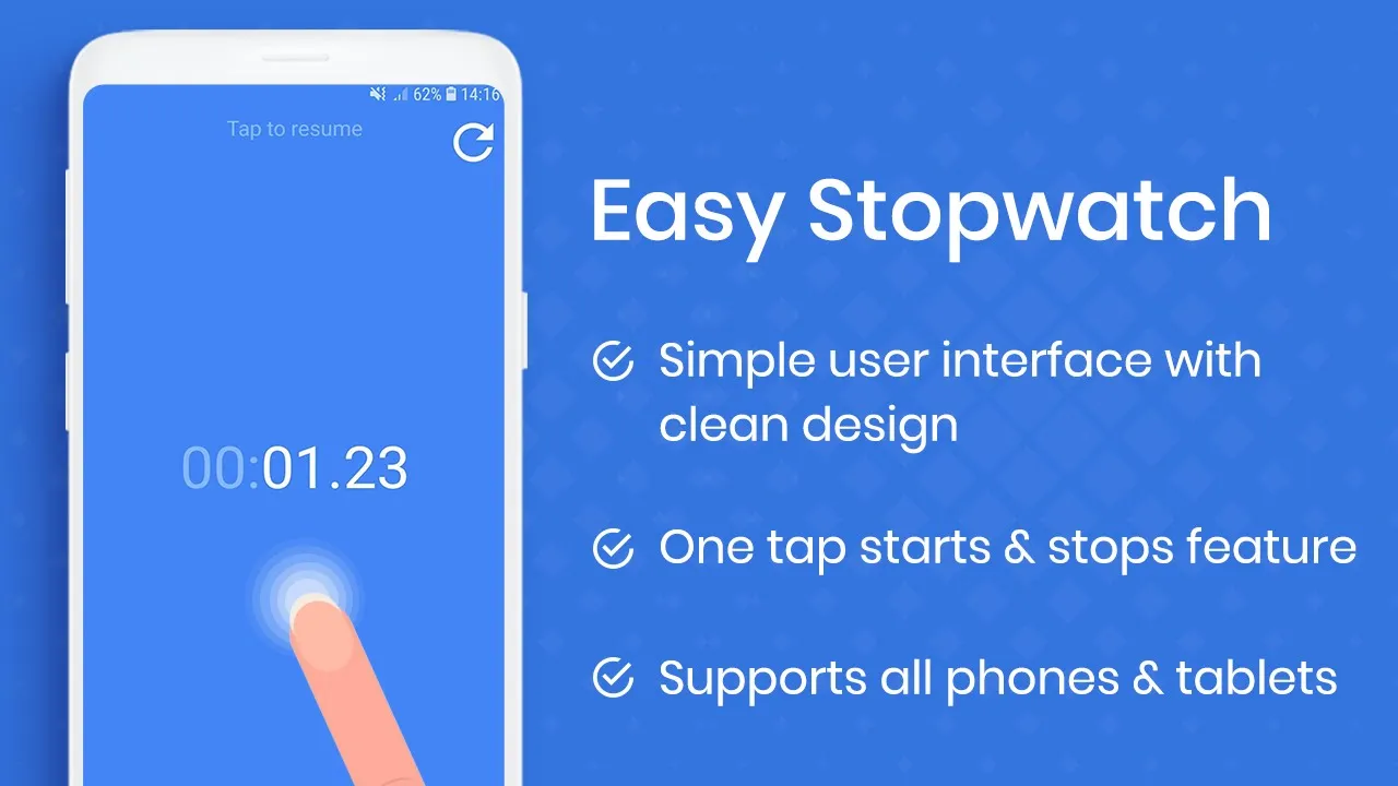 The most amazing Free Easy Stopwatch Application on an android platform which is very simple with great user experience. This is a totally Free Stopwatch. This Stopwatch app also is known as Timer Stopwatch, Digital Stopwatch, and Hybrid Stopwatch. Easy Stopwatch is easy to use and has a very accurate and responsive reading. Our app is useful for students taking practical, sports, cooking, running, study, gym workout, home workout, meditation, gaming, and your all needs which are related to timing needs. The app starts reading with just one tap on the mobile screen and the timer can be stopped by just one tap click on the screen which makes every reading of the Stopwatch 100% accurate. Easy Stopwatch Best Features: - Simple user interface with clean design. - Free Stopwatch with minimum ads. - One tap starts and stops feature. - Easily reset the Stopwatch Timer. - 99 hours timer stopwatch. - Large Fonts. - Counting continues even when your device screen is off. - Supports all phone and tablet types. - 0% Battery consuming. - Stopwatch Fun is for all ages. - Play Easy Stopwatch to meet special. Easy Stopwatch is the most awesome and entertaining free Stopwatch with the best easy one-tap start timer and one tap stop timer feature.
